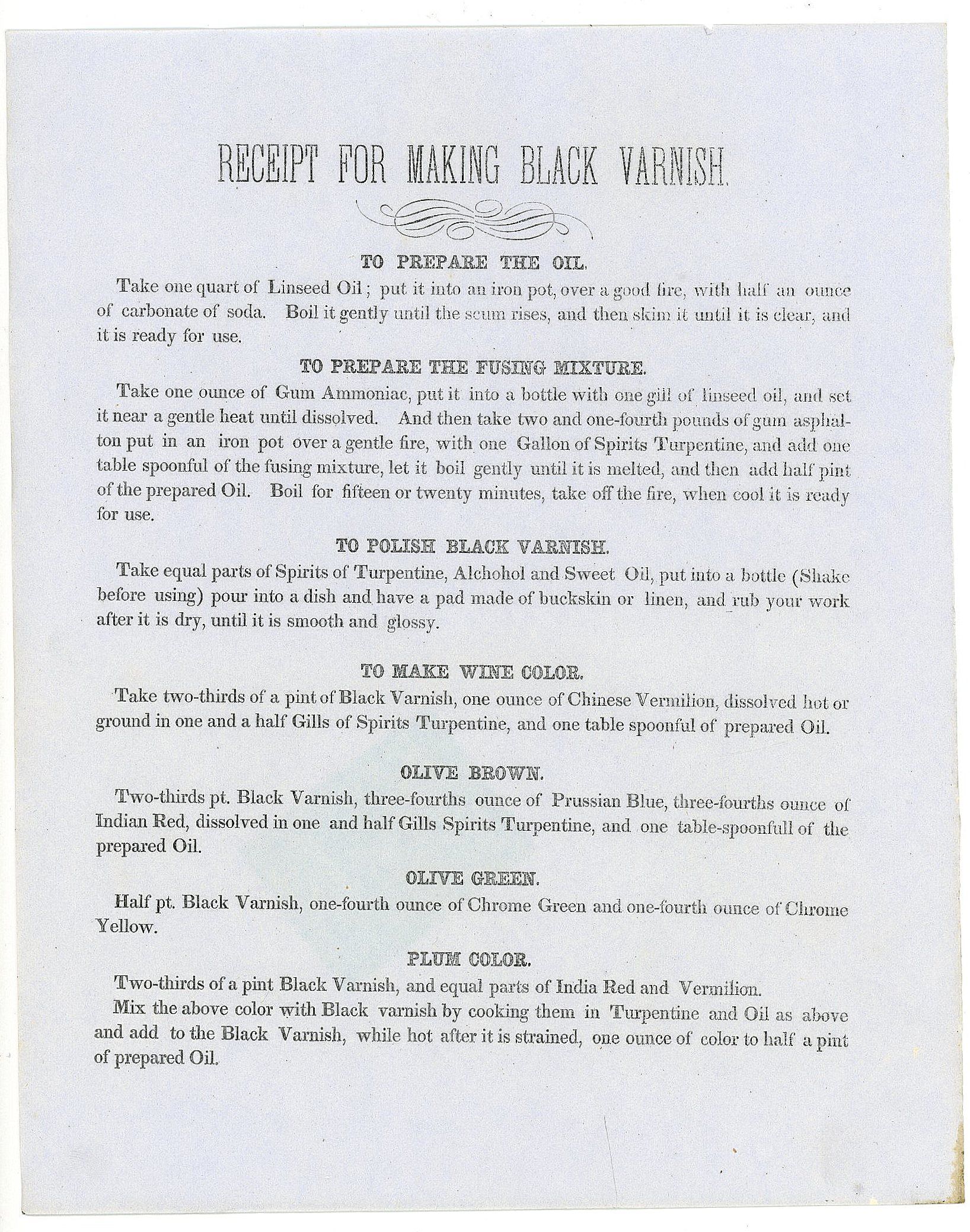 A printed page, perhaps prepared by a merchant for use by clients. It includes information on preparing the oil, preparing the fusing mixture and combining the mixture to us to polish. Also instructions on making wine, olive brown, olive and plum colored varnishes. Reverse is blank. Measures 10" x 8