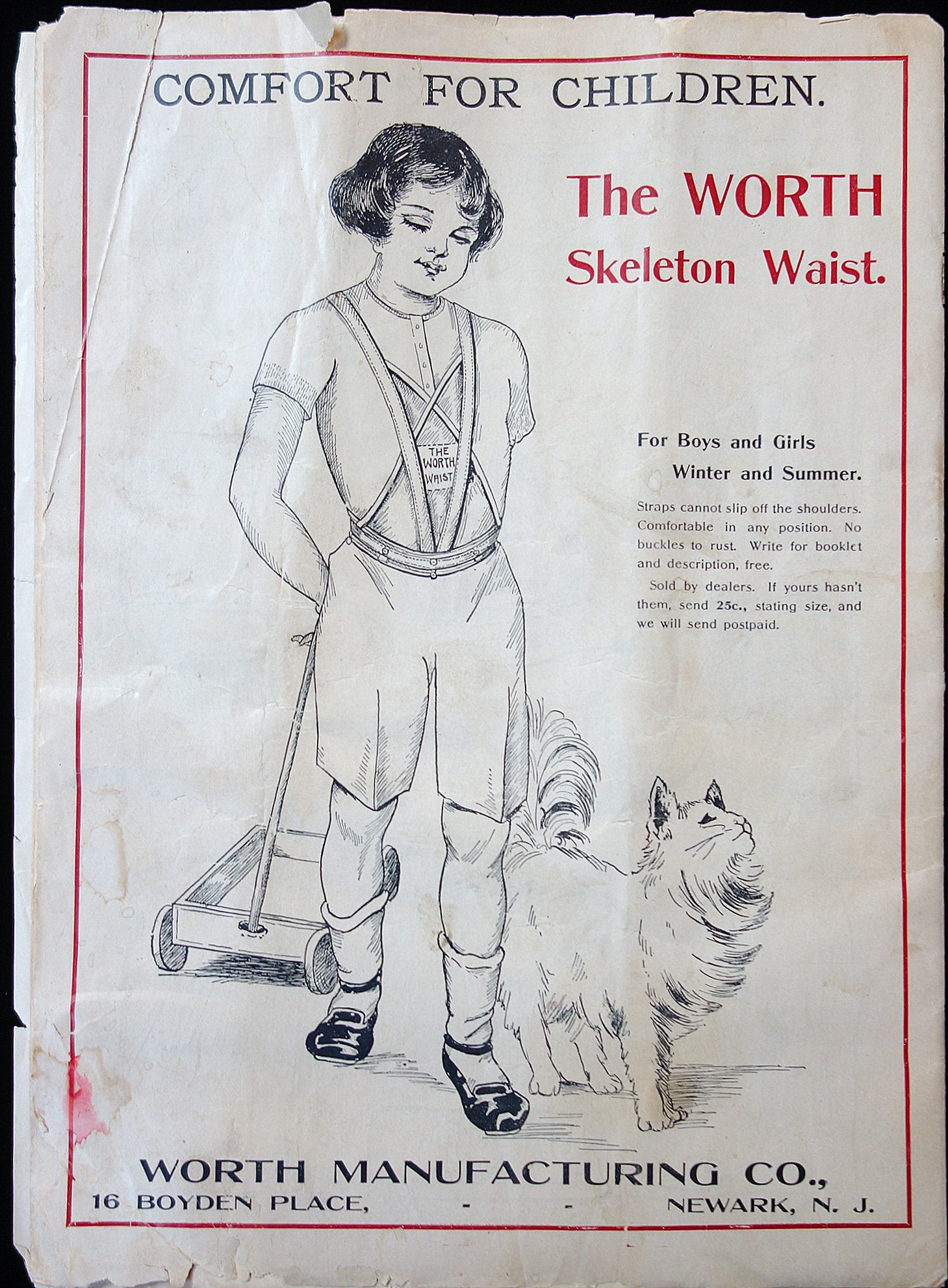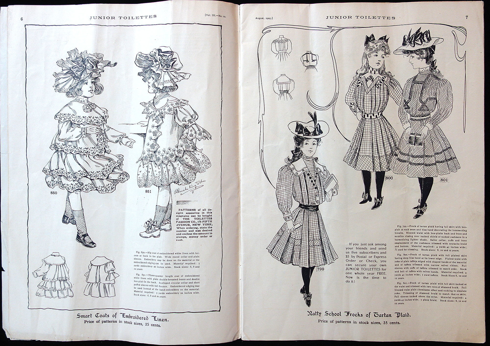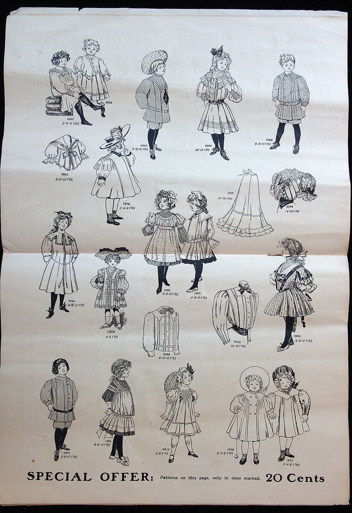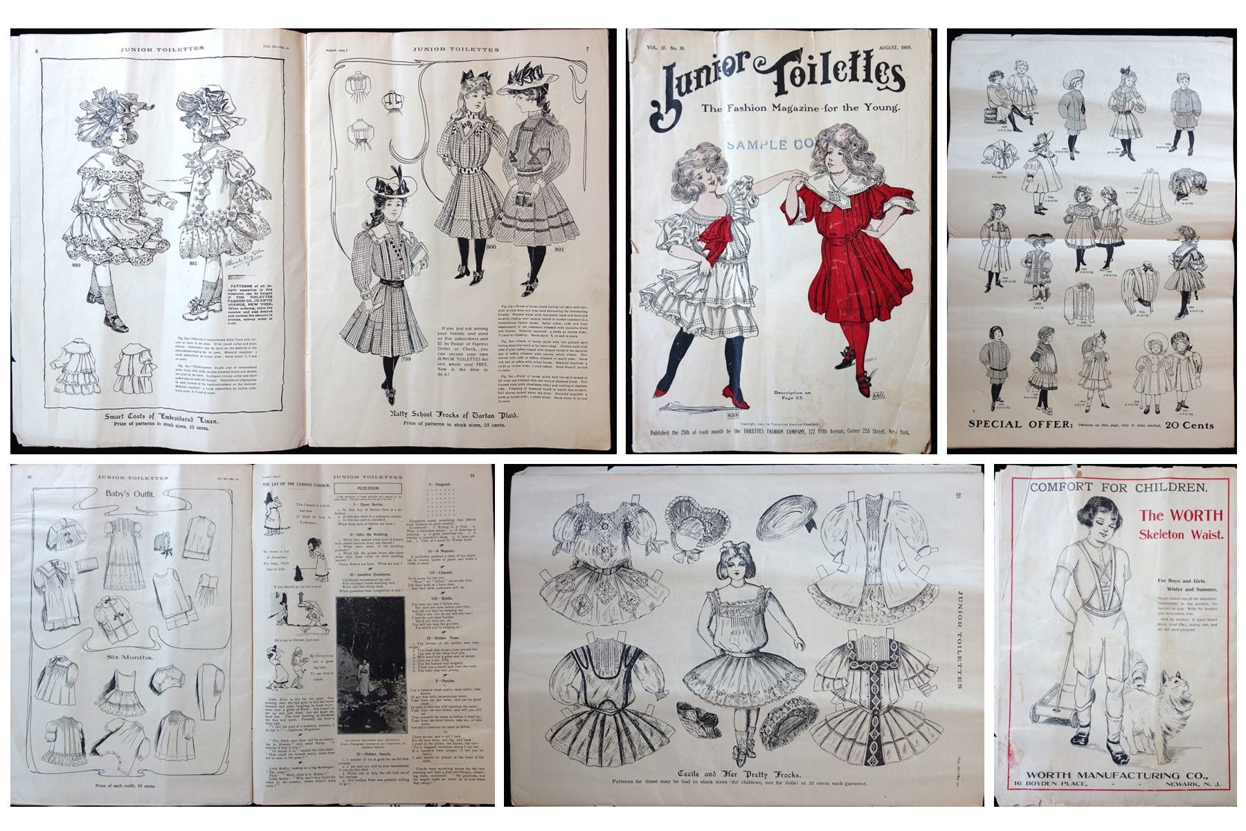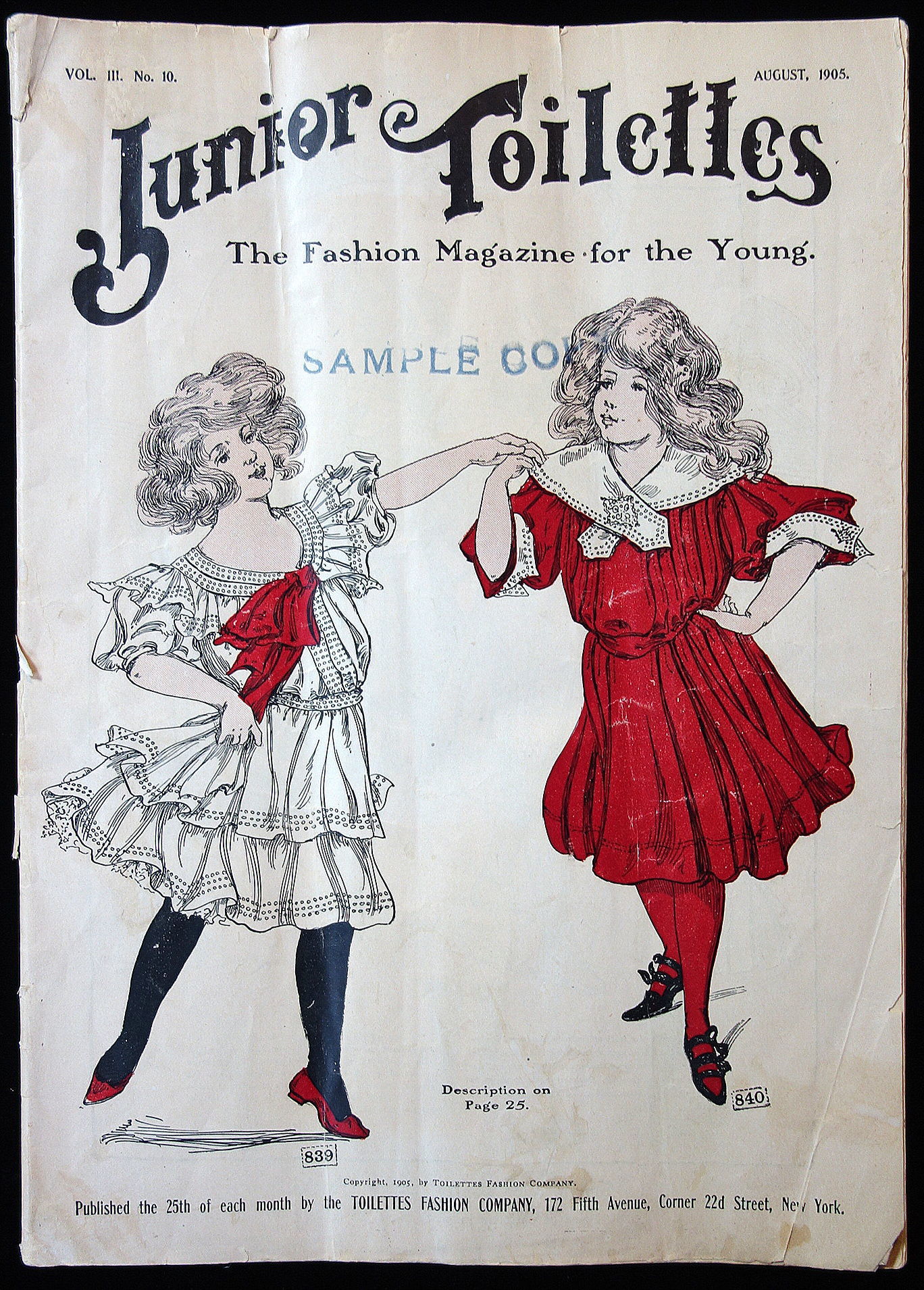 New York: Toilettes Fashion Company, Aug-05. 34 pp with current fashions for the younger set. Each page incldues various costumes include back views and pattern numbers. Also includes Fashion Hints - Helps for Buy Mothers, A Pretty Improved Girdle, Mothers Corner, Children's Sweaters, a paper doll page with Cecile and Her Pretty Frocks, The Children's Hour, Baby Outfits' Puzzledom and much more. Cack cover promotes The Worth Skeleton Waist. Printed in black and white with red accents on cover. Measures 11 1/4" x 8" Covers separated from text block.