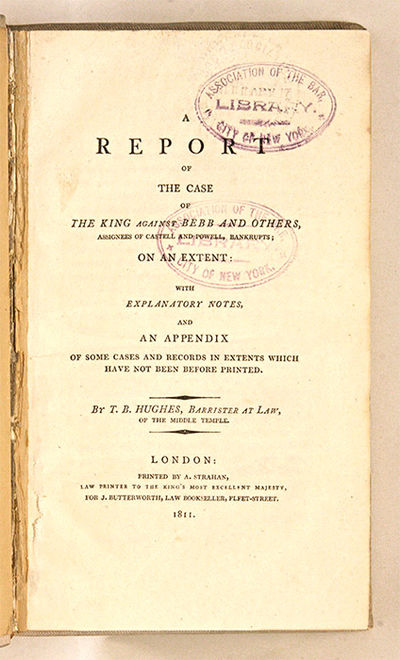1811. A Notable Study of Tax Indebtedness [Trial]. Hughes, T.B. A Report of the Case of the King Against Bebb and Others. Assignees of Castell and Powell, Bankrupts; On an Extent: With Explanatory Notes and an Appendix of Some Cases and Records in Extents Which Have Not Been Before Printed. London: Printed by A. Strahan, 1811. iv, 244 pp. Half-title lacking. Octavo (8" x 5"). Later library cloth, red and black calf lettering pieces to spine, small shelf label to foot. Light soiling, moderate rubbing to extremities, corners bumped and lightly worn, front hinge cracked, front free endpaper lacking. Moderate toning to text, faint stains to foot of pp. 176-177, two library inkstamps and embossed stamp to title page, annotations to verso. $250. * Only edition. Abolished in 1947, a writ of extent was a remedy employed by the crown to recover unpaid taxes from a debtor or bankrupt. This book, a combination of treatise and report, examines the nature of these writs through a scholarly account, with notes and a historical appendix, of the important Exchequer case of John Bebb and others, assignees of the bankrupt London banking house of Castell and Powell. Bebb and others, assignees of Castell and Powell, were countersued by the government for the right to assets that would cover payment of bills of exchange drawn by a Newcastle bank against tax-collection funds they were holding on deposit. The drafts had been accepted by the now bankrupt Castell and Powell, who had turned them over to the commissioners of excise as collateral for the Newcastle tax deposits, payable in thirty days. At issue was the right of the Crown to sue a debtor (Castell and Powell) of a tax-owing debtor (the Newcastle bank). Sweet & Maxwell, A Legal Bibliography of the British Commonwealth 2:175.