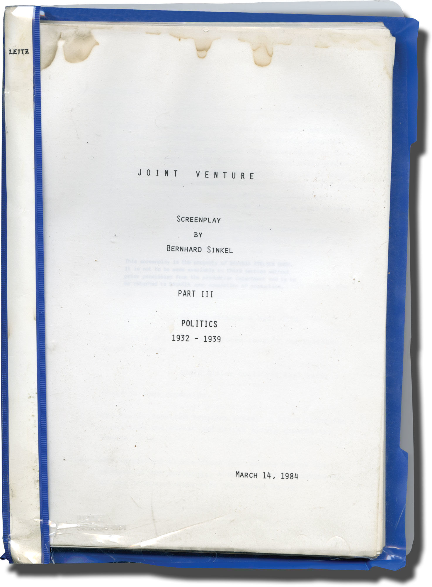 Munich: Bavaria Atelier, 1984. Draft script for Season 1, Episode 3 of the 1986 series titled here under the working title "Joint Venture: Part III: Politics- 1932-1939."