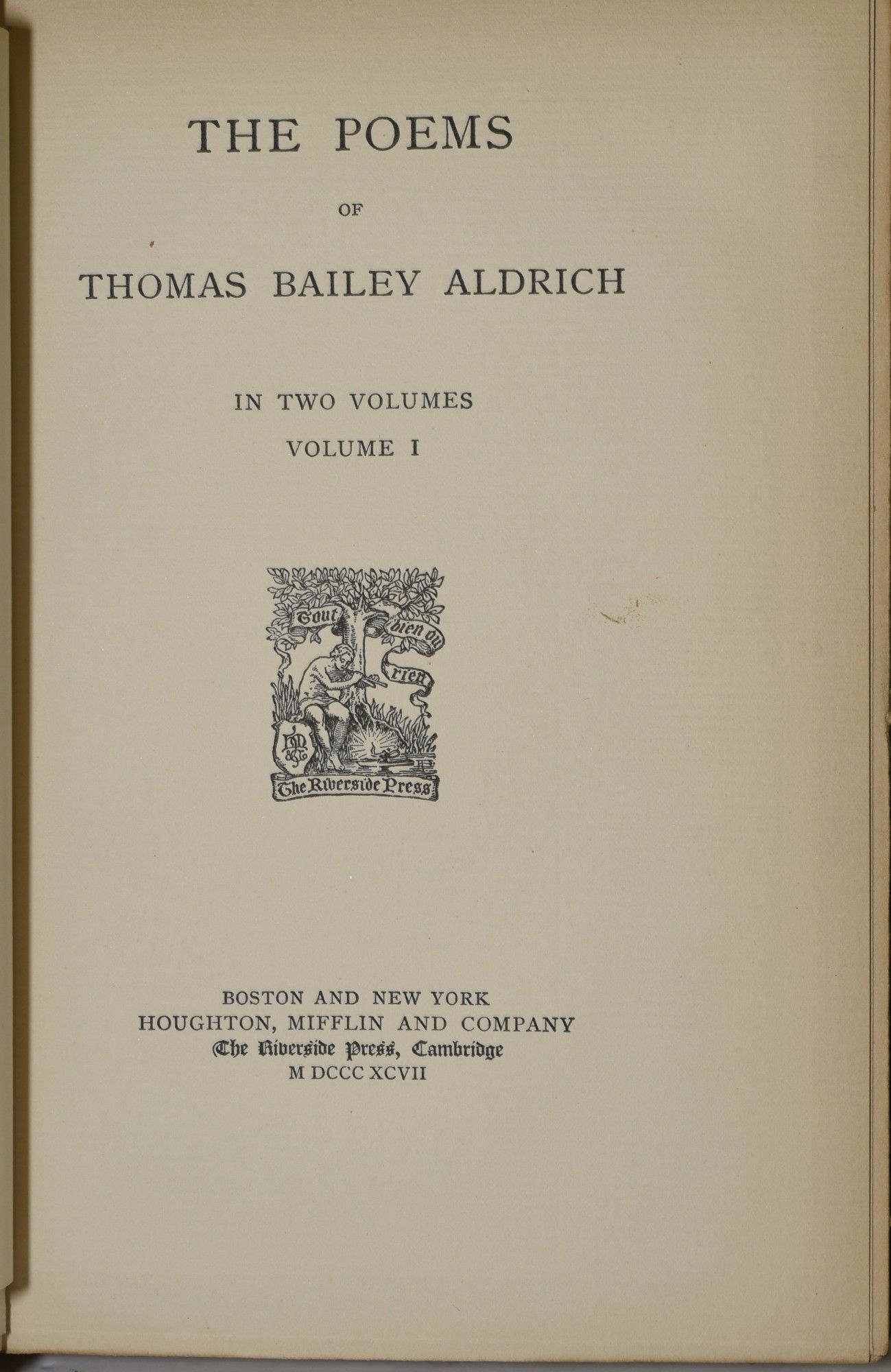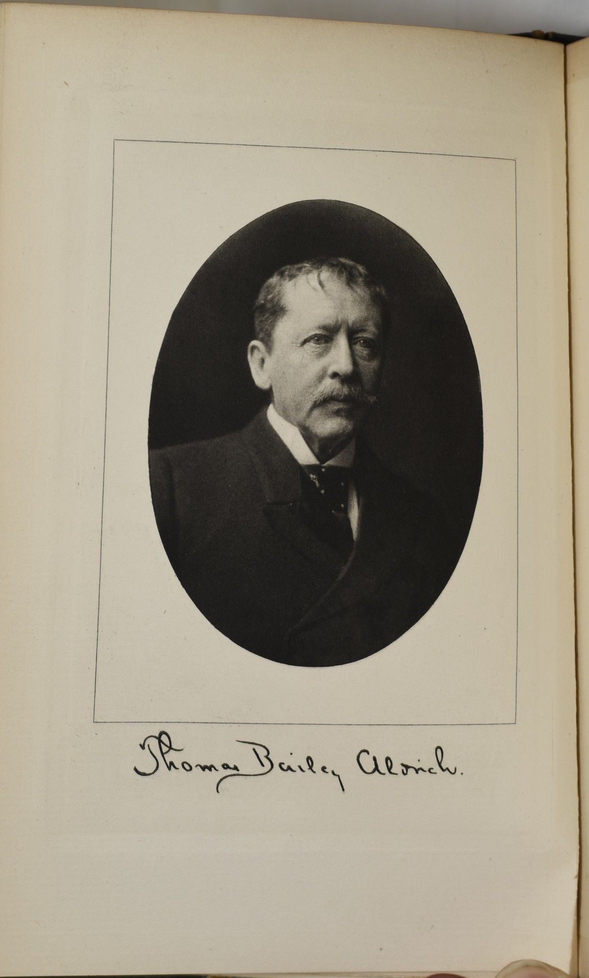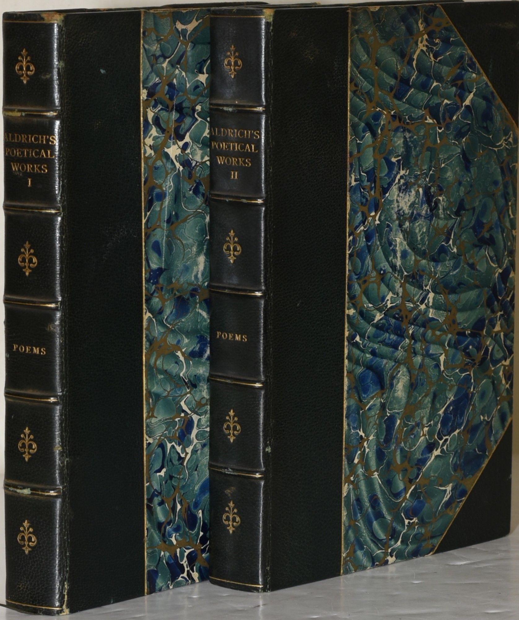 Boston and New York | Cambridge: Houghton, Mifflin and Company | The Riverside Press, 1897. Half Leather. Very Good binding. Thomas Bailey Aldrich's Poems, complete in two volumes. From the larger eight volume set of the writings of Aldrich's Writings. Portrait frontispiece. Previous owner's name and blindstamp on the first flyleaf. A clean copy, with no other marks of any kind. Minor wear to the binding. Half green morocco over marbled paper boards. Raised bands, with lettering and devices in compartments. Top edges gilt. (BAL I 379). Very Good binding.