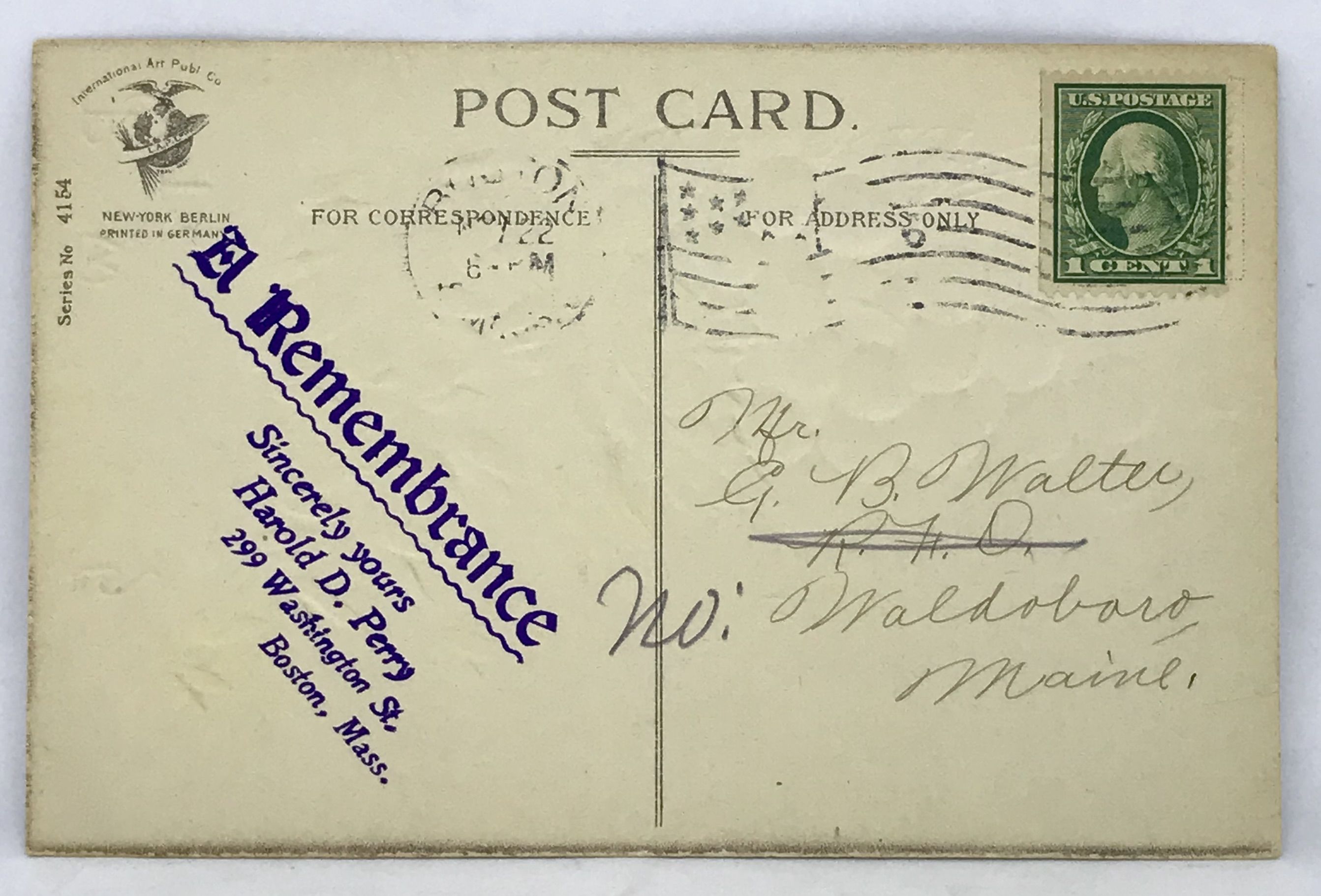 c. 1910. Cards. Color illustrated postcard. Very good. 13.5 x 9 cm. Festive color illustrated and embossed vintage postcard, Harvest theme with grapes and wheat. Postmarked Boston, MA, date obscured, one cent stamp. Ink Stamp: "A Remembrance, Sincerely yours, Harold D. Perry, 299 Washington St., Boston, Mass."