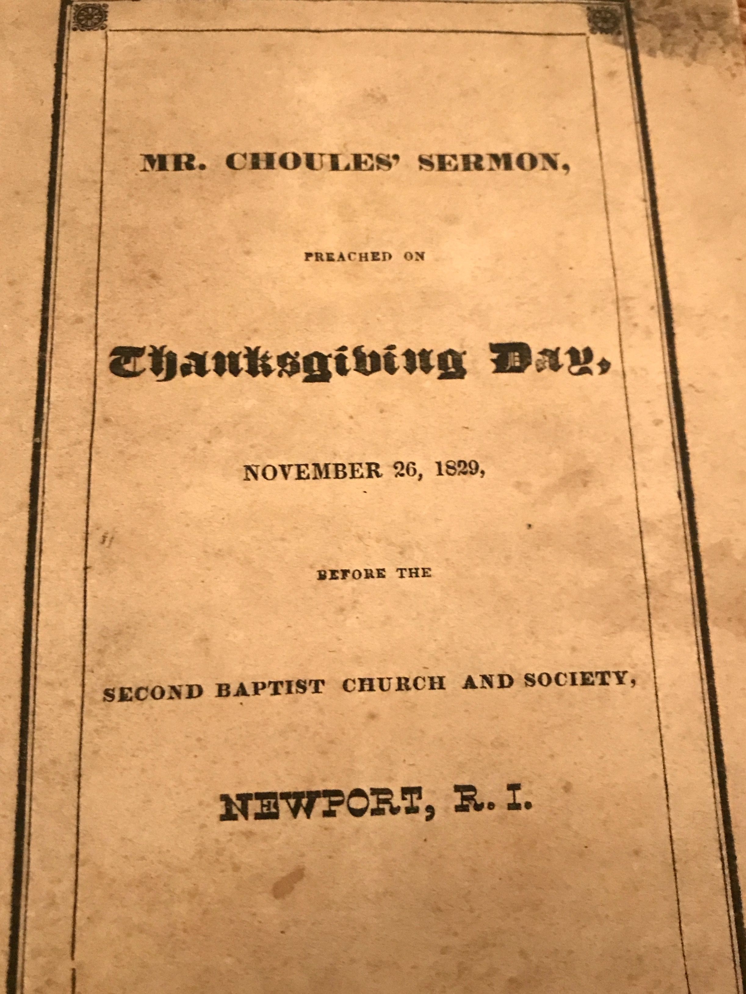 Providence, RI: H.H. Brown, 1830. Wraps. Cream wraps. Very good. 27 pages. 22 x 13.5 cm. Historical narration of the Second Baptist Church, by Reverend John O. Choules, in Newport, at the Second Baptist Church beginning with the secession from Dr. Clark's church in Providence 1656 to 1829. In December 1829, the church Deacons voted to thank Reverend Choules and request a copy for press, of the sermon, preached on Thanksgiving day. Discernible fold at center, covers stained, interior foxed. Closed tear to head and tail of spine, holding well with string binding intact. 4 to 5 corners folded 1 to 2 cm., not affecting text.