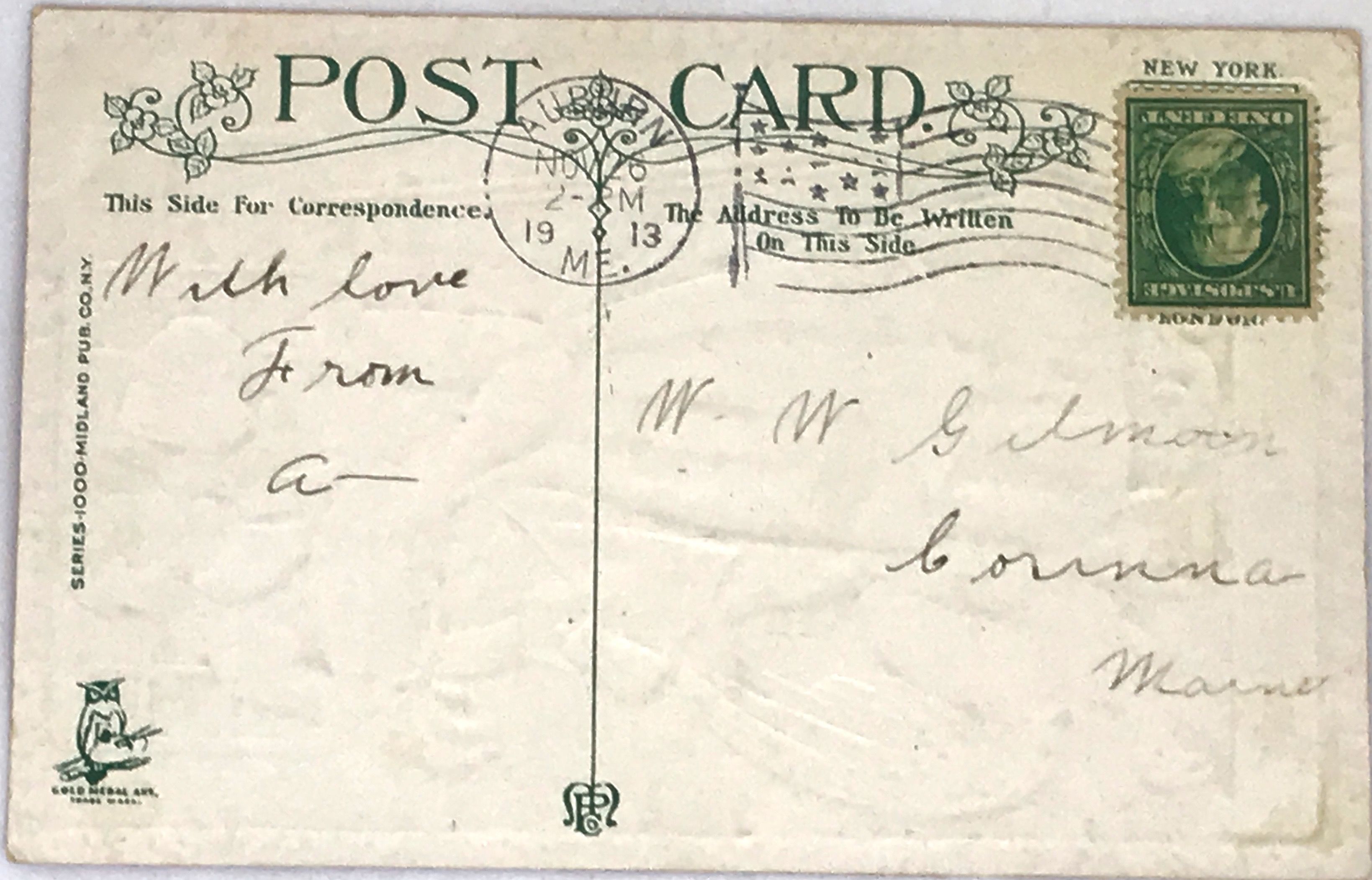 1913. Cards. Color illustrated postcard. Very good. 14 x 9 cm. Festive color illustrated and embossed vintage postcard. Pilgrim couple with pie, turkey and gun. Postmarked Auburn, ME Nov. 26, 1913, one cent stamp, "With love From A-", to Corinna, Maine.