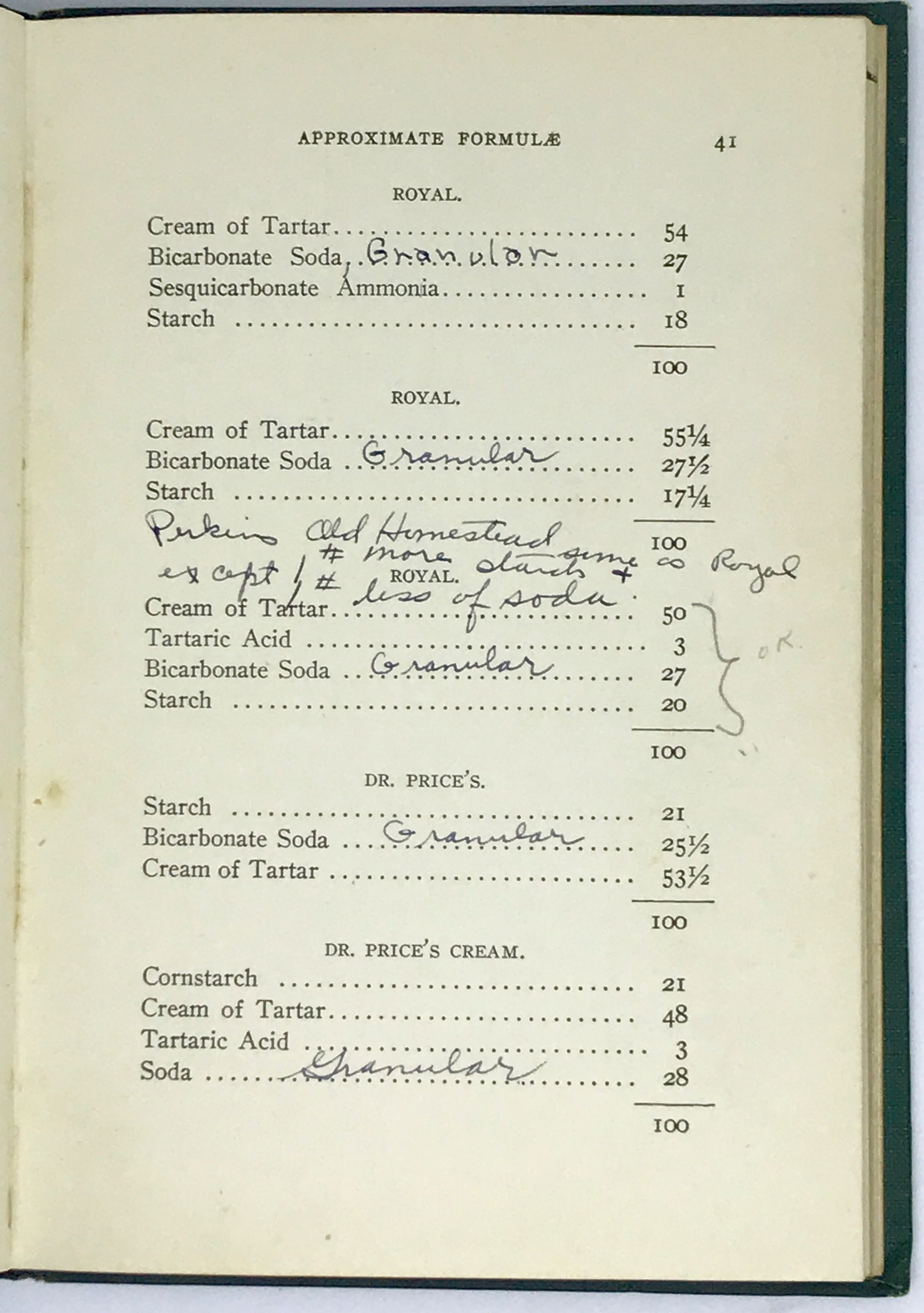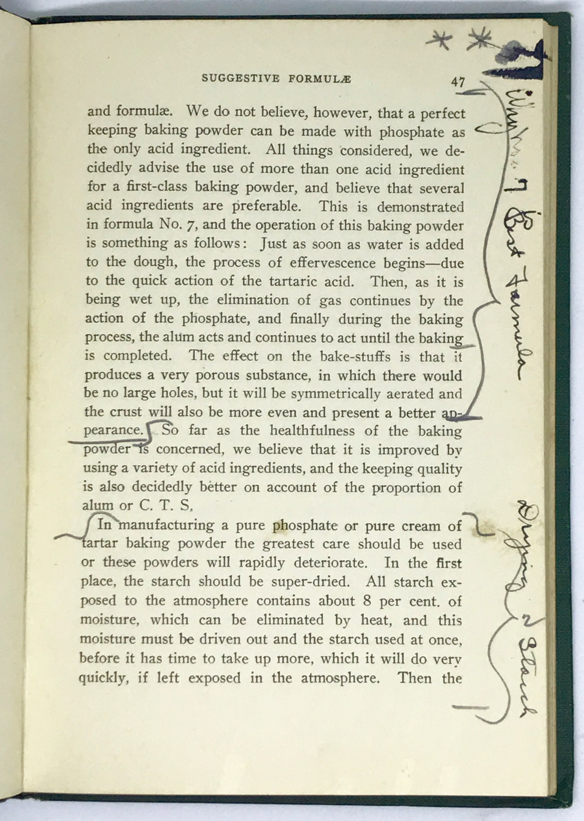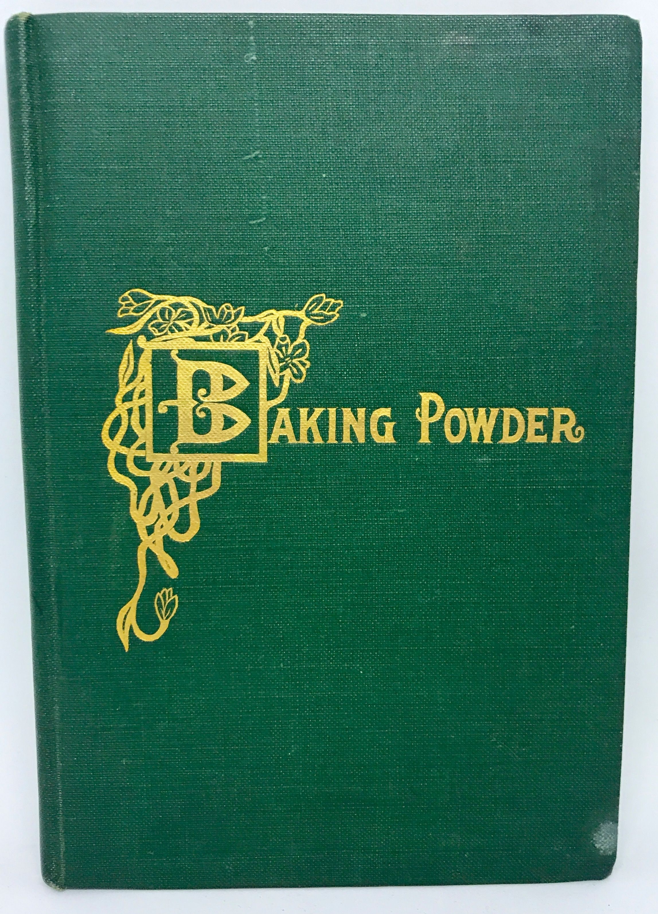 New York: The Spice Mill Publishing Company, 1906. Hardcover. Green boards, title and illustration in gilt. Very good. 86 pages, A byproduct of the baking powder wars, fought at the end of the 20th century. After a stable rising agent was established, baking powder became a profitable commodity with over hundred manufacturers popping up across the country. To win over the public, still wed to their old cookbooks, baking powder companies issued their own cookbooks and pamphlets. This book, which is annotated throughout by a hungry observer, is a scientific observation of the product and how to make it. Crisp, clean copy.