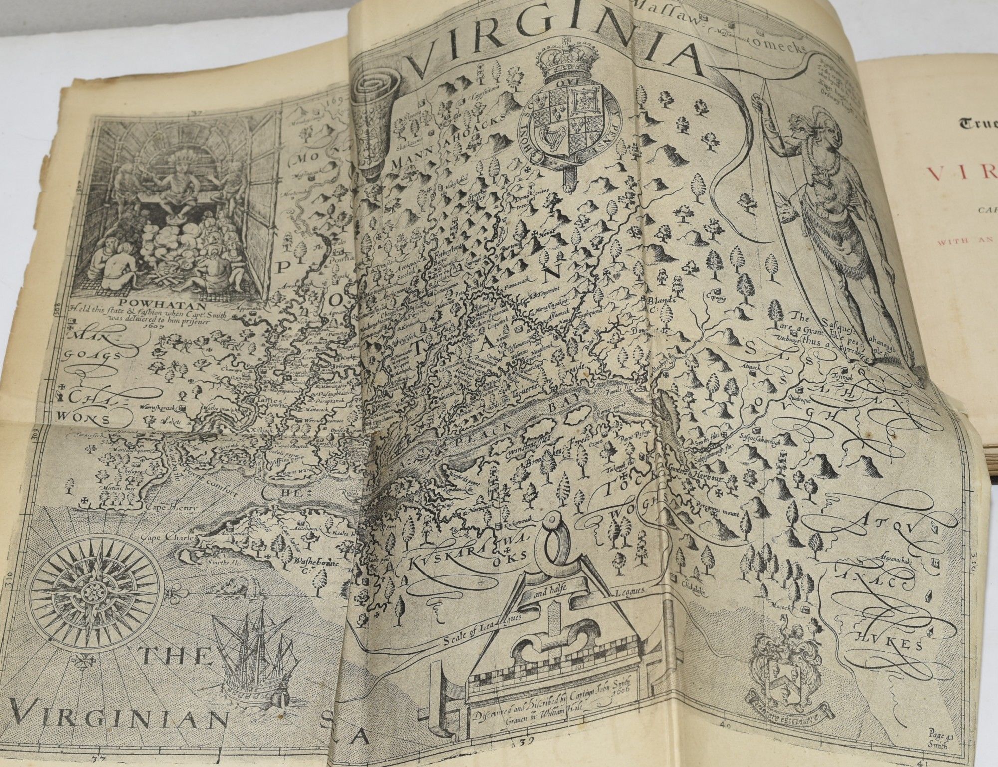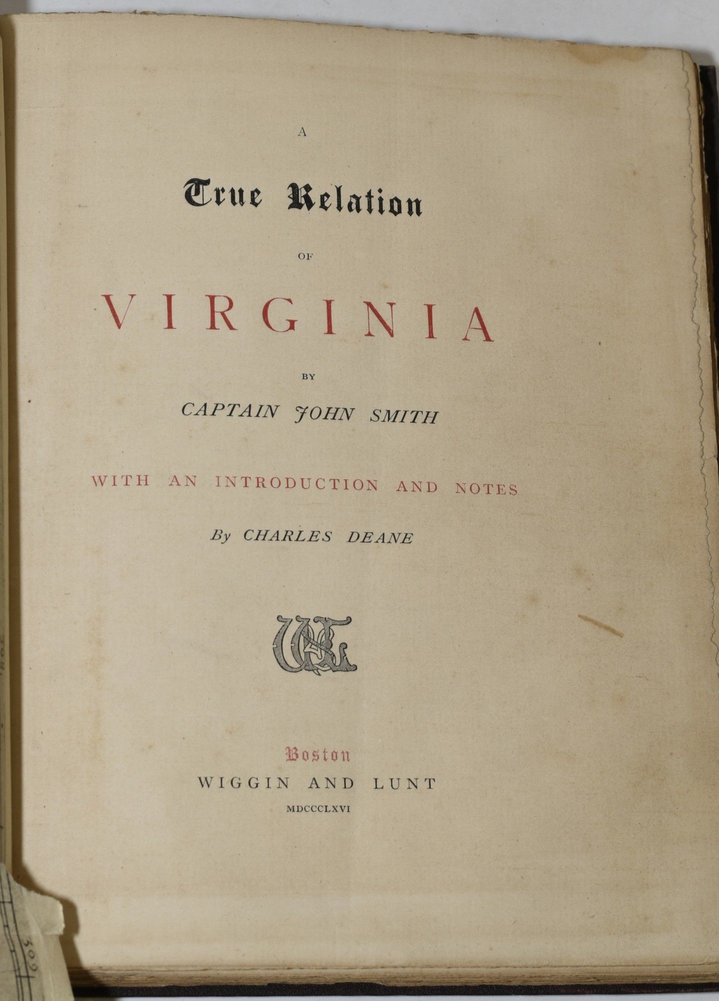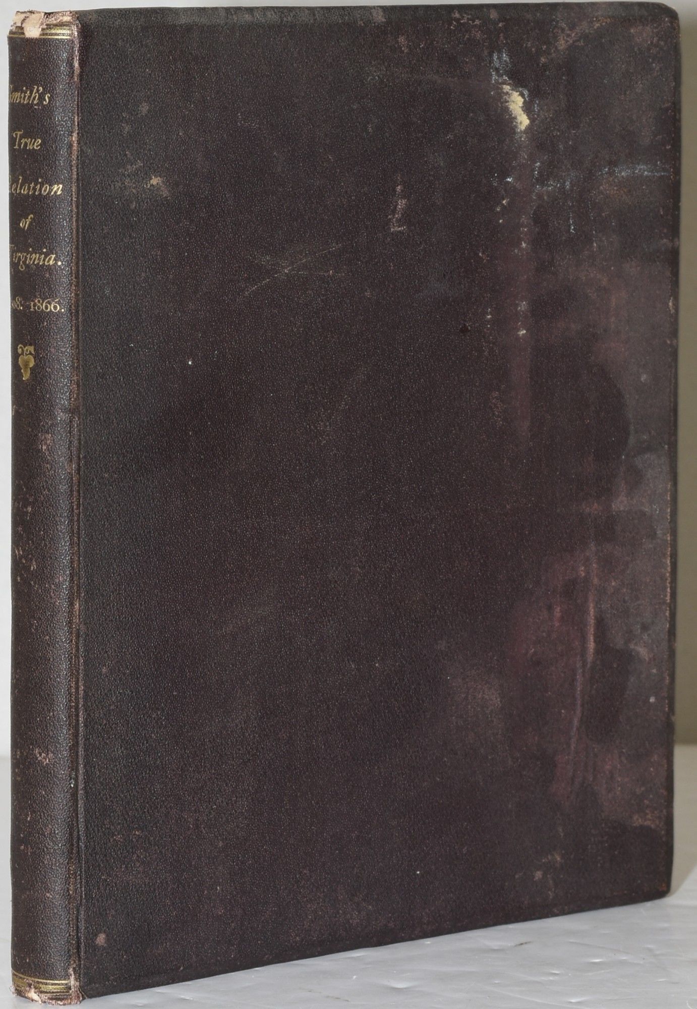 Boston: Wiggin and Lunt, 1866. Facsimile Edition. Hard Cover. Fair binding. An 1866 facsimile of the 1607 edition of Captain John Smith’s account of Virginia. The folding map, a facsimile of the iconic early map of Virginia, has a closed tear to the right edge near its attachment, repaired with paper tape; beginnings of separation to the edges of the folds. Water damage to the boards; some dampstaining to the fore edge of the textblock. Brown cloth with beveled edges; lettering and devices stamped in gilt on the spine. Fair binding.