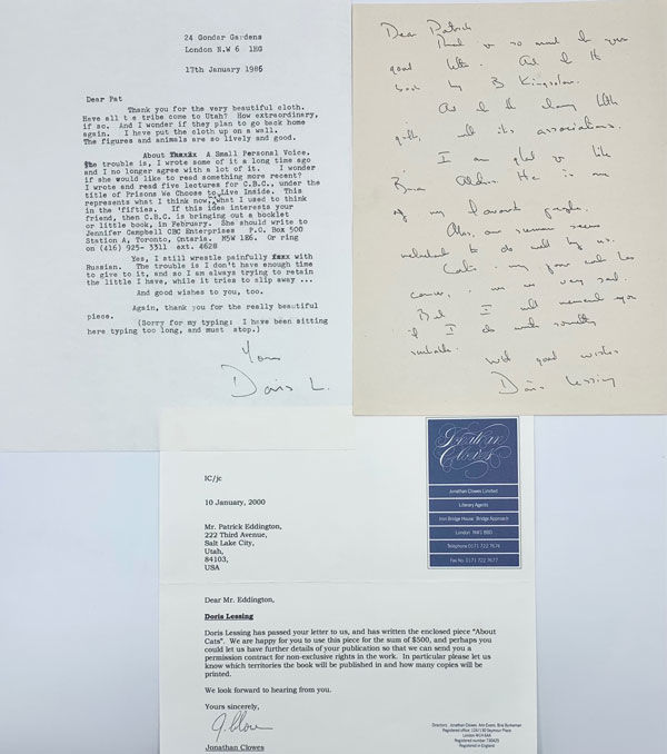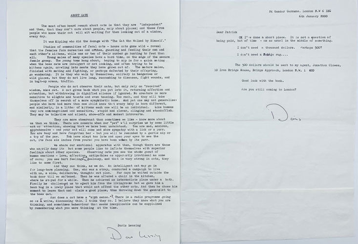 Typed letter [8 ¼” by 7 ¾”] from Lessing’s literary agent, Jonathan Clowes, to Patrick Eddington, dated 10 January, 2000, written in reference to the piece written by Doris Lessing titled “About Cats.” Clowes writes, “We are happy for you to use this piece for the sum of $500, and perhaps you could let us have further details of your publication so that we can send you a permission contract for non-exclusive rights in the work. In particular please let us know which territories the book will be published in and how many copies will be printed.” Signed by the literary agent at the foot.