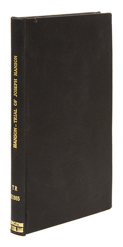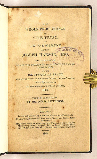 1809. London, 1809. London, 1809. "The Weaver's Friend" [Trial]. Hanson, Joseph [1781-1811], Defendant. The Whole Proceedings on the Trial of an Indictment Against Joseph Hanson, Esq.: for a Conspiracy to Aid the Weavers of Manchester in Raising Their Wages: Before Mr. Justice Le Blanc, One of the Judges of His Majesty's Court of King's Bench, And a Special Jury, At the Lancaster Spring Assizes, 1809. London: Printed and Published by T. Gillet, C. Chapple and Sherwood, Neely and Jones, 1809. xiv, [11], 116 pp. Folding map. Octavo (8-1/2" x 5-3/8"). Stab-stitched pamphlet bound into recent library cloth, gilt title to spine, endpapers renewed. Moderate toning, light foxing in a few places, soiling, minor edgewear and faint library stamp to title page, a few library marks to verso, light soiling to verso of final leaf (p. 116). $350. * Only edition. Hanson was a social reformer who was imprisoned and fined for his efforts to institute a minimum wage and the right to bargain, among other reforms, for the weavers of Manchester. Considered a dangerous man by the authorities, he was charged with sedition. Known as "the weaver's Friend," 39,600 people contributed one penny each to his defence fund. OCLC locates 4 copies in North American law libraries (Harvard, LA County, Library of Congress, Yale). Catalogue of the Goldsmiths' Library of Economic Literature II:19907.