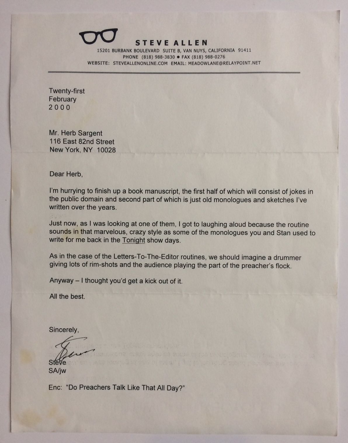 Van Nuys, 2000. unbound. very good(+). American television personality, author, composer, musician and actor who achieved national fame as the first host of The Tonight Show; the first late-night television talk show. Excellent content T.L.S. "Steve", reminiscing about the early days on the Tonight Show. 4to. 1 page, personal letterhead, Van Nuys, California, February 21st 2000 Written just a few months before his death, to long time friend and collaborator Herb Sargent. The letter reads in full: "I'm hurrying to finish up a book manuscript, the first half of which will consist of jokes in the public domain and the second part of which is jut old monologues and sketches I've written over the years. Just now, as I was looking at one of them, I got to laughing aloud because the routine sounds in that marvelous, crazy style as some of the monologues you and Stan used to write for me back in the Tonight show days. As in the case of the Letters - To - The - Editor routines, we should imagine a drummer giving lots of rim-shots and the audience playing the part of the preacher's flock. Anyway - I thought you would get a kick out of it." Usual folds otherwise in very good (+) condition.