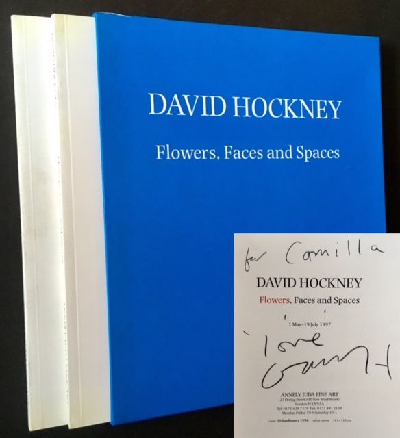 London: Annely Juda Fine Art, 1997. Original wraps. Fine. A pristine example of the 2 volume catalogue, based on the May-July 1997 exhibition at London's Annely Juda Fine Art Gallery AND INSCRIBED BY DAVID HOCKNEY on the title page of "Flowers and Spaces" (the 1st of 2 volumes, the 2nd volume titled "Faces and Spaces"). Both volumes crisp and Fine in their pictorial wrappers. And both housed in a Near Fine example of the printed cardboard slipcase.