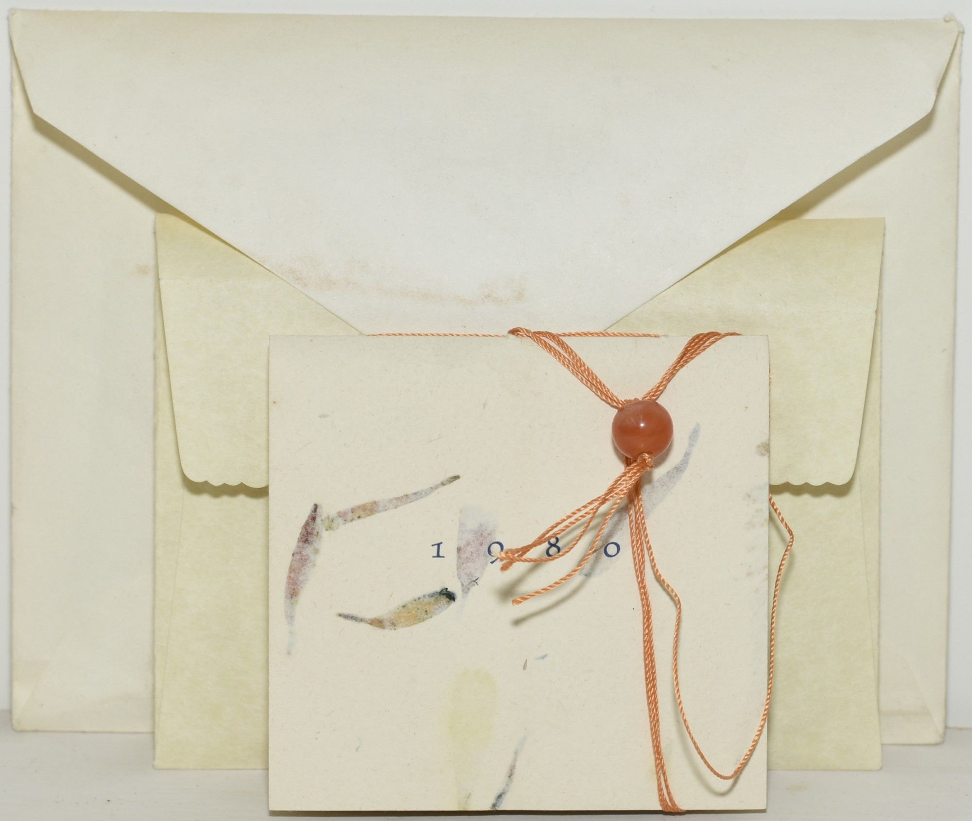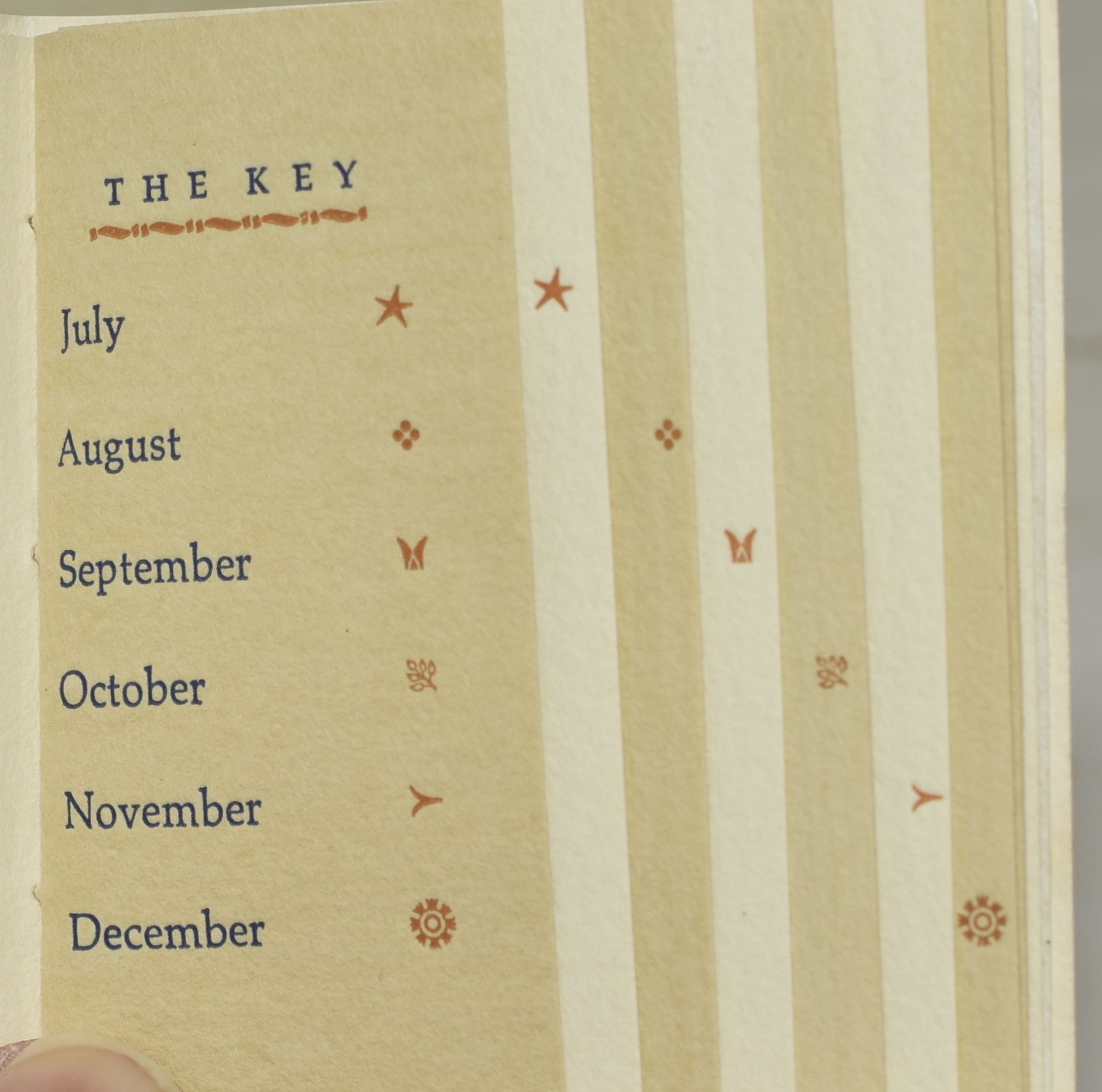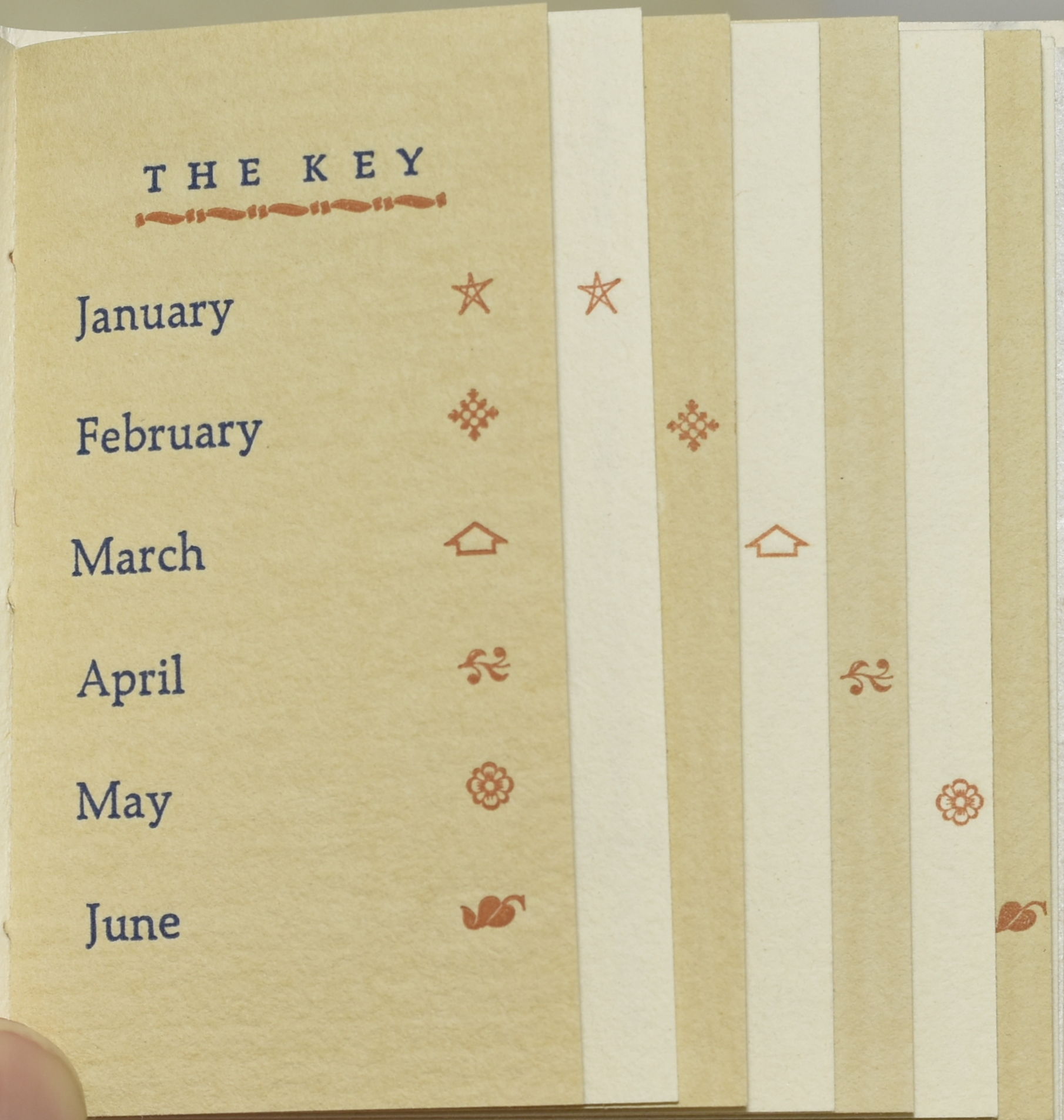 The Rara Avis Press, 1980. Fine binding. To welcome the new decade this edition of 150 was designed and printed for Anne and David Bromer at The Rara Avis Press in Madison, Wisconsin. This is copy 75. The symbols by Marta Anderson and Palatino and ornaments from the Pickering Press are printed on leaves of Roma, bound by hand in flowering Richard de Bas". Calendar for 1980 with tassel and bead. Fine binding.