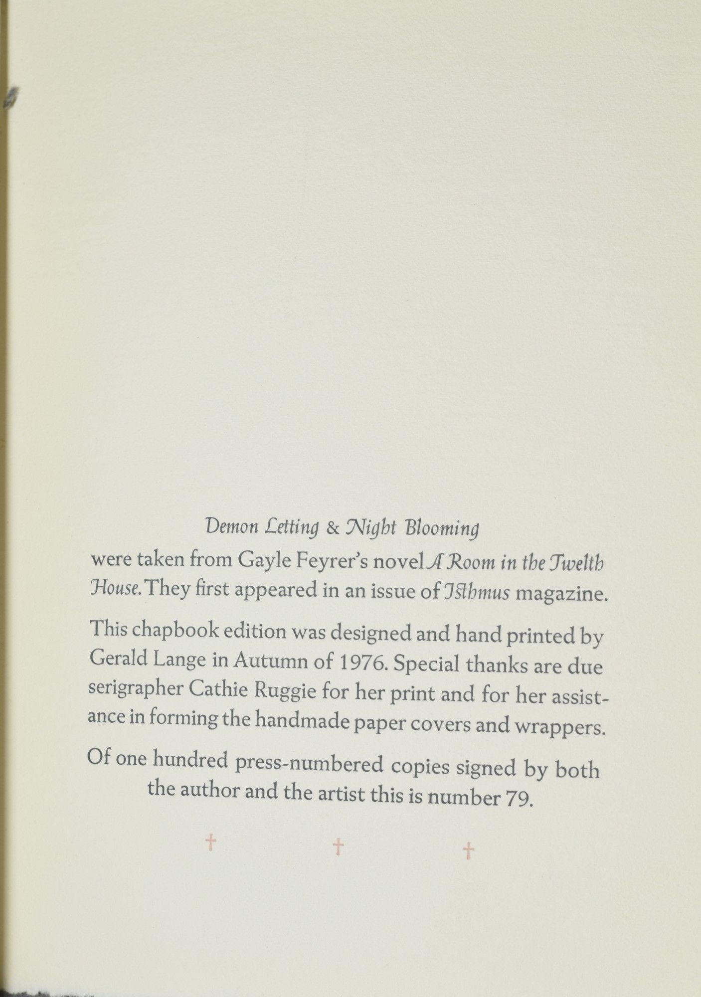 [Poynette, Wisconsin]: Bieler Press, 1976. Fine binding. Number 79 of 100 press-numbered copies in handmade blue and pink wrappers. Signed by the author; with a brightly colored serigraph signed by the artist Cathie Ruggie. "Demon Letting & Night Blooming were taken from Cayle Feyrer's novel A Room in the Twelfth House". Chapbook edition. Fine binding.