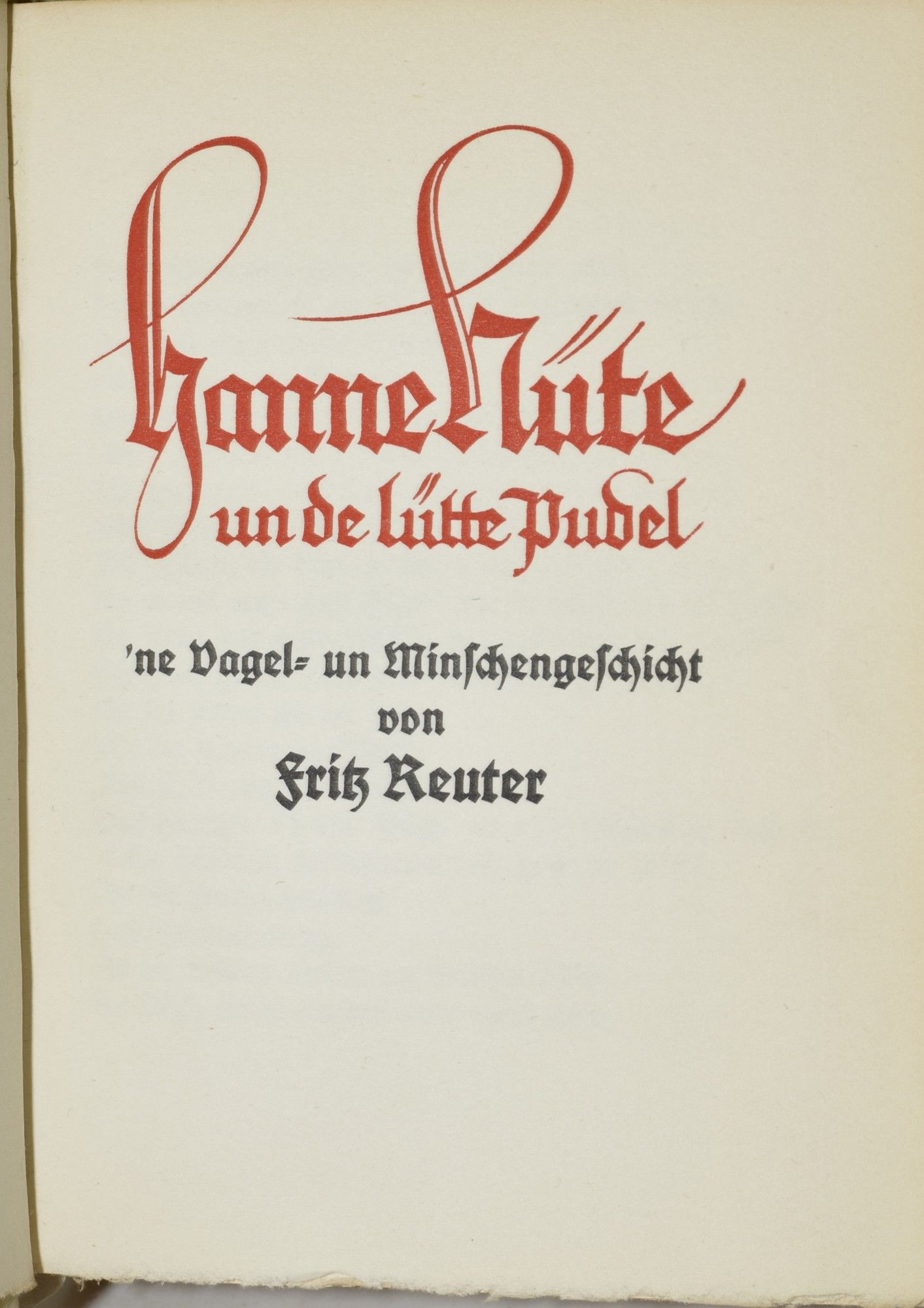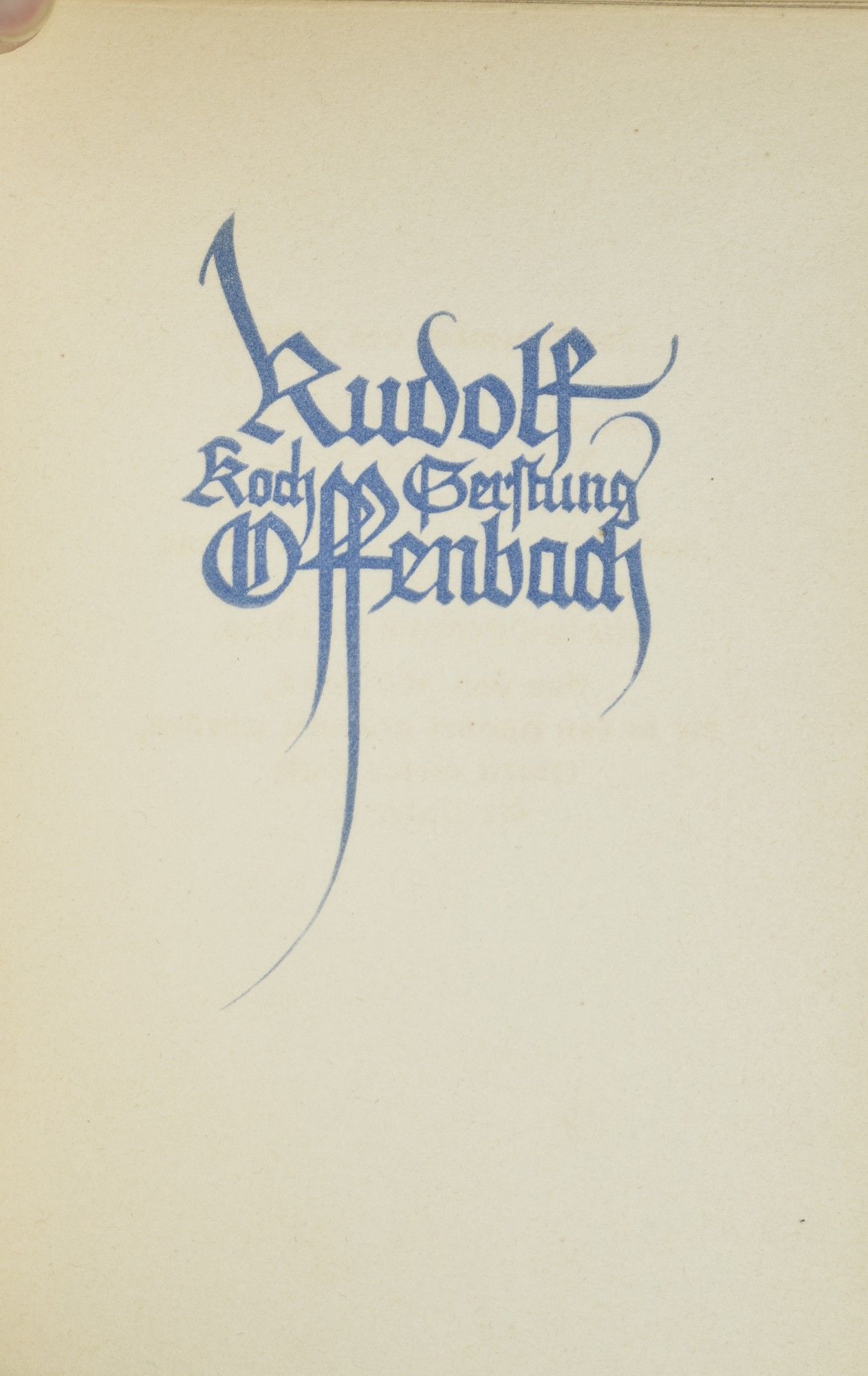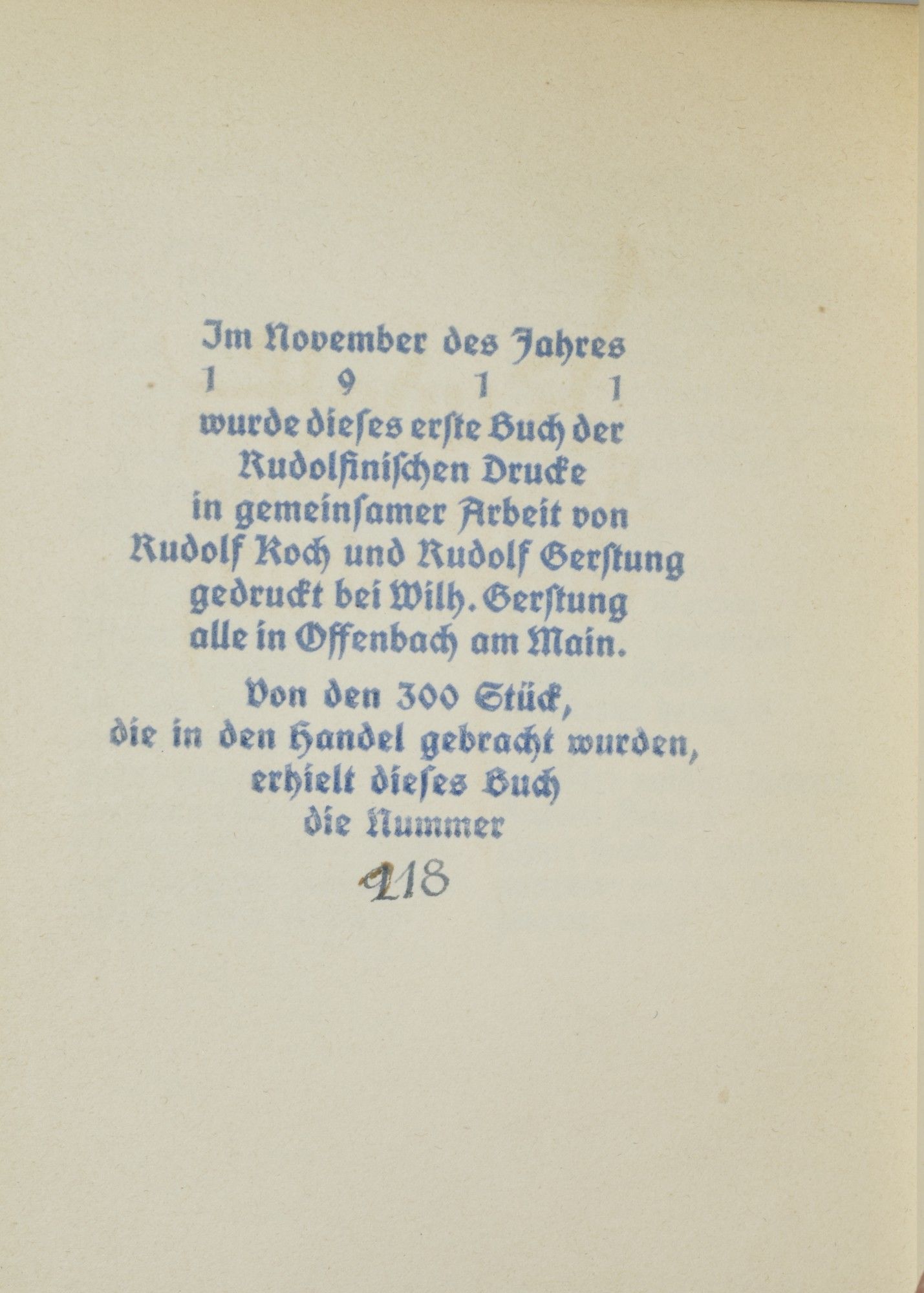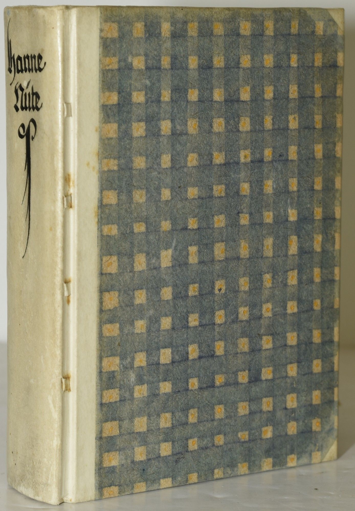 Offenbach am Main: Koch und Gerstung, 1911. The first of Rudolf Koch's press. One of 300 numbered copies, in half-parchment over paper-covered boards; with hand titling inked by Rudolf Koch; top edge gilt. With title and chapter numbers cut by Koch in wood and printed in red with the colophon in blue; the German type designed by Koch.