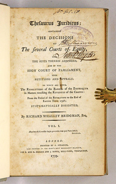 1799. 2 vols. London, 1799-1800. 2 vols. London, 1799-1800. A Scarce Eighteenth-Century Digest Bridgman, Richard Whalley [1766?-1820], Compiler. Thesaurus Juridicus, Containing the Decisions of the Several Courts of Equity, Upon the Suits Therein Adjudged, And of the High Court of Parliament, Upon Petitions and Appeals: To Which are Added, The Resolutions of the Barons of the Exchequer in Matters Touching the Revenues of the Crown: From the Period of the Revolution to the End of Easter Term 1798; Systematically Digested. London: Printed by A. Strahan, 1799-1800. 2 volumes. xx, 611, [1]; xiv, 588 pp. Octavo (9" x 5-3/4"). Later library cloth, red and black calf lettering pieces and paper location labels to spines. Some soiling and light shelfwear, a few minor chips to spine labels. Moderate toning, light foxing to Volume I, some soiling, early signatures and marks and later library stamps to title pages, library marks to versos. A scarce title. $750. * First edition. Bridgman never completed this highly detailed work, which begins with "Abatement" and ends with "Demise le Roi." It was highly regarded, however, and had a second edition in 1806. In Preston on Abstracts, the author notes, "had this work been completed, it would have formed one of the most useful books in the lawyer's library." OCLC locates 10 copies of the first edition in North American law libraries (Dalhousie, Harvard, Library of Congress, Southern Methodist University, University of Michigan, University of Maine, University of Minnesota, University of Pennsylvania, University of Washington, Columbia). Preston cited in Marvin, Legal Bibliography 147. English Short-Title Catalogue T143881.