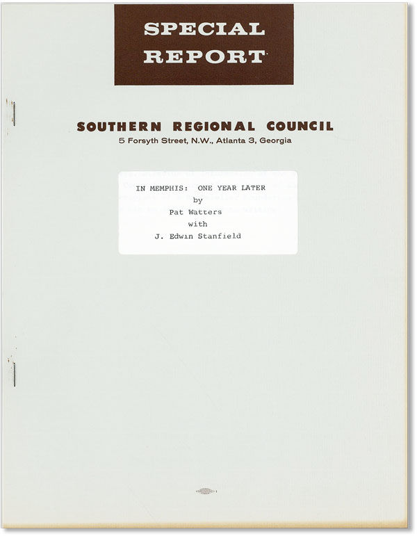 Atlanta: Southern Regional Council & Tennessee Council on Human Relations, 1969. First Edition. Quarto (28cm.); publisher's grey staplebound die-cut wrappers; [4],37pp. Fine condition. Report of the after-effects of the Memphis sanitation strike of February, 1968, during which Martin Luther King was assassinated.