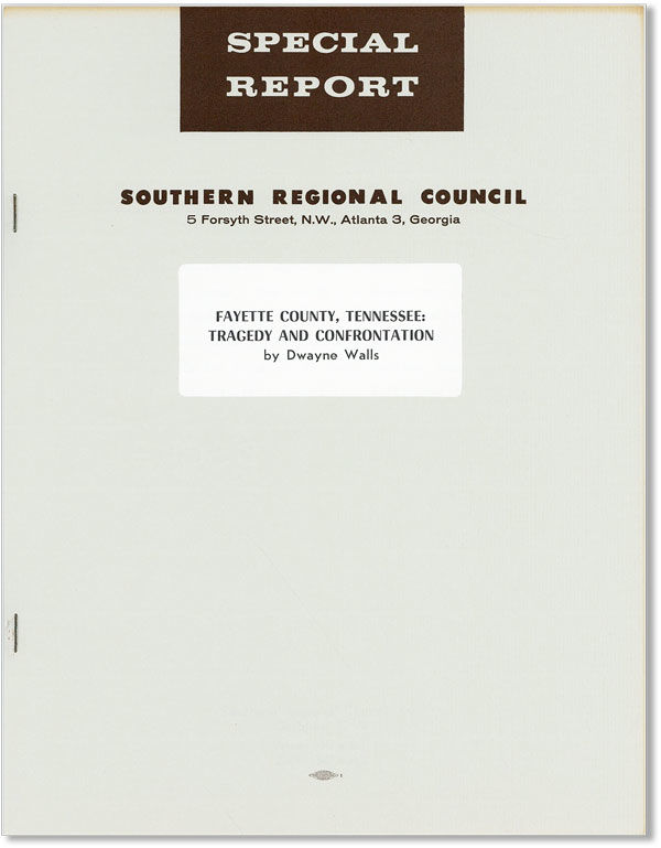 Atlanta: Southern Regional Council, 1969. First Edition. Quarto (11" x 8-1/2"). Side-stapled wrappers; 36pp. Fine. On racial conflict in Somerville and Fayette County Tennessee during the summer and fall of 1969.