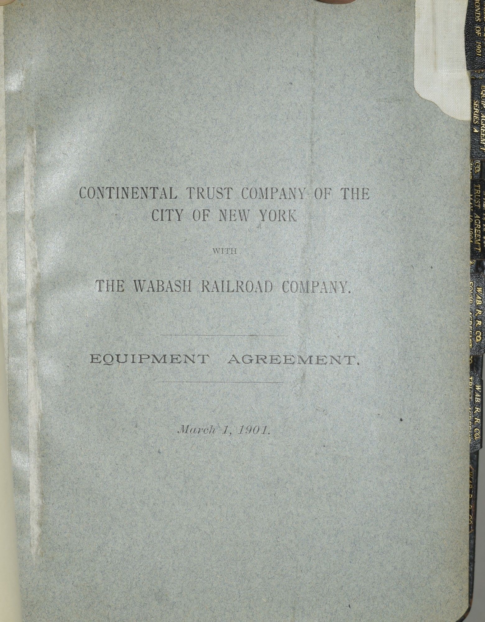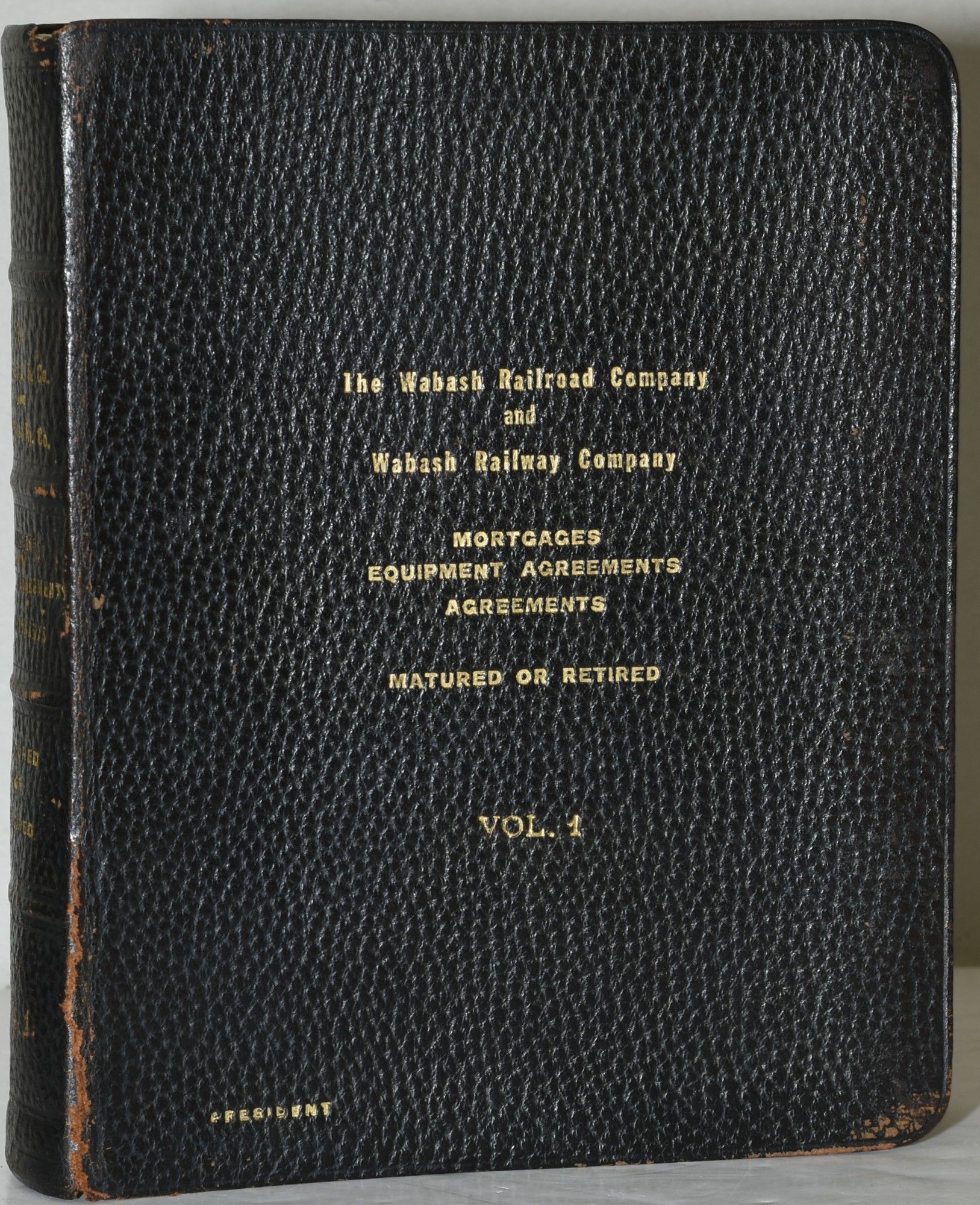 Full Leather. Very Good binding. A copy of Volume I only of The Wabash Railroad Company and Wabash Railway Company, Mortgages, Equipment Agreements, Agreements, Matured or Retired. A highly detailed collection of complete, legal, financial agreements, made between 1901 and 1915, between the Wabash Railroad and Railway Companies and the Continental Trust Company of New York, Blair & Co., Bankers Trust Company, the Equitable Trust Company of New York, the Colonial Trust Company of Pittsburgh, Central Trust Company of New York, Bowling Green Trust Company, J. C. van Blarcom, James B. Forgan, Lee, Higginson & Co., City Trust Co., Industrial Trust Co., The First Trust and Savings Bank, Old Colony Trust Company, and the United States Mortgage and Trust Company. Notes on the agreements and how they were completed, written in ink by a previous owner on some divisional title pages. Titling tabs attached by the binder on the fore edge of the divisional title pages; titling stamped in gilt on the front cover and spine. Some wear to the binding; beginnings of separation to the bottom of the front joint. Black flexible leather, with 'President' stamped in gilt beneath the titling on the front cover. Very Good binding.