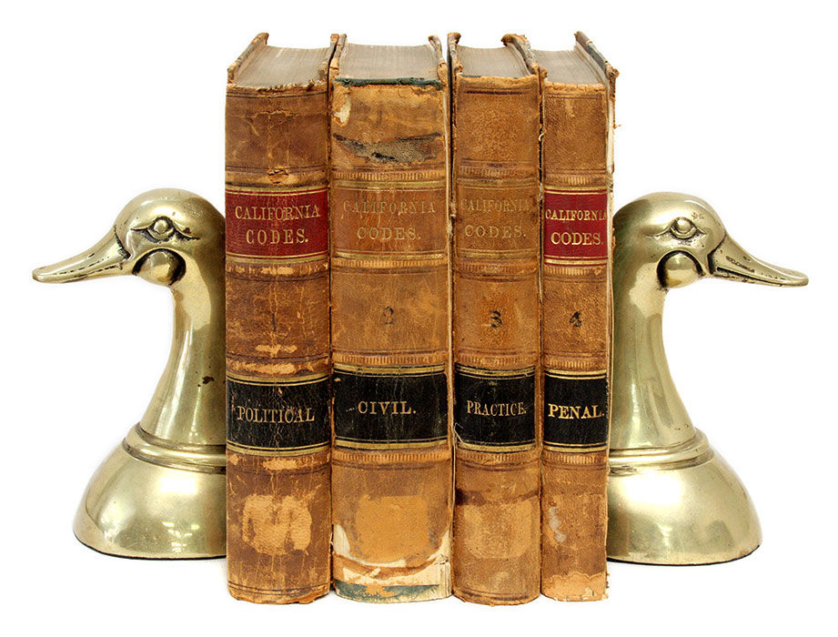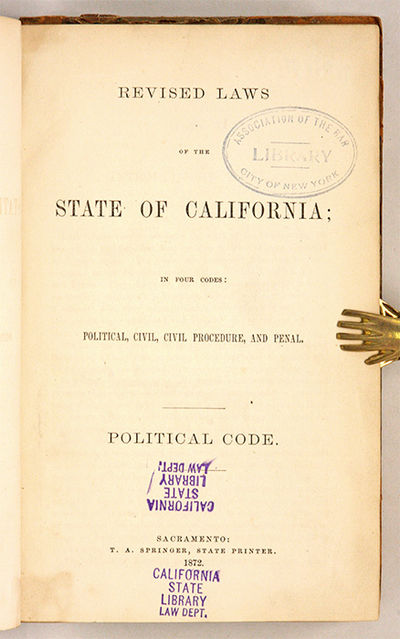1872. Sacramento, 1871-1872. 4 Vols.. Sacramento, 1871-1872. 4 Vols. California's Field-Based Codes of 1872 [California]. [Haymond, Creed (1836-1893)]. [Burch, John C. (1826-1885)]. [Lindley, Charles]. Revised Laws of the State of California: In Four Codes: Political, Civil, Civil Procedure, And Penal. Volume I: Sacramento: T.A. Springer, State Printer, 1872; Volume II-IV: Sacramento: D.W. Gelwicks, State Printer, 1871. Four volumes. Complete set. Lacking the 2 tables (one of consanguinity, the other a schematic overview of the civil code). Octavo (8-3/4" x 5-1/2"). Contemporary three-quarter law calf over marbled boards, raised bands and red and black lettering pieces to spines. Some rubbing and a few minor scuffs to boards, heavier rubbing to extremities with wear to spine ends and corners, boards detached, a few endleaves detached and lightly edgeworn, card-pocket residue to front pastedown of Volume I. Light to moderate toning, a few early owner signatures to front endleaves of Volumes I and II, later library stamps to title pages, other library marks to versos. Volumes housed in buckram clamshell cases with red and black lettering pieces. $2,000. * First edition (Volume I was published last). Volume I: Political Code; Volume II: Civil Code; Volume III: Code of Civil Procedure; Volume IV: Penal Code. Based on David Dudley Field's New York Field Codes, these volumes comprise the proposed code of laws for the state of California. The codes were adopted in 1872. The Political Code is no longer in force, but the other three remain the fundamental basis of California law. Babbitt, Hand-List of Legislation Sessions and Session Laws 25.