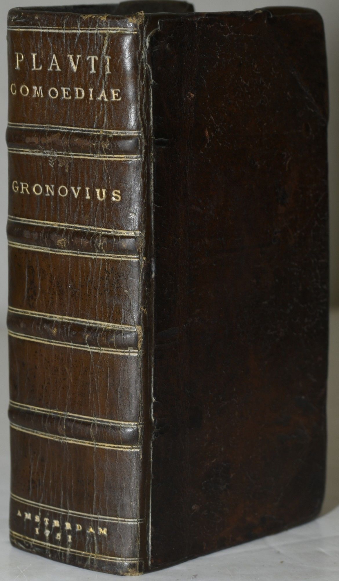 Amstelodami, 1721. Full Leather. Very Good binding. The Comedies of Plautus, edited by Joannes Gronovius. Engraved title page. Collates complete; 715, [5] pp. Small amount of worming, affecting the text on pp. 107-120. Previous owner's name on the front flyleaf, dated 1770. Later spine, and repair by a conservator to the edges of the contemporary boards. Full leather, with raised bands and lettering in gilt on the spine. Binder incorrectly stamped the publication date on the spine as 1751 instead of 1721. Very Good binding.