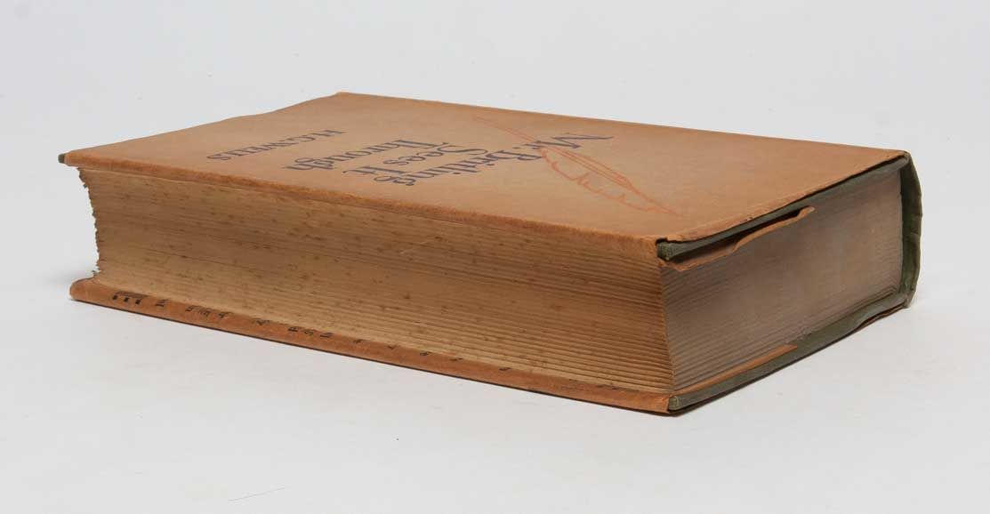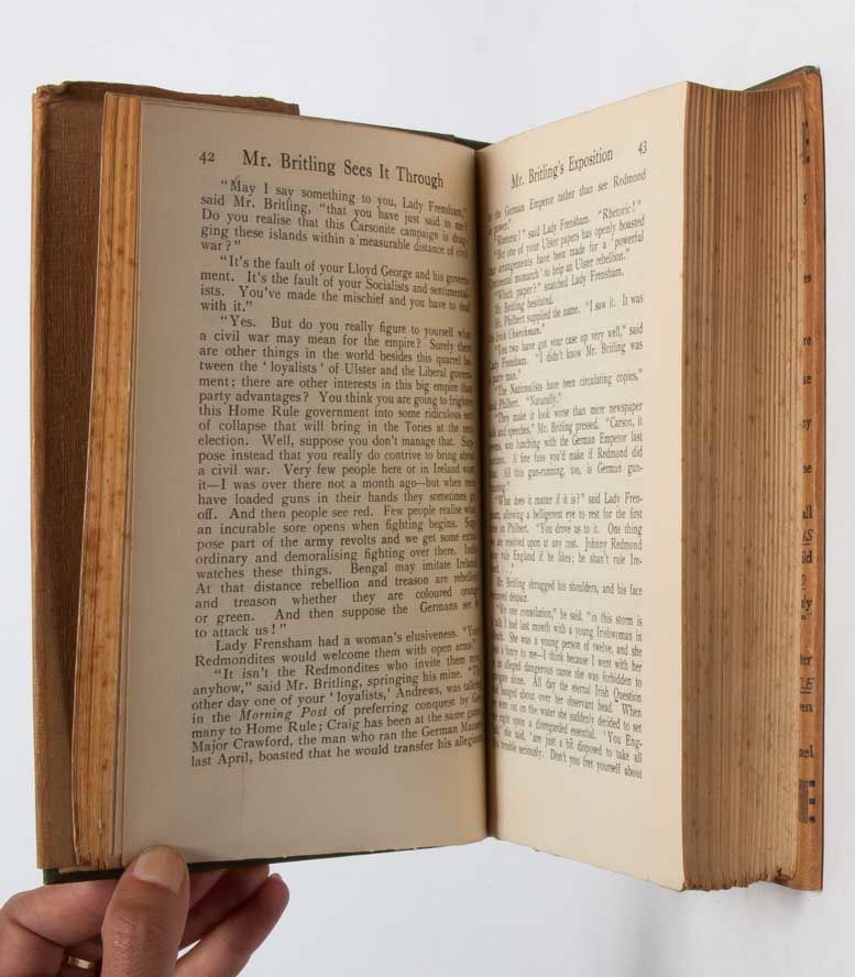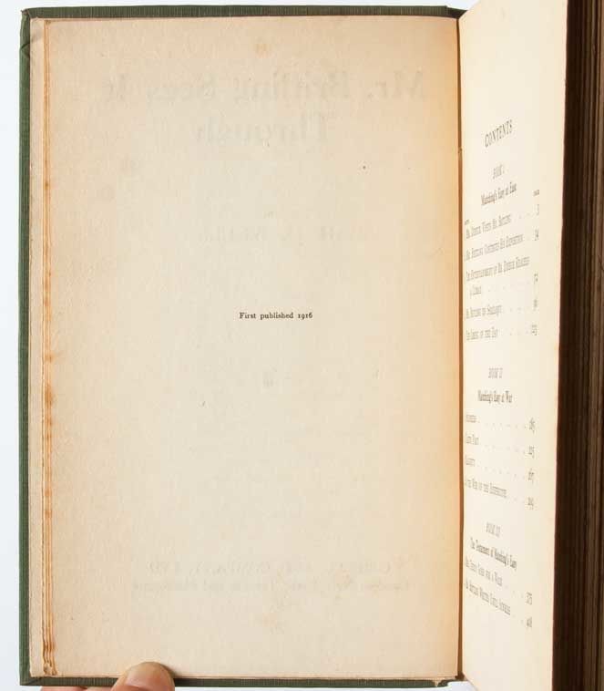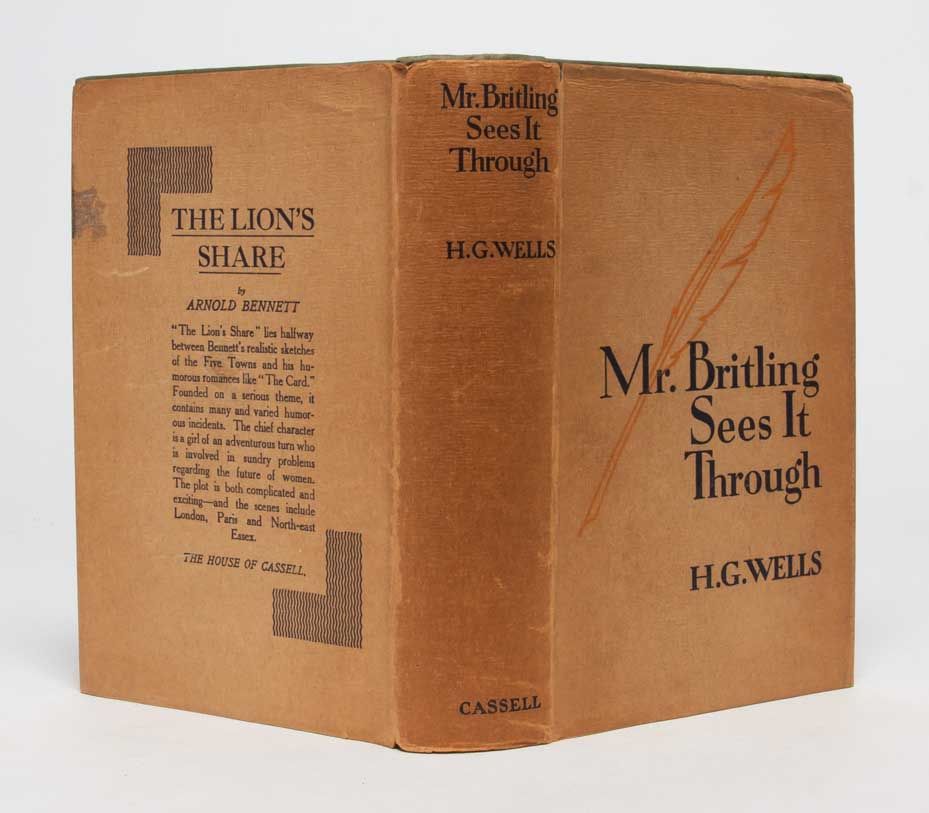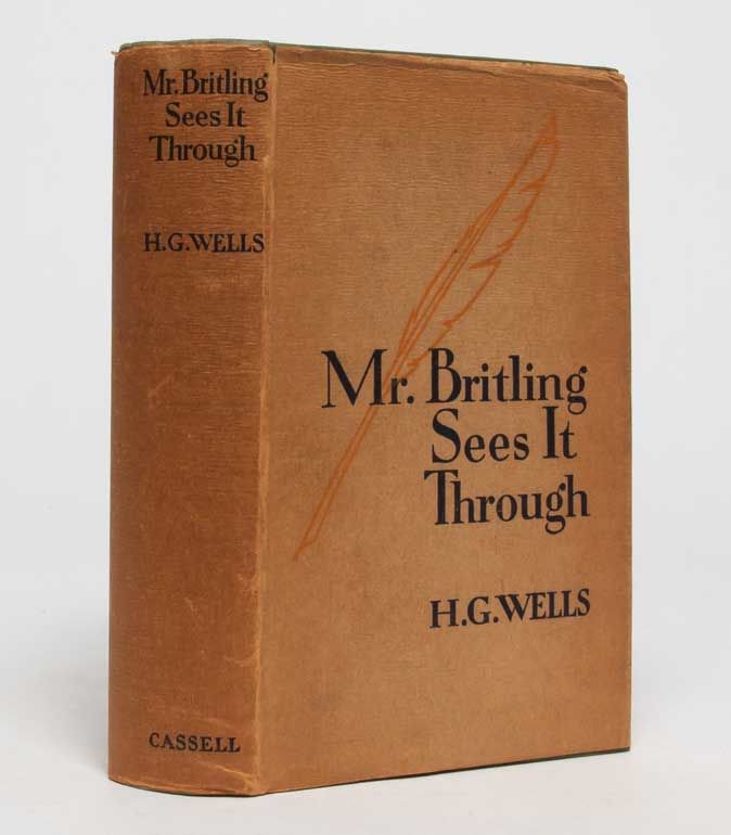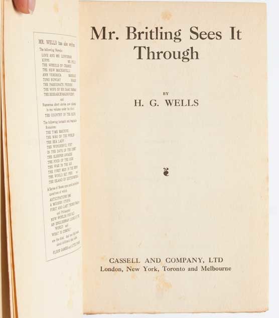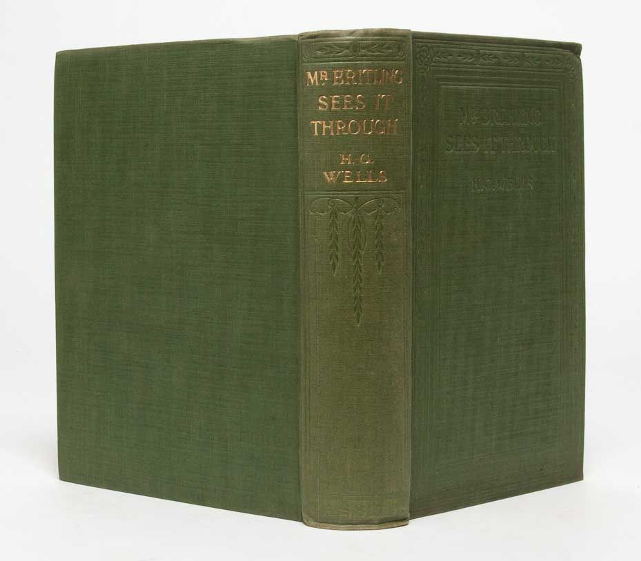 A work from Wells' middle career period, when his novels became "discussions of social or political themes that showed little concern for the novel as a literary form...Mr. Britling Sees it Through, though touched by the prejudice and short-sightedness of wartime, gives a brilliant picture of the English people in WWI. World War I shook Wells' faith in even short term human progress, and in subsequent works he modified his conception of social evolution, putting forward the view that man could only progress if he would adapt himself to changing circumstances through knowledge and education" (Britannica). In this sense, the novel marked a major shift in Wells' career. Fine in Near Fine dust jacket.