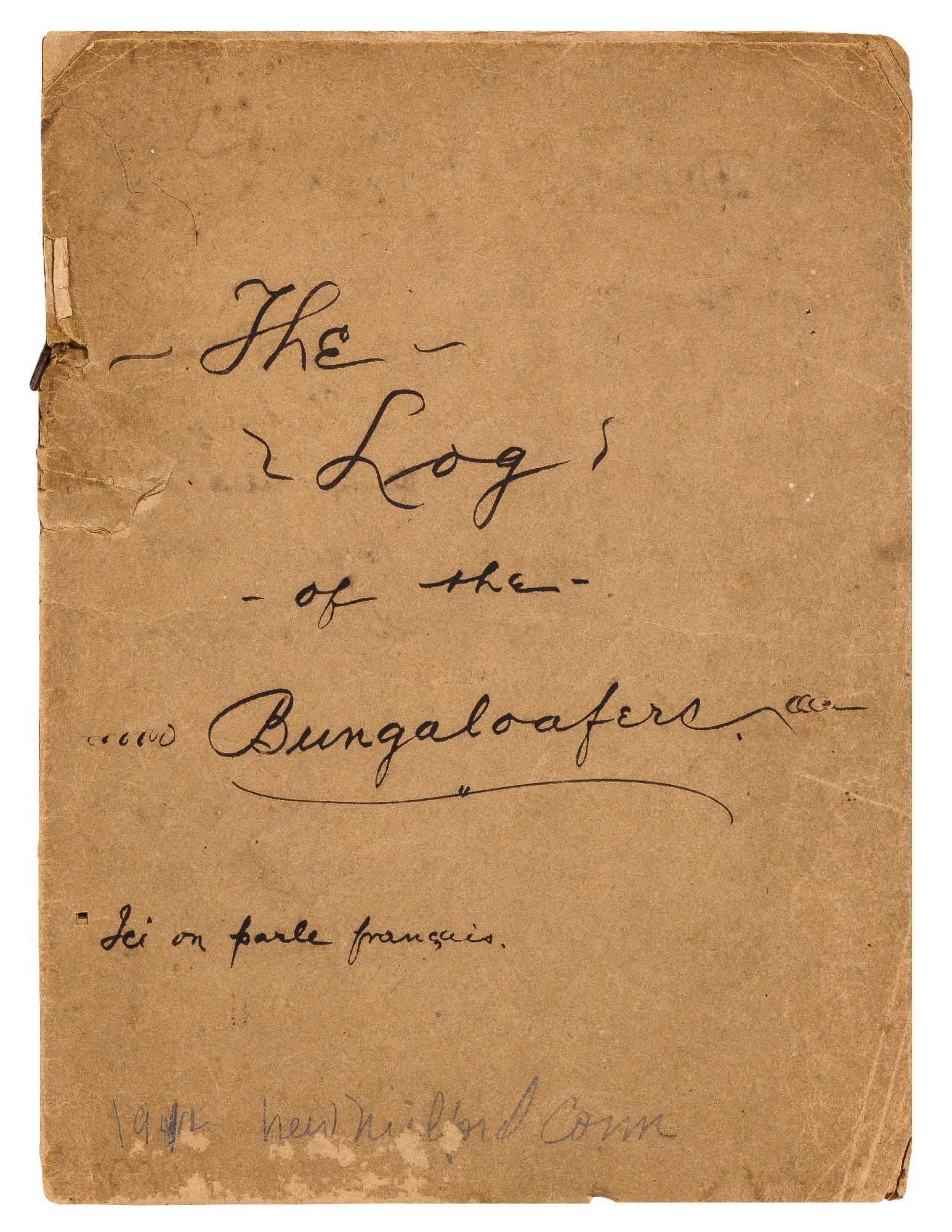 New Milford, New Jersey, 1914. Softcover. Very Good. Quarto. Measuring 9" x 12". 94pp. Approximately 6000 words written in English with French translations. Handmade brown paper travel journal with "The Log of the Bungaloafers" written on the front wrapper. Some of the pages are detached but present with tiny tears and creasing on the edges, very good with clear intact handwriting.