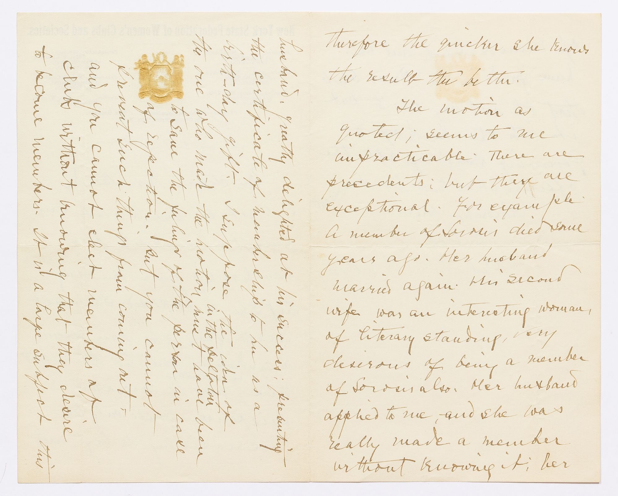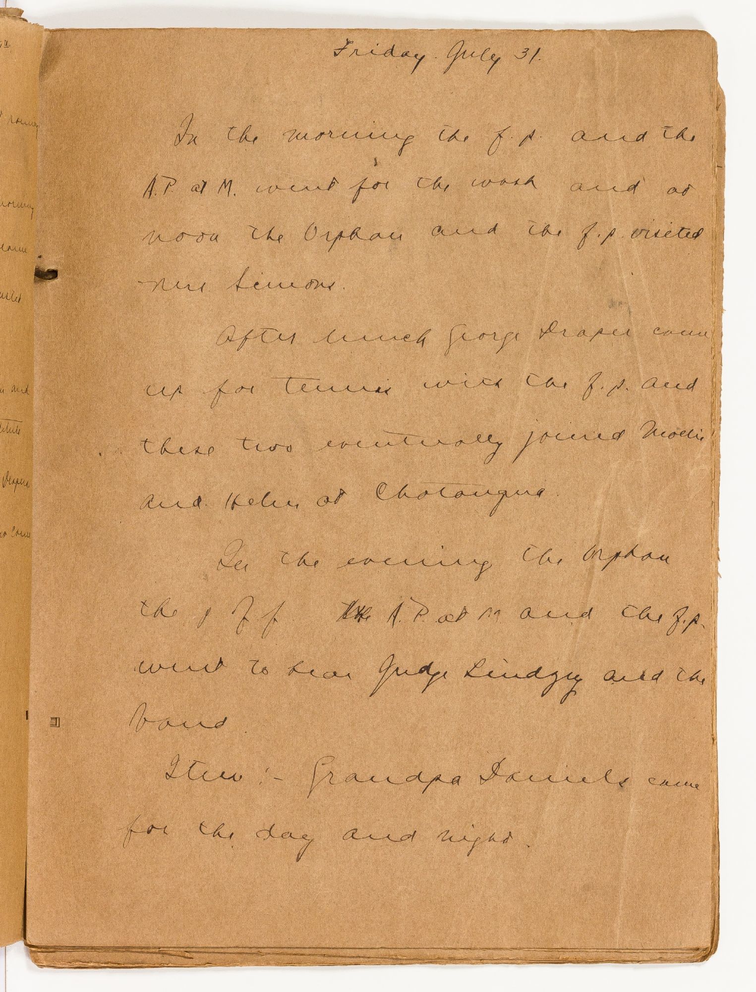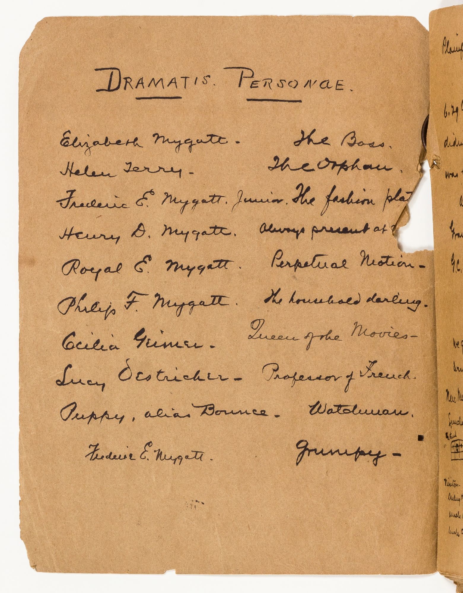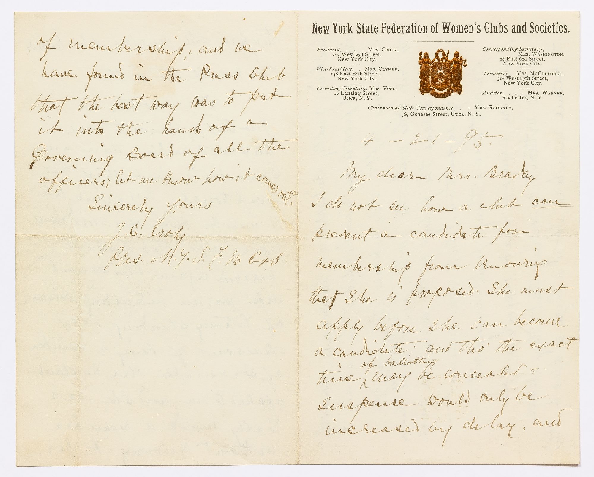 A handmade paper journal detailing the daily events of a group of women traveling together in 1914. The journal is titled, "The Log of the Bungaloafers," a tongue-in-cheek name given to the group of women. The women on the trip are listed as "Dramatic Personae," for the characters they play and are mentioned only by their nicknames throughout the album including Boss, Orphan, Fashion Plate, Always Present in Meals, Perpetual Motions, Household Darling, Queen of Movies, Professor of French, Watchman, and Grumpy. Included with the nicknames are small caricatures of each person. The women are traveling from New York City to New Milford, New Jersey to spend time together around the town and exploring forest trails and lakes in the area. Each day has a description, sometimes translated into French, of what is happening, explaining the weather of the day, and a line or so for each person on how they're feeling or what they are doing: "Robbed the library of a few of its worst choice books." Also included is a handwritten and signed letter from 1895 written by Jane Cunningham Croly, a journalist, women's rights activist, and founder of the General Federation of Women's Clubs in New York City. The letter is in reference to a woman's interest in being a candidate for membership within the New York State Federation of Women's Clubs and Societies.