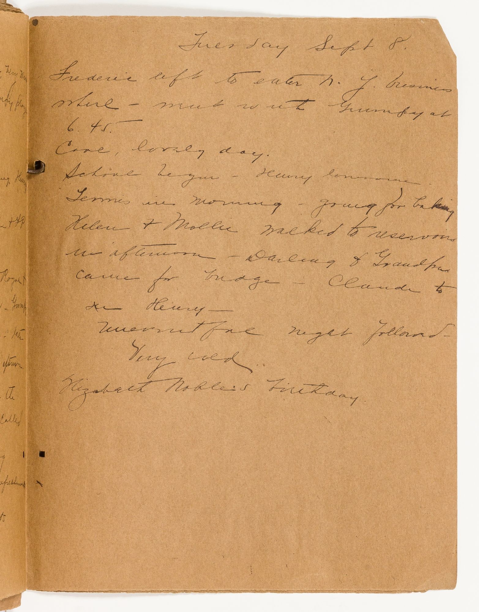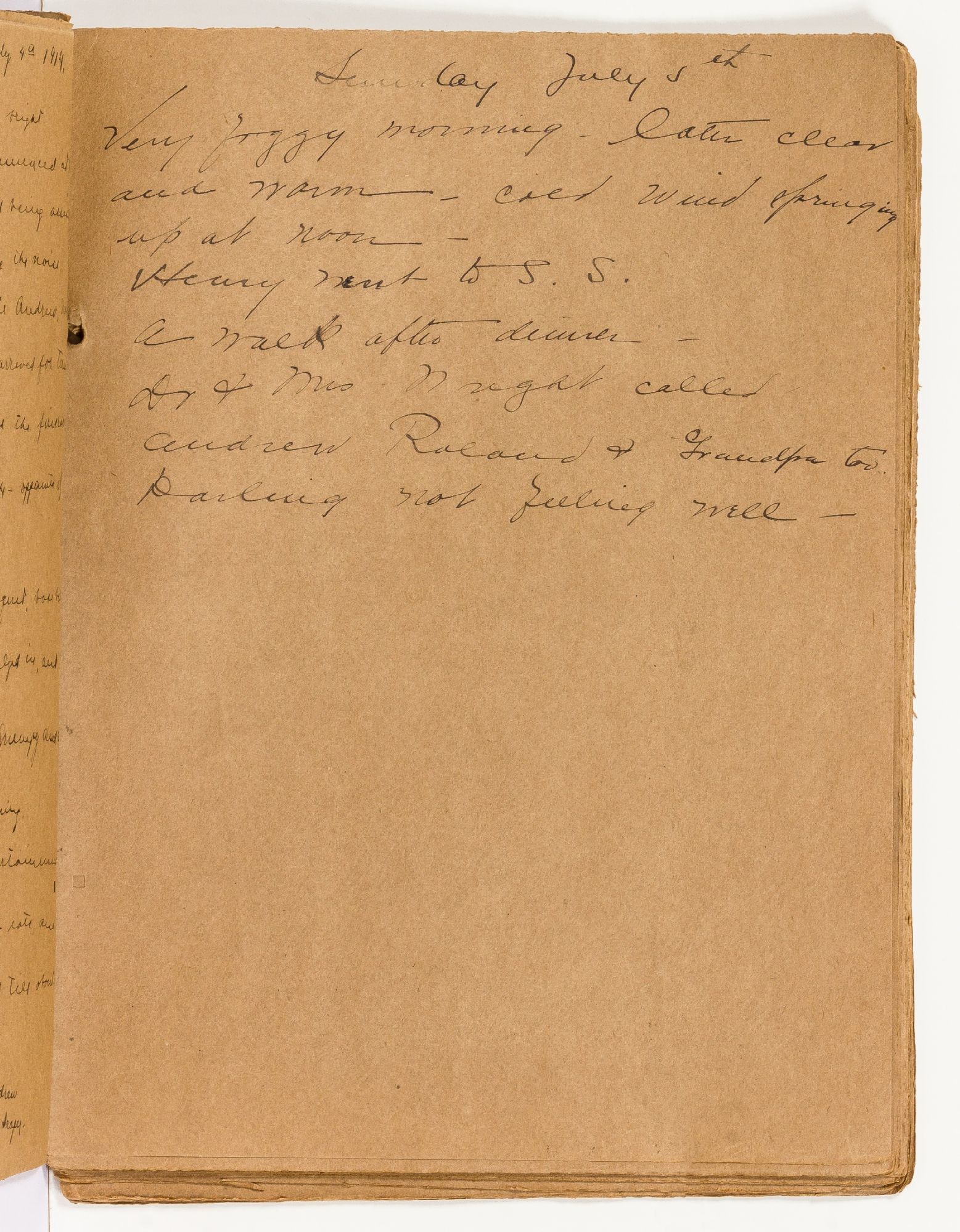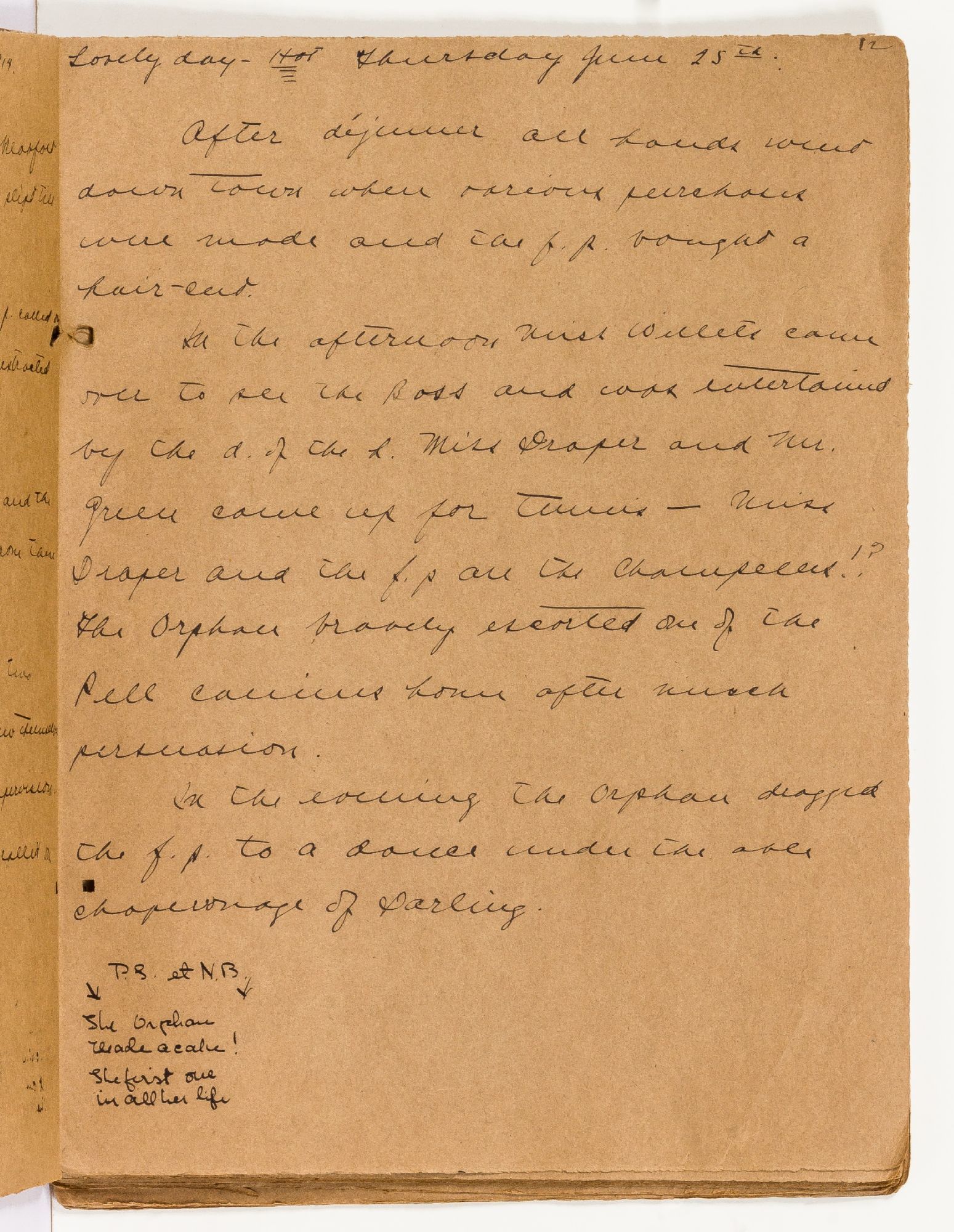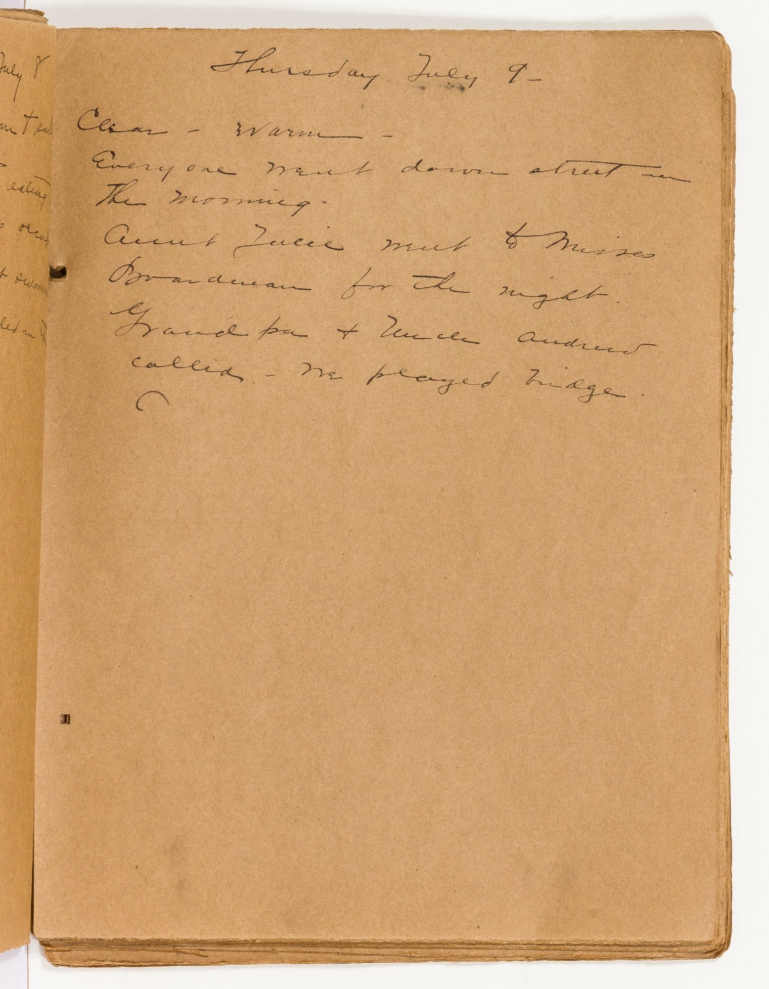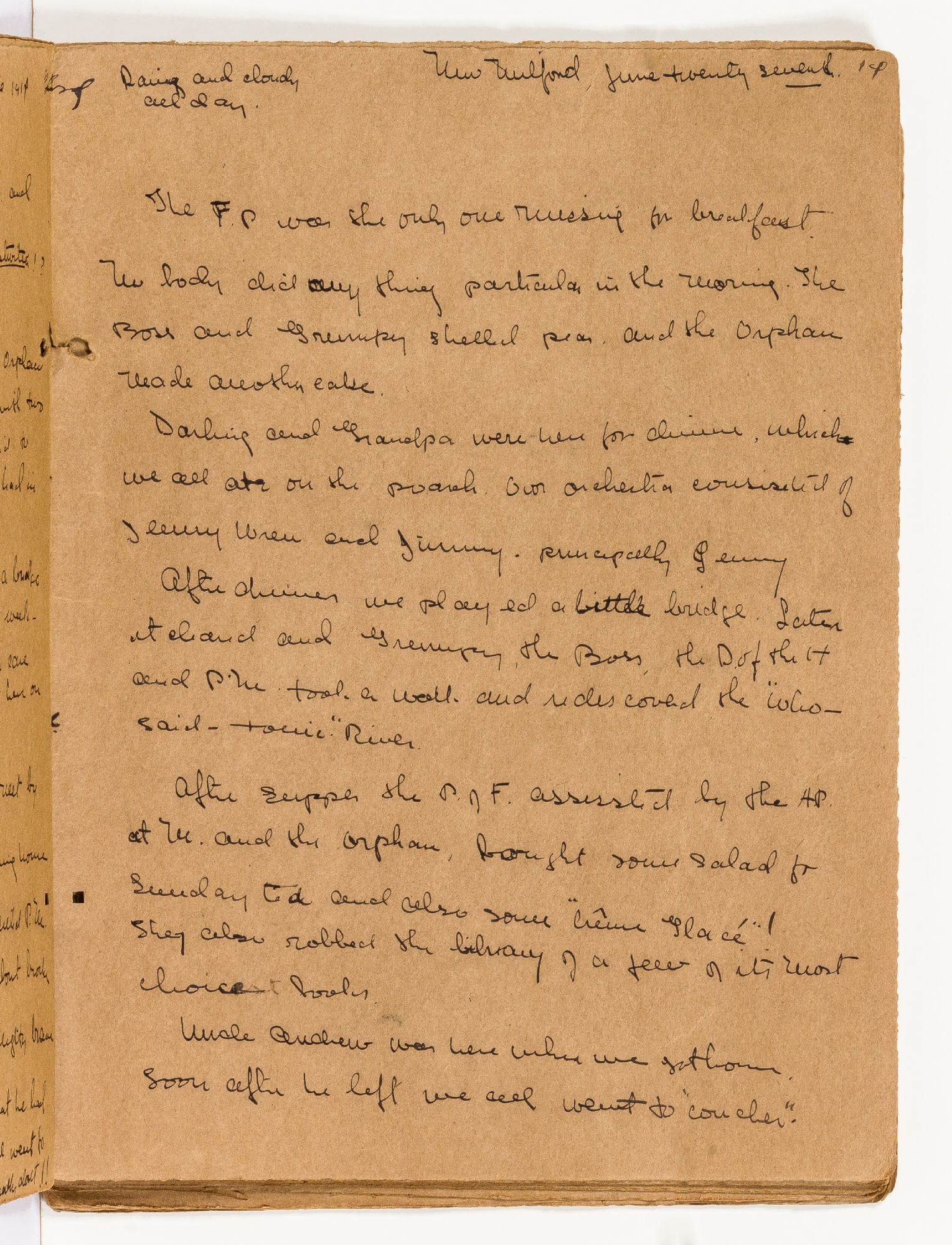 A handmade paper journal detailing the daily events of a group of women traveling together in 1914. The journal is titled, "The Log of the Bungaloafers," a tongue-in-cheek name given to the group of women. The women on the trip are listed as "Dramatic Personae," for the characters they play and are mentioned only by their nicknames throughout the album including Boss, Orphan, Fashion Plate, Always Present in Meals, Perpetual Motions, Household Darling, Queen of Movies, Professor of French, Watchman, and Grumpy. Included with the nicknames are small caricatures of each person. The women are traveling from New York City to New Milford, New Jersey to spend time together around the town and exploring forest trails and lakes in the area. Each day has a description, sometimes translated into French, of what is happening, explaining the weather of the day, and a line or so for each person on how they're feeling or what they are doing: "Robbed the library of a few of its worst choice books." Also included is a handwritten and signed letter from 1895 written by Jane Cunningham Croly, a journalist, women's rights activist, and founder of the General Federation of Women's Clubs in New York City. The letter is in reference to a woman's interest in being a candidate for membership within the New York State Federation of Women's Clubs and Societies.