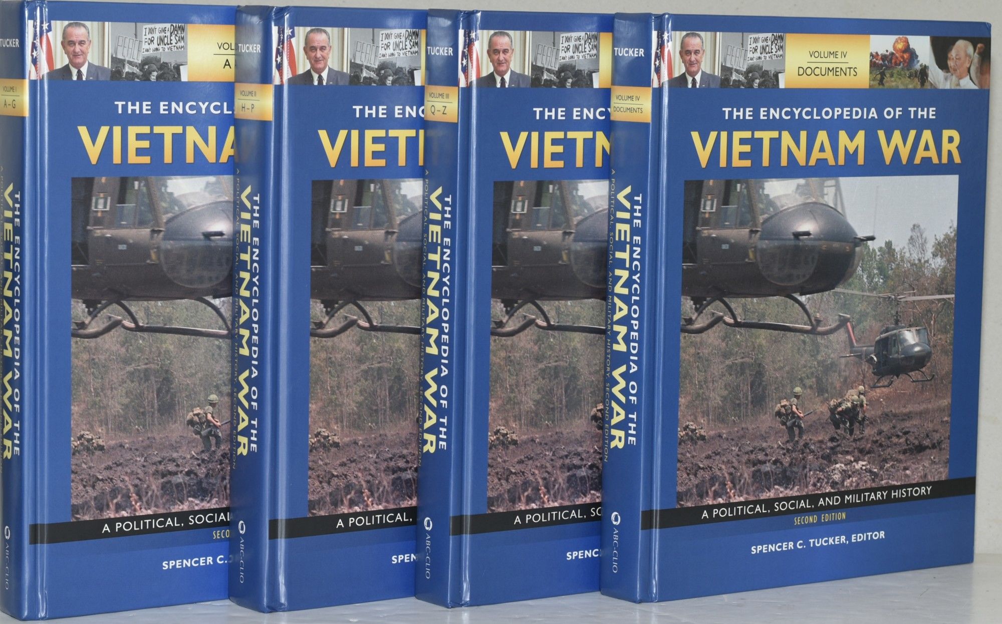 Santa Barbara, California | Denver, Colorado | Oxford, England: ABC Clio, 2011. Second Edition. Hard Cover. Very Good binding. The Encyclopedia of the Vietnam War, Second Edition, edited by Spencer C. Tucker, and complete in four volumes. With no marks of any kind. Delamination to the bottom front corner of Volume I; minimal shelfwear. Black and white photographic illustrations throughout. Laminated blue hardback. Very Good binding.