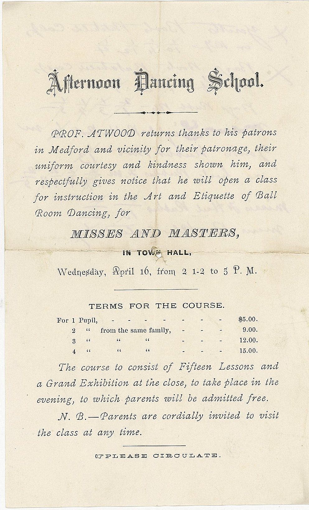 Medford MA: Prof. Atwood, 1870. A single page 8" x 5" circular announcing Afternoon Dancing School. Presented by Prof. Atwood for his patrons in the Medford (MA) intended for children, a term of fifteen lessons and a Grand Exhibition to instruct in the Art and Etiquette of Ball Room Dancing. Includes terms for the course and cordially invites parents to visit at any time. Concludes with pointing finger and "please circulate". The reverse is blank with unrelated penned notes.