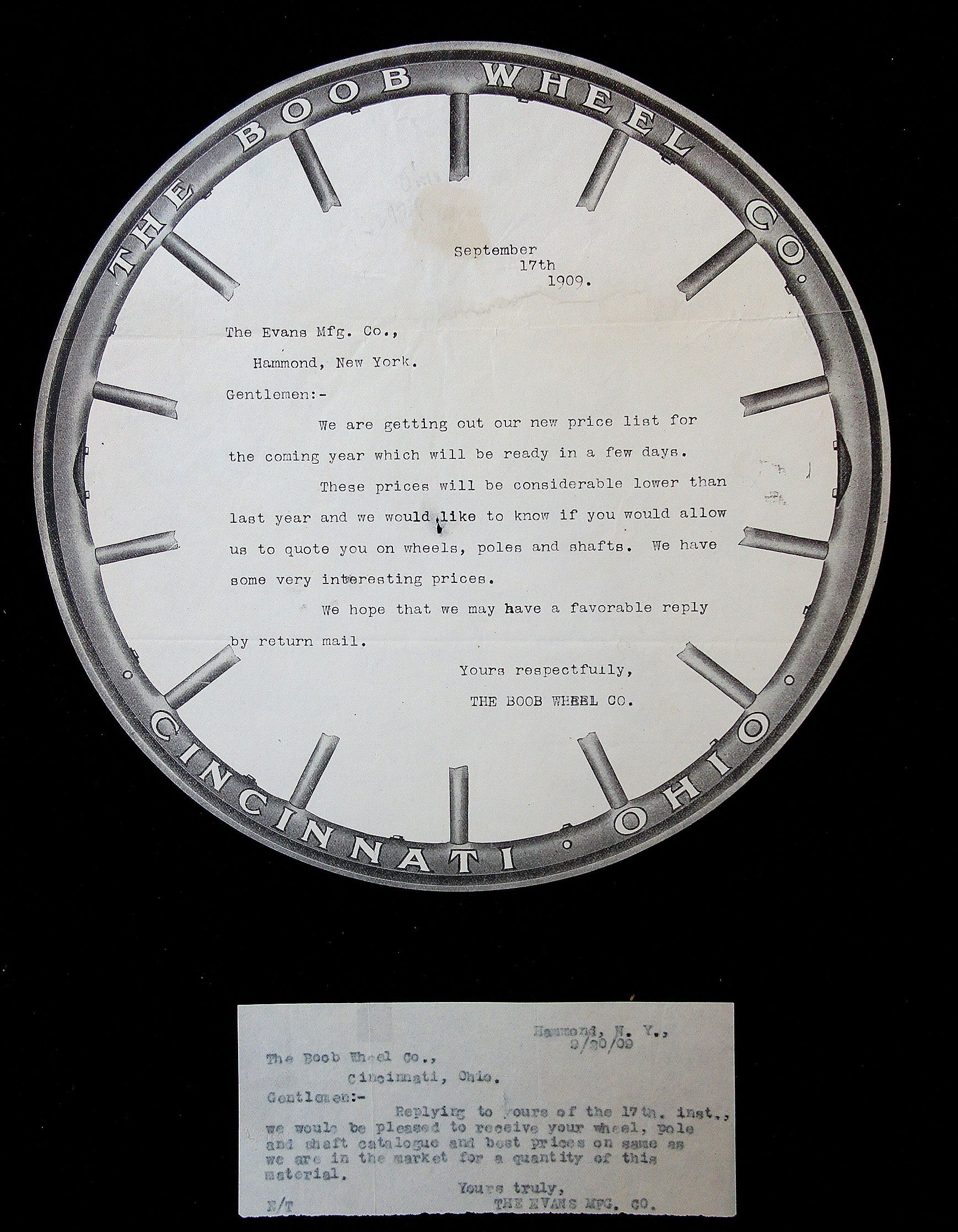 Cincinnati OH: The Boob Wheel Co, 1909. A 9 1/4" in diameter letterhead printed on paper die-cut in the shape of a circle, with wheel and spoke border design. The company sold wheels, poles and shafts, so the wheel shaped letterhead was a natural promotion for product awareness. Reverse is blank. Accompanied by file note responding to the correspondence.