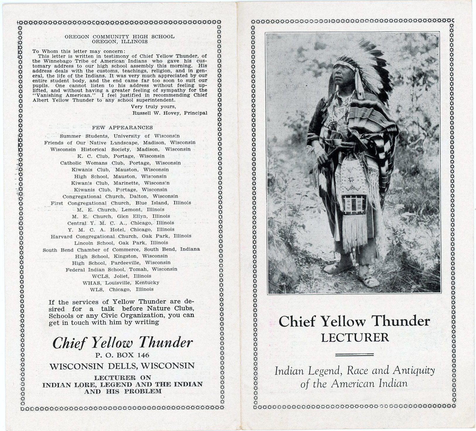 Wisconsin Dells, Wis, 1930. A single-fold 7 3/8" x 4" brochure with an image from a photograph of the Chief Yellow Thunder in traditional attire on the front cover. The grandson of the original Yellow Thumder. The brochure provides historical information on the Chief and the "Thunder Clan". His topics for discussion include