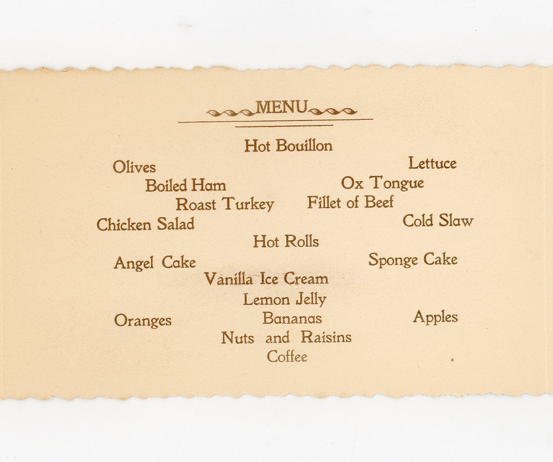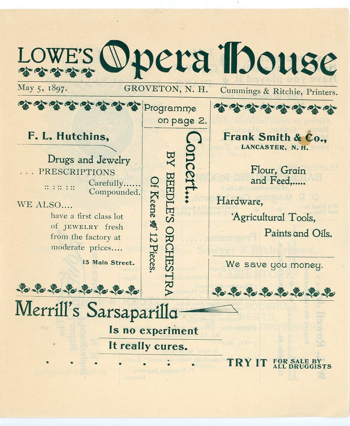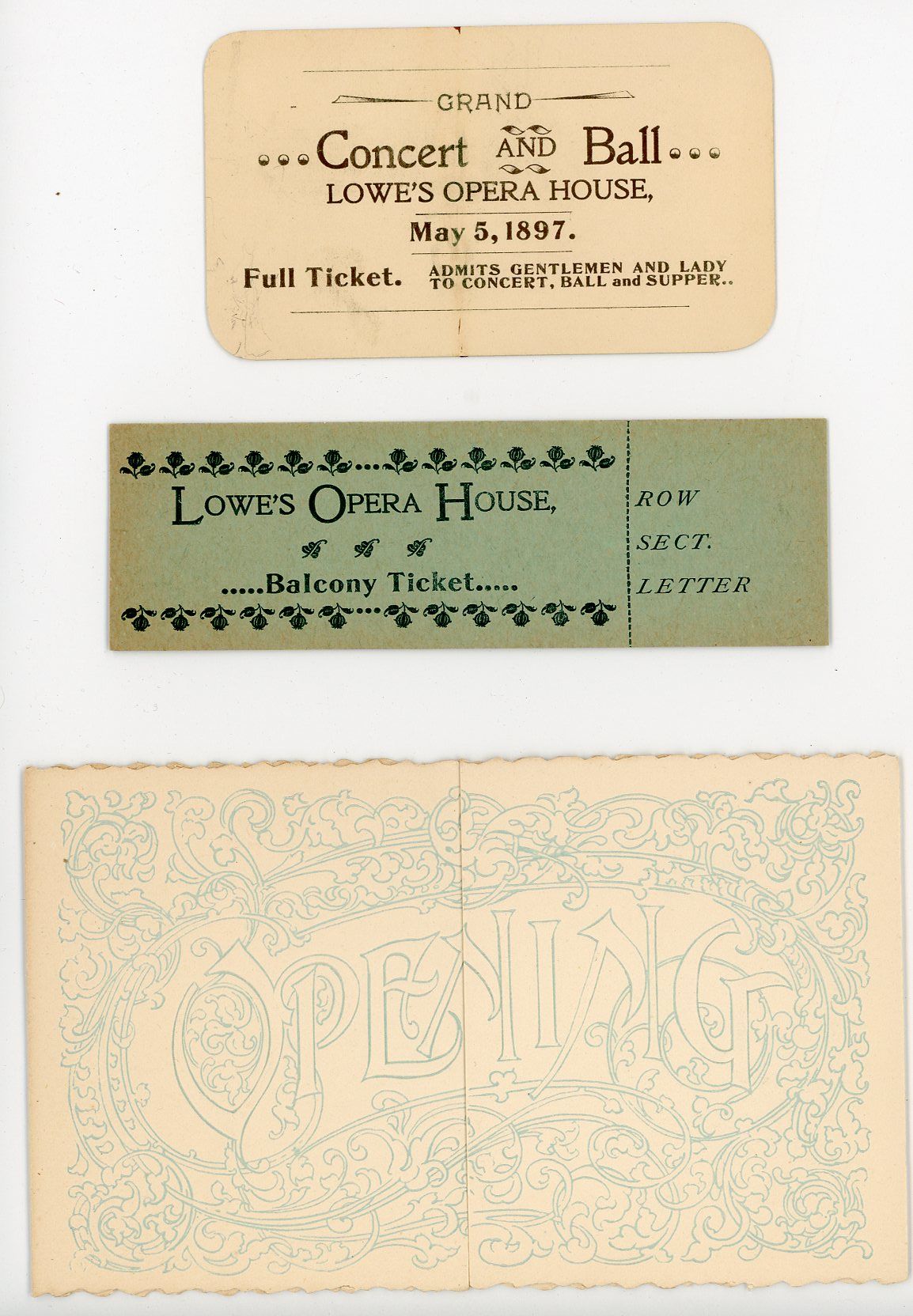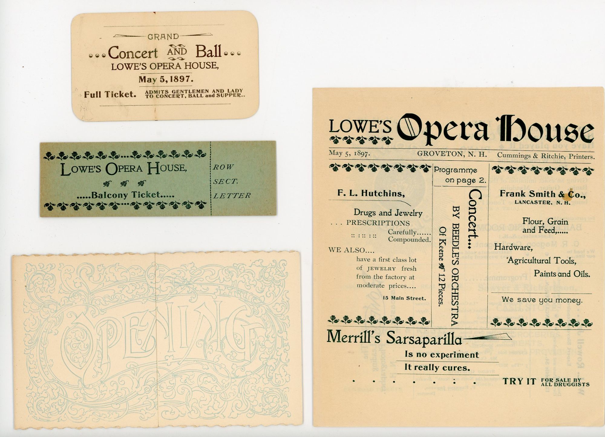 Groveton, NH, 1897. Four (4) pieces of ephemera from the Lowe's Opera House on May 5, 1897. They include a center opening menu with embossed cover reading "opening", fare within. A single-fold program listing the Programme and numerous advertisements. Measures 6 1/2" x 5 1/2". A full ticket for admitting a Gentleman and Lady to Concert, Ball and Supper and a Balcony Ticket.
