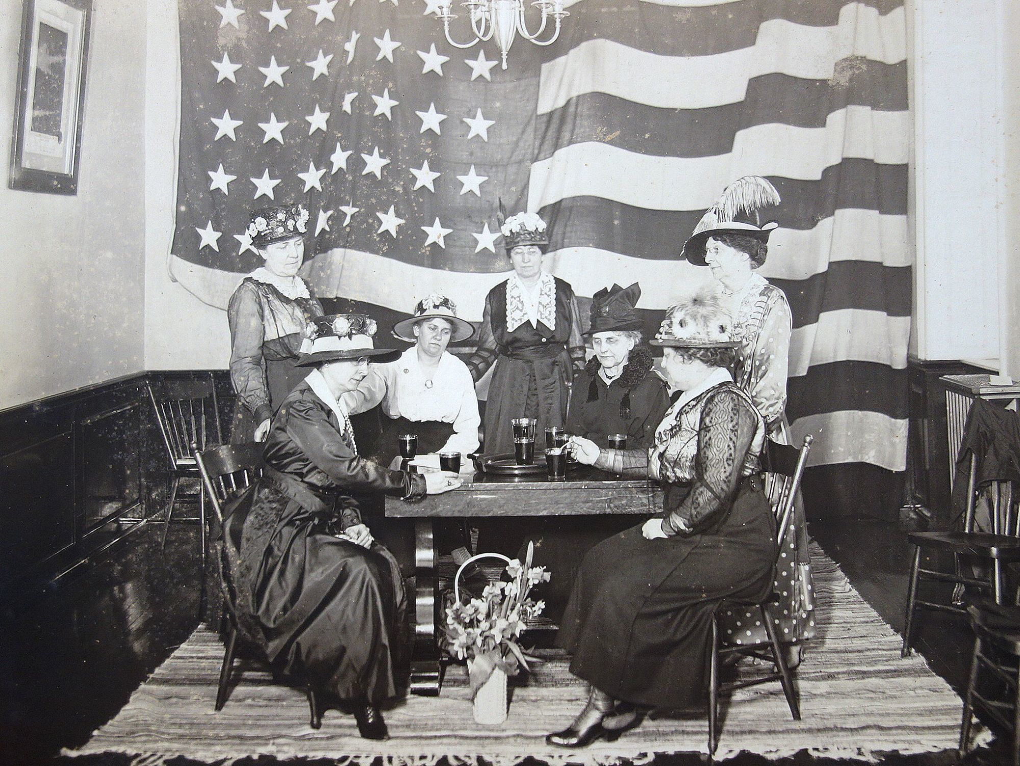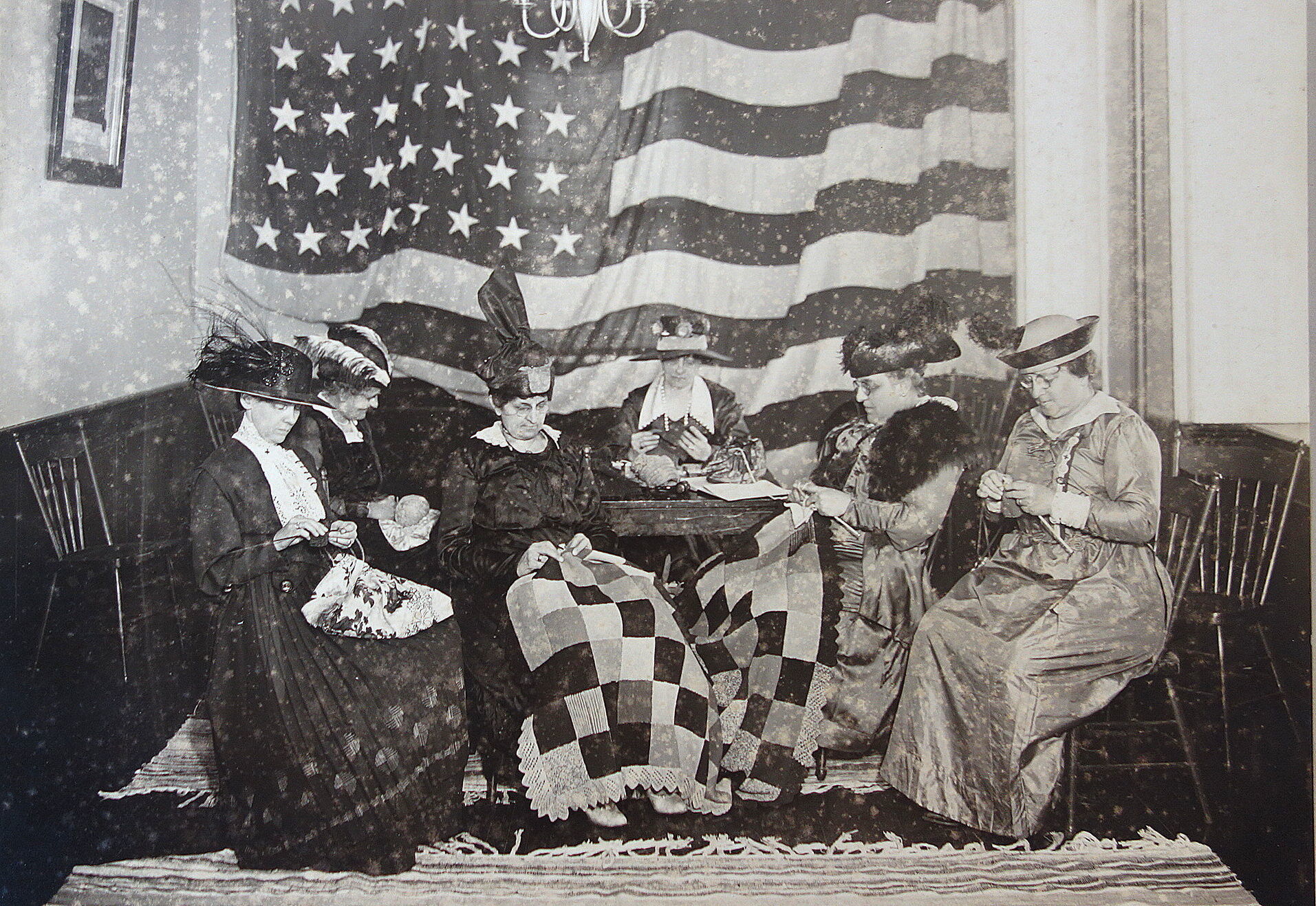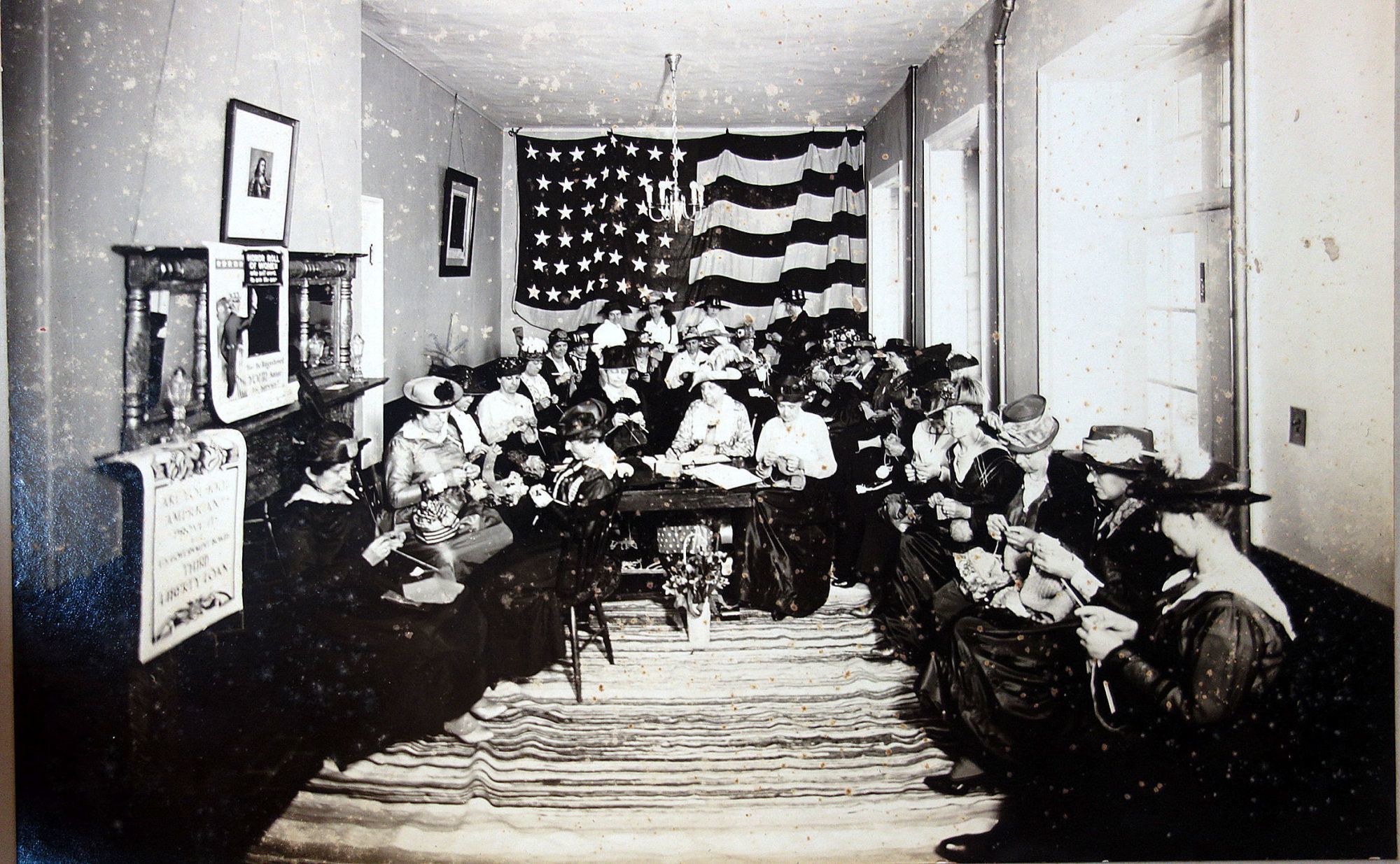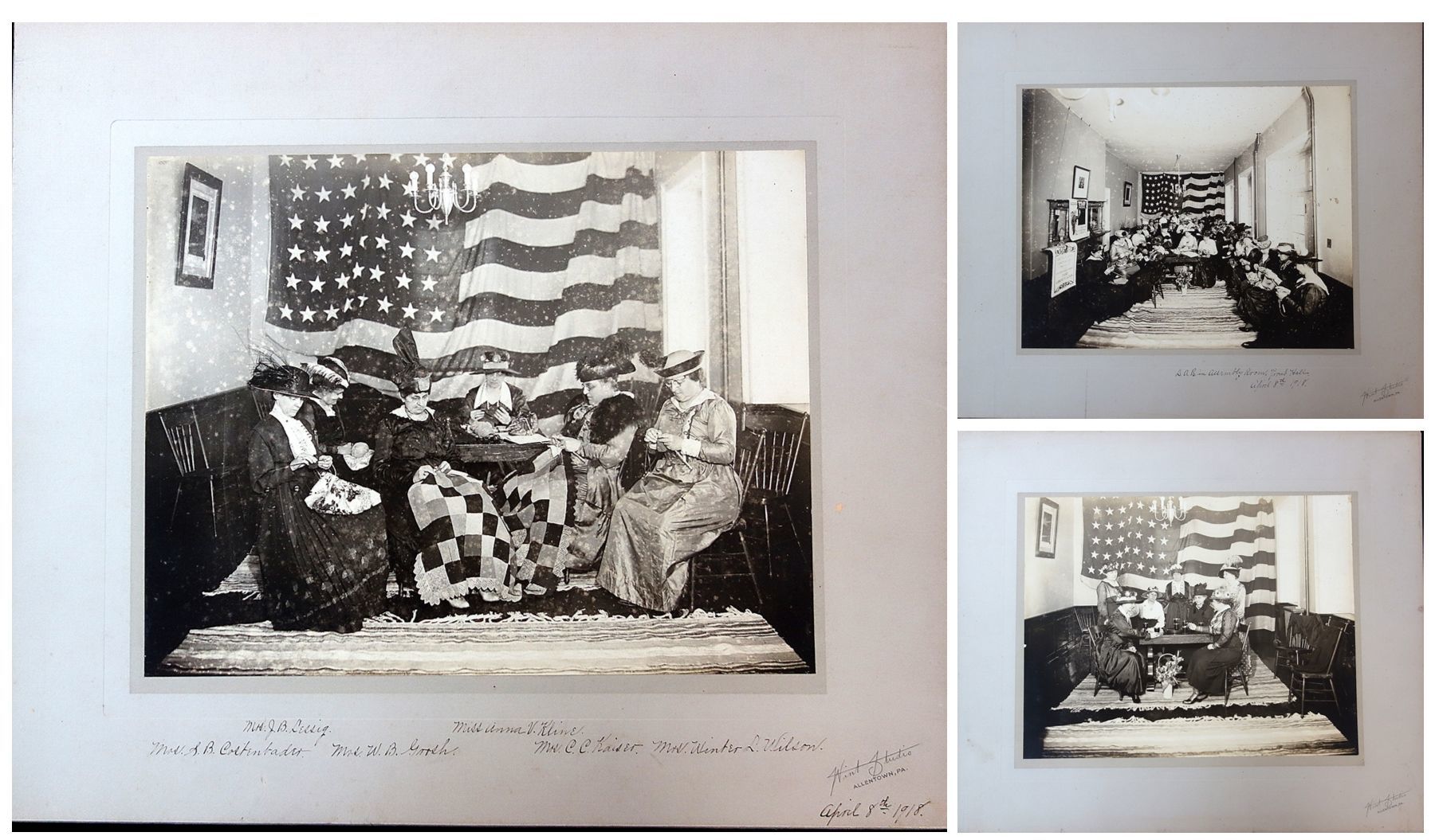 Allentown PA: Wint Studios, 8-Apr-18. Three different 7 3/4" x 9 3/4" photos on larger mounts. The first photo depicts six women seated around a table knitting with a wall size American flag in the background. Each of the women is knitting. The women are identified. The second is the same room with a much larger group of woman and captioned D. A. R. in Assembly Room, Trout Hall, April 8, 1918. Not the posters on the mantel; one an honor roll of women who will work to win the war. The second is "Are You 100% American? Prove It! Buy U.S. Government Bonds. The third photo depicts the first group of woman sipping tea. This was part of the Knitting for Victory campaign were women in America were encouraged to knit socks, scarves and sweaters for the soldiers -- middle and upper-class women were carrying their knitting with them everywhere. Sponsored by the Red Cross. The photo with the group of six women appears in Images of America - Allentown, Bartholomew and Front. 2002.