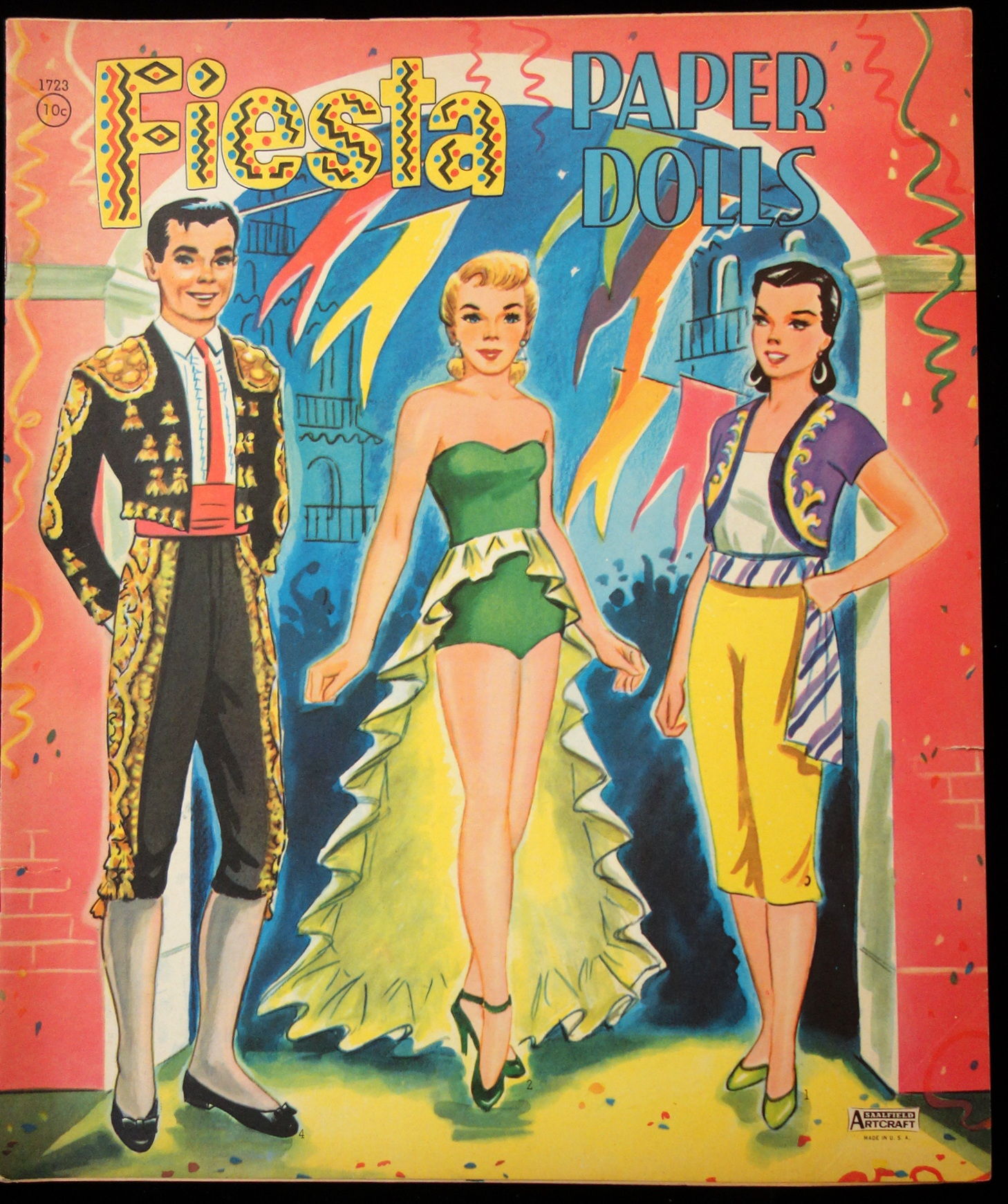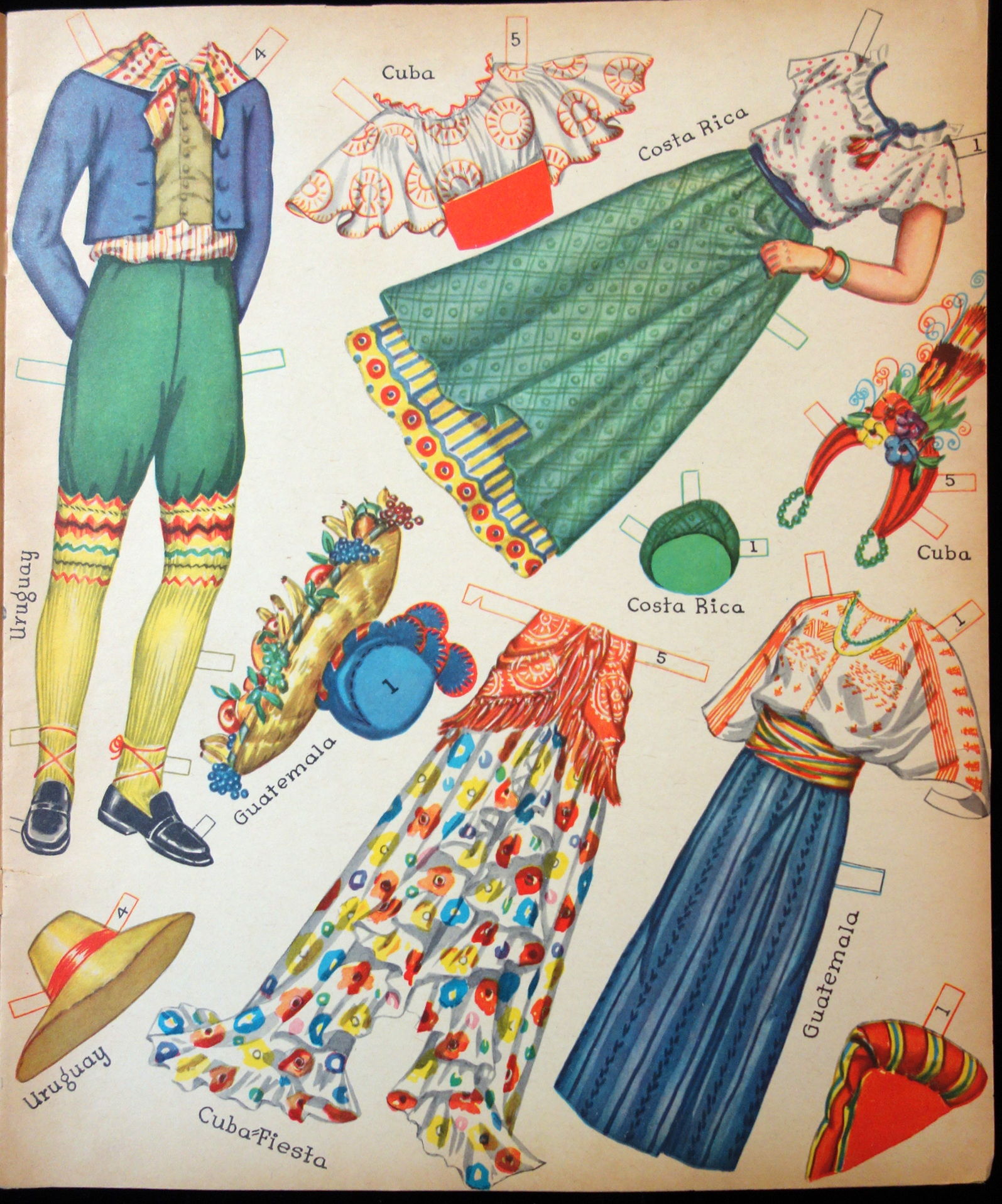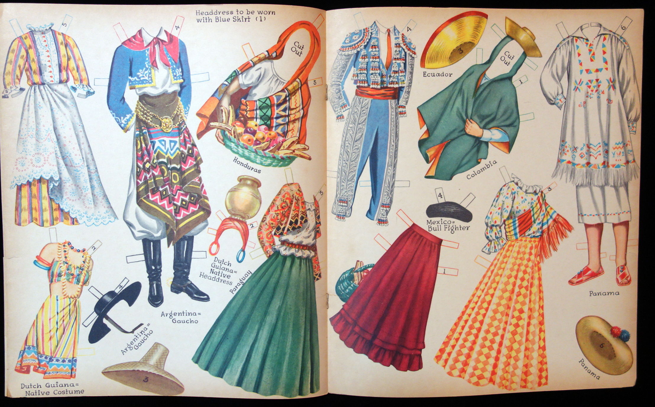 USA: Saalfield, ArtCraft, No. 1723, 1960. A 12 1/2" x 10 1/2" book with six (6) paper dolls to cut out from the the covers. Each is dressed in Hispanic influenced attire. Includes four (4) pages of festive traditional costumes to cut for the dolls. Each garment is labeled with the country of origin. The countries include Uruguay, Guatemala, Cuba, Costa Rica, Honduras, Argentina, Dutch Guiana, Paraguay, Ecuador, Columbia, panama, Mexico, Peru, Chili and Bolivia,