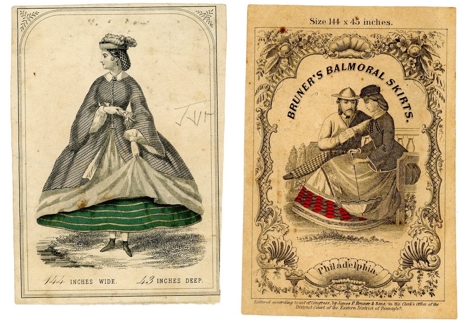 Philadelphia, PA, c 1860. The balmoral petticoat was a coloured petticoat that was intended to show at the hem of a drawn-up skirt for walking and sportswear in the 1860s and 1870s. The balmoral petticoat could be worn over a hoopskirt or crinoline or have hoops built into the petticoat, and (according to some sources) include a horsehair stiffener as part of the petticoat itself. The most common Balmoral petticoat was red wool, often with 2-4 black stripes running around the hem. Later in the 1860s there are mentions of balmoral petticoats in plaid or striped wool, and even cotton balmoral petticoats in the Americas. The balmoral petticoat was most popular at the height of the crinoline era, but quickly became a victim of its own popularity and practicality. Fashion has never loved sensible garments, and balmoral petticoats were eminently sensible: warm, durable, easy to walk and move in. They were adopted by all levels of society almost immediately (there are numerous mentions of slaves in the American South wearing balmoral petticoats in the 1860s), and quickly discarded by the upper levels of society. A variant of the Balmoral petticoat (sans hooping) remained popular with older women and the less fashionable for decades after the crinoline was discarded. As a result ‘red flannel petticoat’ became synonymous with provincial fashion and the elderly. - Source: Dreamstress.com. Two (2) different approximately 5 1/2" x 3 3/4" fabric labels for balmoral skirts, worn over crinoline or hoop skirts. The fabric was printed in bright colors and intended to be exposed beneath the outer skirt. The first advertises Bruner's Balmoral Skirts of Philadelphia and depicts a courting couple. The fabric was 144 x 45 inches. The second depicts an elegant woman lifting her skirt to expose her balmoral skirt. 144 x 43 inches. Both black and white litho with the only color being the exposed balmoral. Reverse is blank.