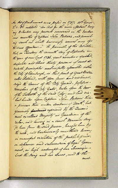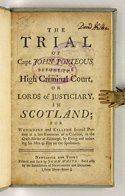 1736. Newcastle upon Tyne, [1736]. Newcastle upon Tyne, [1736]. Early Account of a Famous Scottish Murder Trial, This Copy Includes Two Pages of Contemporary Manuscript Notes [Trial]. Porteous, John [1695-1736], Defendant. The Trial of Capt. John Porteous, Before the High Criminal Court, Or Lords of Justiciary, In Scotland; For Wounding and Killing Several Persons at a Late Execution of a Criminal, In the Grass-Market at Edinburgh, By Firing and Ordering his Men to Fire on the Spectators. Newcastle upon Tyne: Printed by John White, [1736]. 32 pp. Octavo (8-1/8" x 5-7/8"). Stab-stitched pamphlet and two manuscript leaves in contemporary hand bound into later library cloth, calf lettering piece and paper shelf label to spine. Light soiling, some fading to spine, chipping to edges of lettering piece. Light browning to text, some soiling, library inkstamps and early owner signature (David Hilton) to title page, library marks to verso. $1,500. * This appears to be a reissue of an account published the same year in Edinburgh. Porteous was convicted of murder and sentenced to be hanged after soldiers under his command accidentally killed six people while trying to control a mob during an execution. Under pressure from Prime Minister Walpole, his execution was deferred pending further investigation. Angered at what was perceived as English interference, a mob dragged Porteous from prison and lynched him. More than a murder case, this was a highly charged referendum on Scottish autonomy. The events surrounding this case are treated in the early chapters of Sir Walter Scott's novel The Heart of Mid-Lothian (1818). The carefully written manuscript notes appear to have been laid into this pamphlet. It discusses a 1737 Act of Parliament calling for the punishment of the people who lynched Porteous. No print copies located on OCLC. English Short-Title Catalogue T174154.