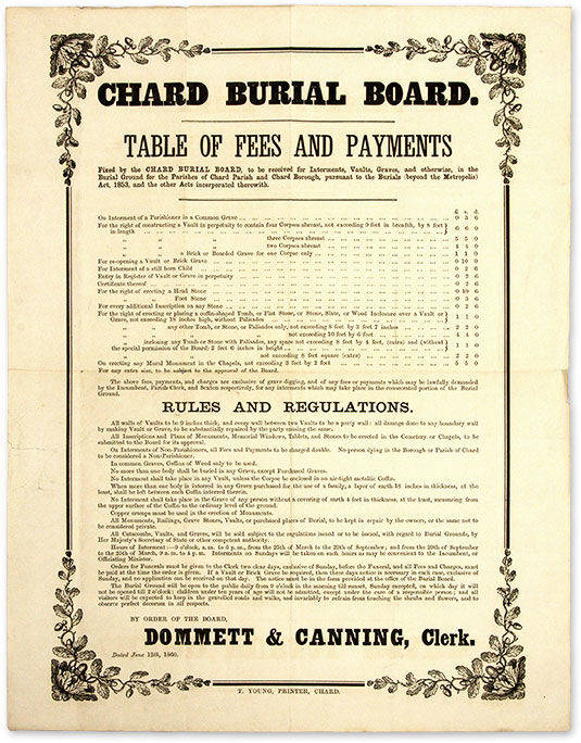 1850. Fees and Regulations Established by the Burial Board of Chard, Somerset [Broadside]. [Funerals]. Chard Burial Board. Table of Fees and Payments Fixed by the Chard Burial Board, To be Received for Interments, Vaults, Graves, And Otherwise, In the Burial Ground for the Parishes of Chard Parish and Chard Borough, Pursuant to the Burials (Beyond the Metropolis) Act, 1853, And Other Acts Incorporated Therewith. Chard: T. Young, Printer, 1860. 20" x 14-3/4" broadside. Text in single column below headline within woodcut border. Light toning, faint vertical and horizontal fold lines, some wear and a few minor chips and tears to edges. $350. * Chard is a town and a civil parish in Somerset. The fees range from 3s2d for burial in a common grave to 5?5s for a plot with an "extra size mural monument." The broadside lists rules and regulations regarding funerals, burials and places of burial (graves, vaults, catacombs). No copies located on COPAC or OCLC.
