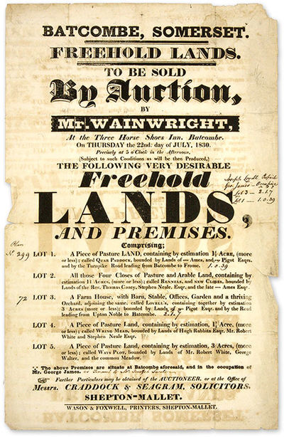 1830. Shepton-Mallet, 1830??. Shepton-Mallet, 1830?? Land for Sale in Somerset [Broadside]. [Land Auction]. [Great Britain]. Batcombe, Somerset. Freehold Lands, To be Sold by Auction, By Mr. Wainwright, At the Three Horse Shoes Inn, Batcombe, On Thursday the 22nd. Day of July, 1830. Shepton-Mallet: Wason & Foxwell, [1830]. 17-3/4" x 11" broadside. Text in single column below headline. Moderate toning, light soiling and a few minor stains, faint vertical and horizontal fold lines, a few minor chips and tears to edges, contemporary annotations to recto and verso. $650. * The lots include pasture land, arable land and a farmstead. Most of the annotations discuss the value of specific lots. The one exception is a note on the verso, most likely for filing purposes, states the nature and date of the auction. No copies located on COPAC or OCLC.