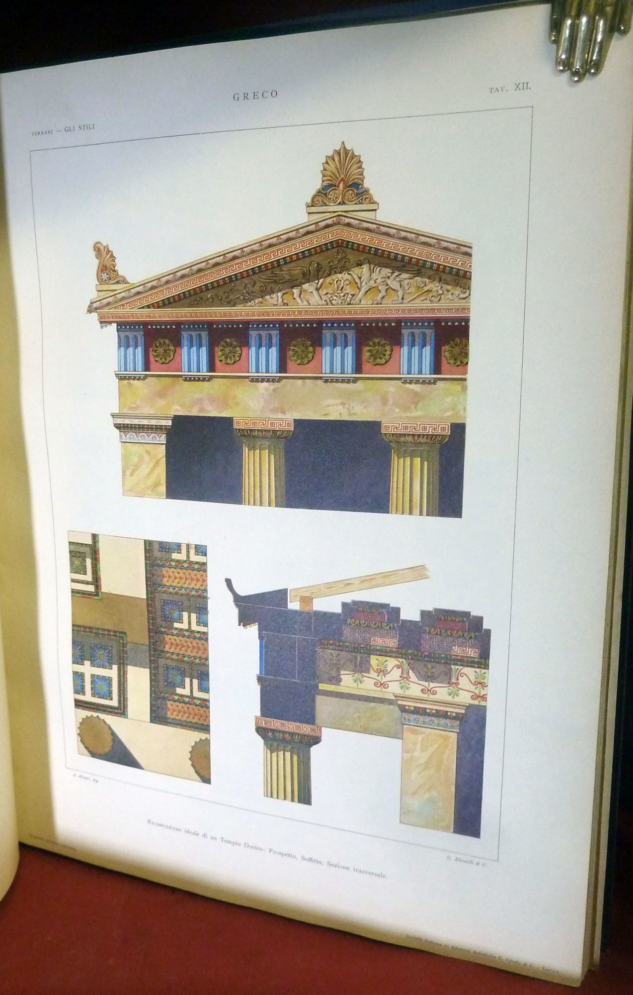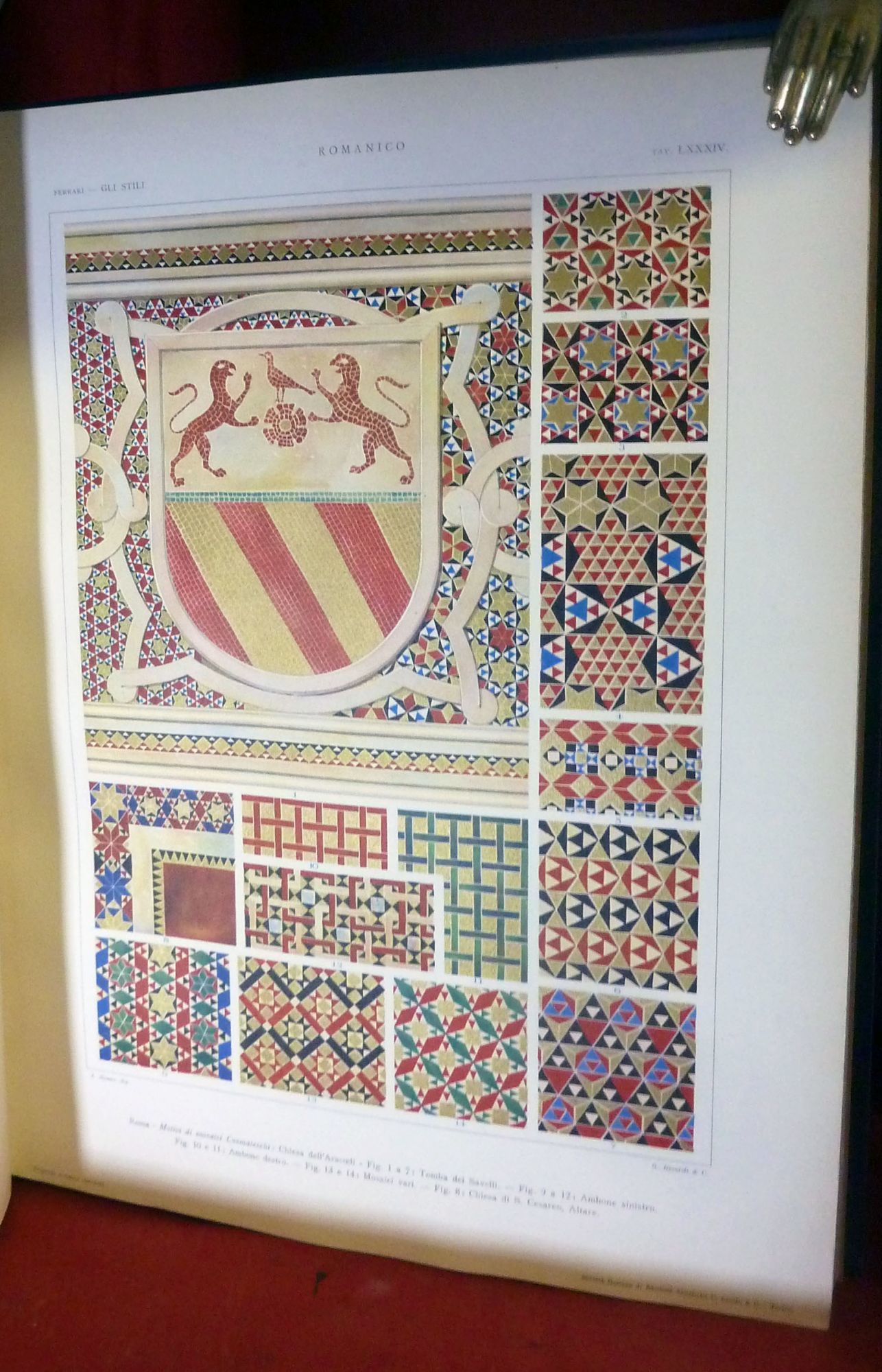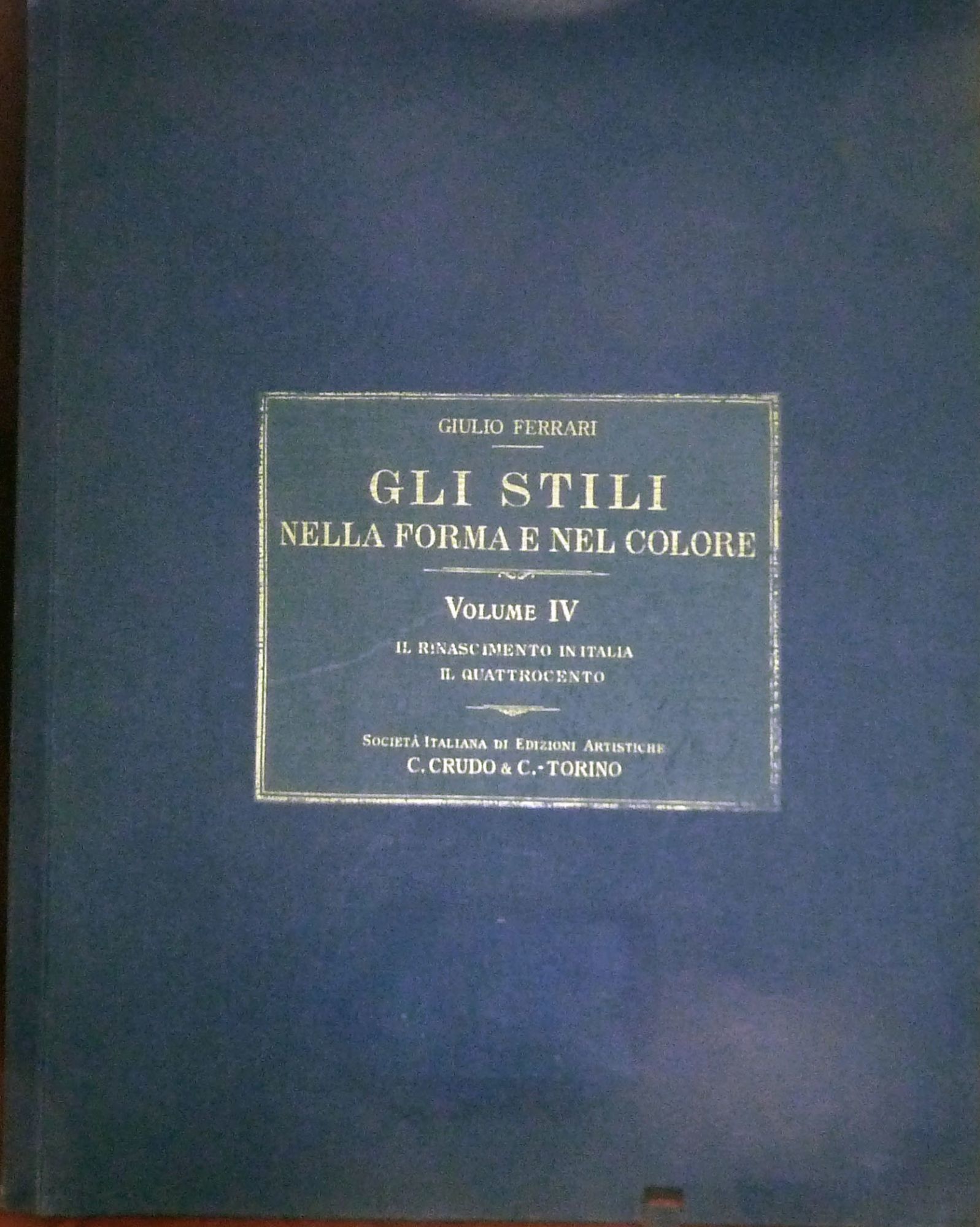 Torino: C. Crudo &C. (Societa Italiana Di Edizioni Artistiche), 1925. First edition. Hardcover. Dark navy cloth with front cover paper labels. Very good. 4 vols. Folio. 43 X 32 cm. Total of 186 plates with 176 in color. Each volume with introductory text in Italian. Coverage of each volume as follows: Vol. I: Egiziano. Caldeo, Assiro, Fenicio, Egeo, Greco, Etrusco, Romano, Estremo Oriente. Vol. II: Cristiano Primitivo, Bizantio, Arabo. Vol. III: Romanico E Gotico In Italia. Vol. IV: Il Rinascimento In Italia, Il Quattrocento. Ex-library; nevertheless, all interior contents very clean and fresh with no marking, all bindings tight and solid.