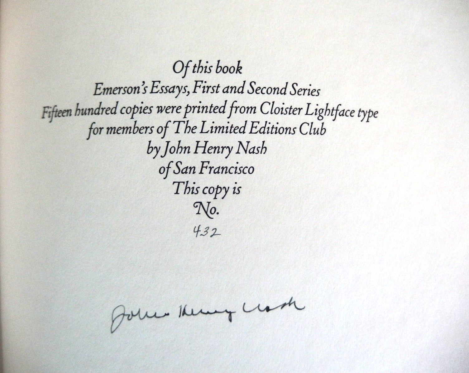 San Francisco: Limited Editions Club, 1934. Hardcover. Upper corners slightly bumped. Near Fine, lacking the slipcase. Folio (9" x 13-1/2") bound in cloth-backed blue paper boards. Contains both the First and the Second Series of Emerson's masterful essays with a critical introduction By Edward F. O'Day. Copy #432 of 1500 beautifully designed, printed in red and black, and bound by John Henry Nash and SIGNED by him on the colophon page. A beautiful presentation of these classic essays.