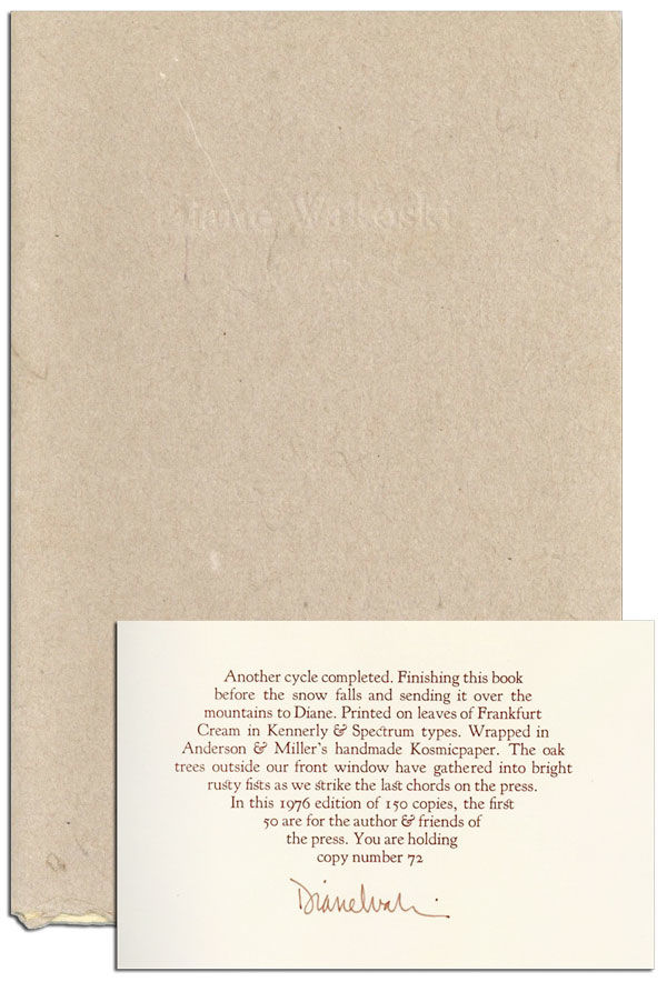 Madison: Red Ozier Press, [1976]. First Edition. Limited to 150 copies of which this is no. 72. Octavo (23.5cm.); plain stitched wrappers in dust jacket of handmade "Kosmicpaper"; [12]pp.; frontispiece and text printed in brown and black. Fine condition. Signed by the author on colophon.