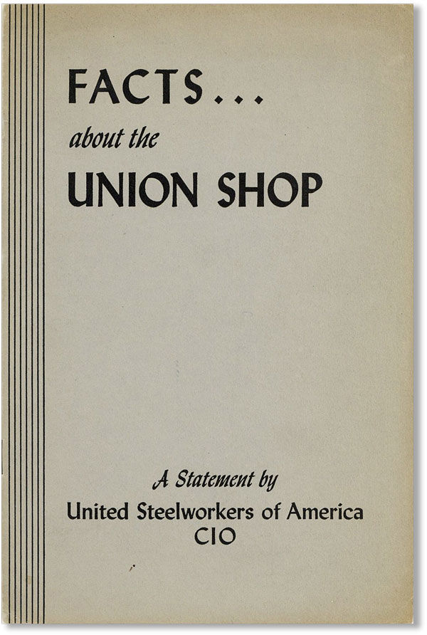 Pittsburgh: United Steelworkers of America, [1951]. 12mo. Staple-bound pamphlet; printed card wrappers; 8pp. Address label on rear wrapper (Abraham Miller, New York City); mild external wear and soil; Very Good. Brief rebuttal by the Steelworkers in response to the anti union-shop campaign of 1951.