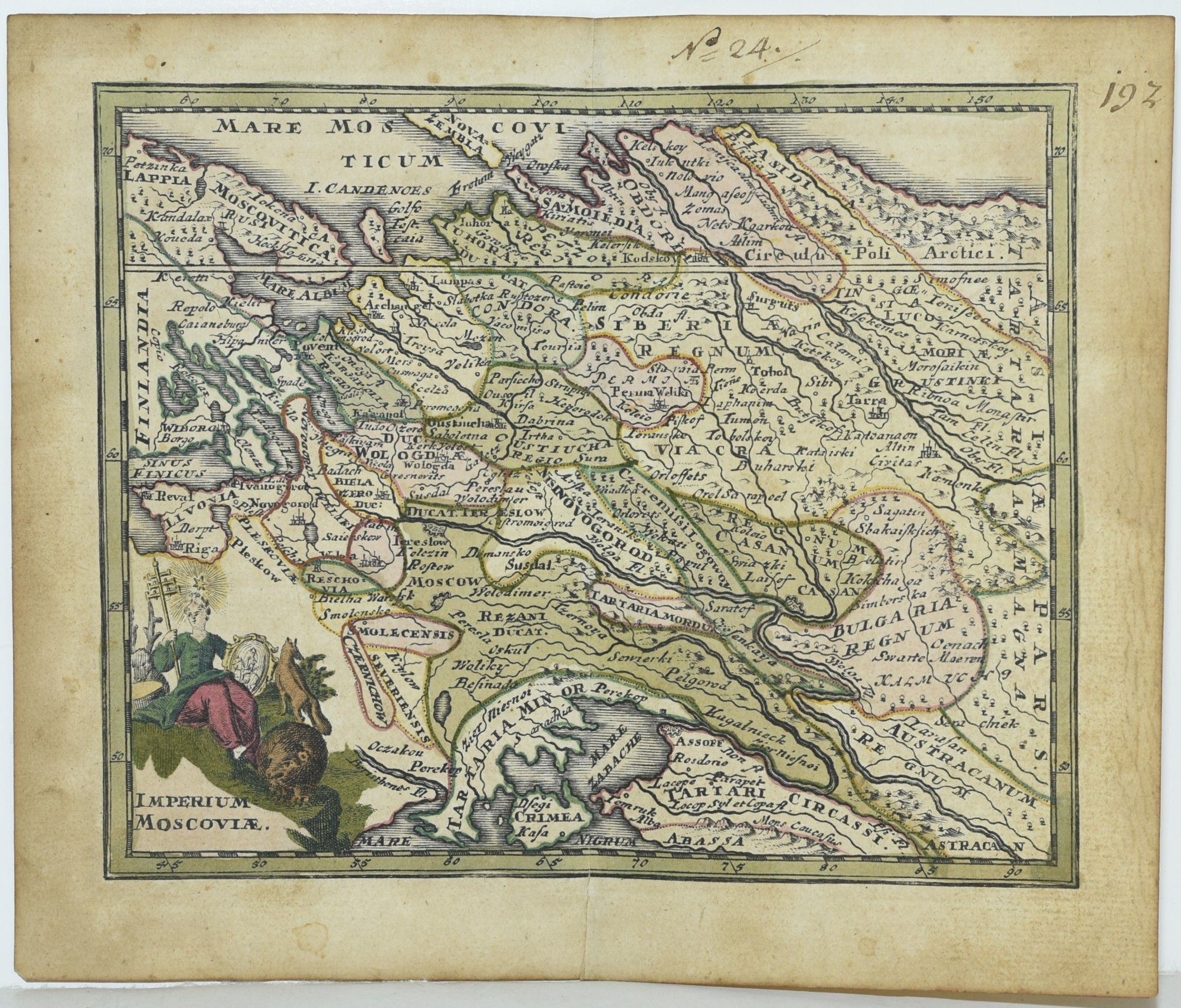 [MAP] IMPERIUM MOSCOVIAE. (ATLAS PORTALIS) [Nürnberg] , 1720 By Johann Cristoph Weigel [Nürnberg], 1720. A hand colored plate of Moscovia, or Eastern Russia, from either the First or Second Edition of Johann Cristoph Weigel's Atlas Portalis. Beginning of separation along the crease. About 20 x 17 cm.