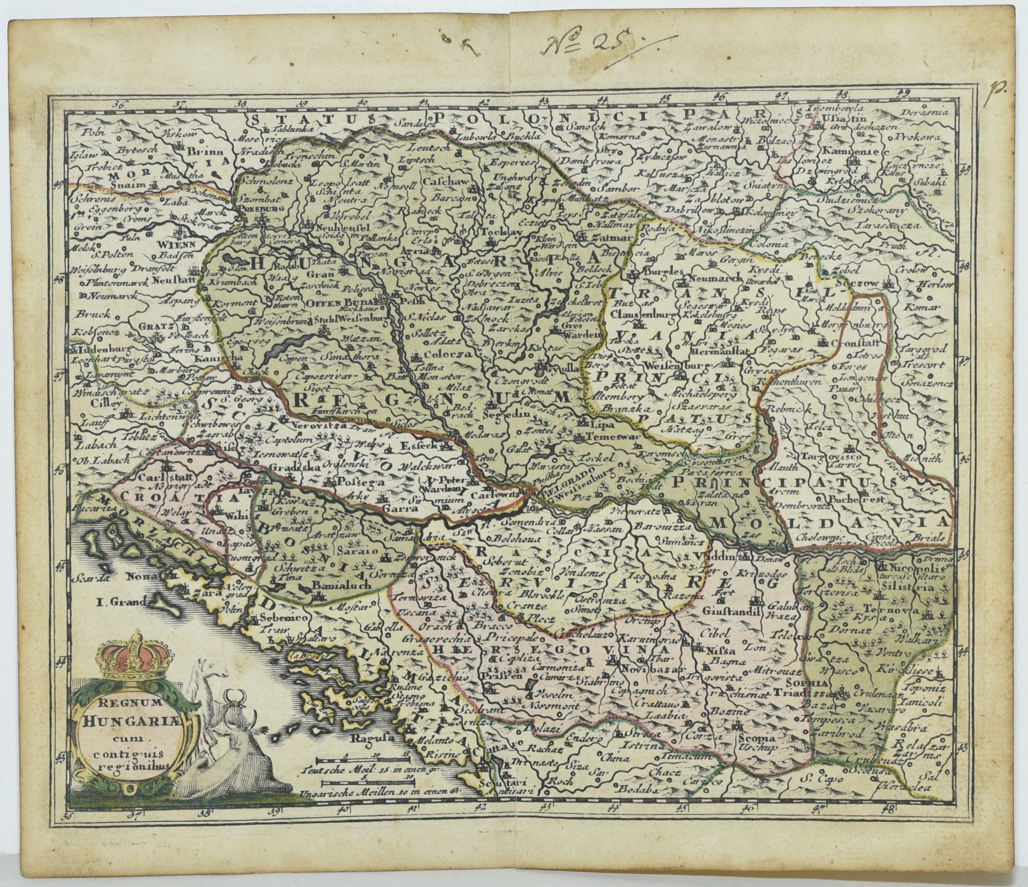 [MAP] REGNUM HUNGARIAE. (ATLAS PORTALIS) [Nürnberg] , 1720 By Johann Cristoph Weigel [Nürnberg], 1720. A hand colored plate of Hungary, from either the First or Second Edition of Johann Cristoph Weigel's Atlas Portalis. Beginning of separation along the crease. About 20 x 17 cm.