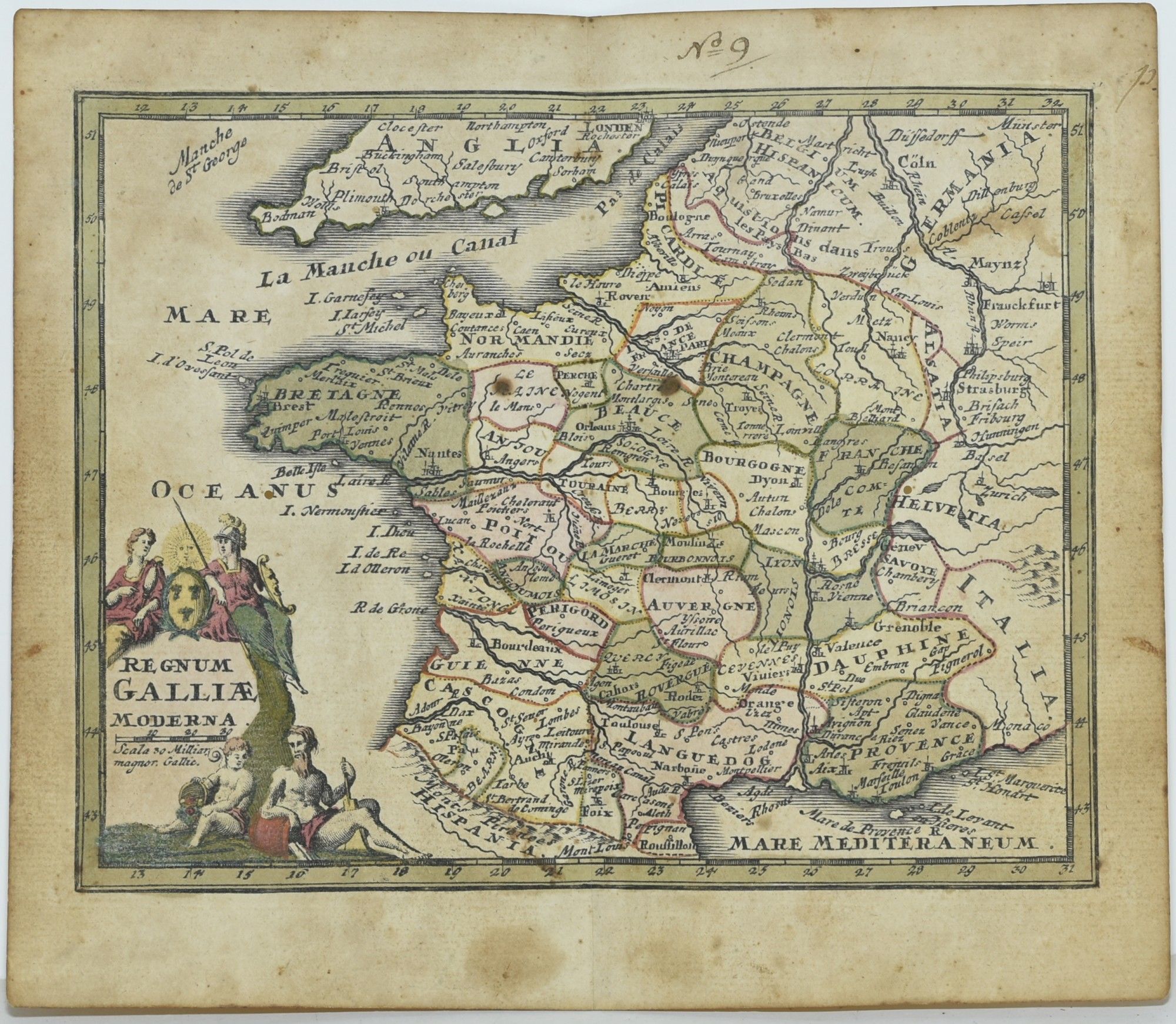 [MAP] REGNUM GALLIAE MODERNA. (ATLAS PORTALIS) [Nürnberg] , 1720 By Johann Cristoph Weigel [Nürnberg], 1720. A hand colored plate of France and its provinces, from either the First or Second Edition of Johann Cristoph Weigel's Atlas Portalis. Two small spots of worming. About 20 x 17 cm.