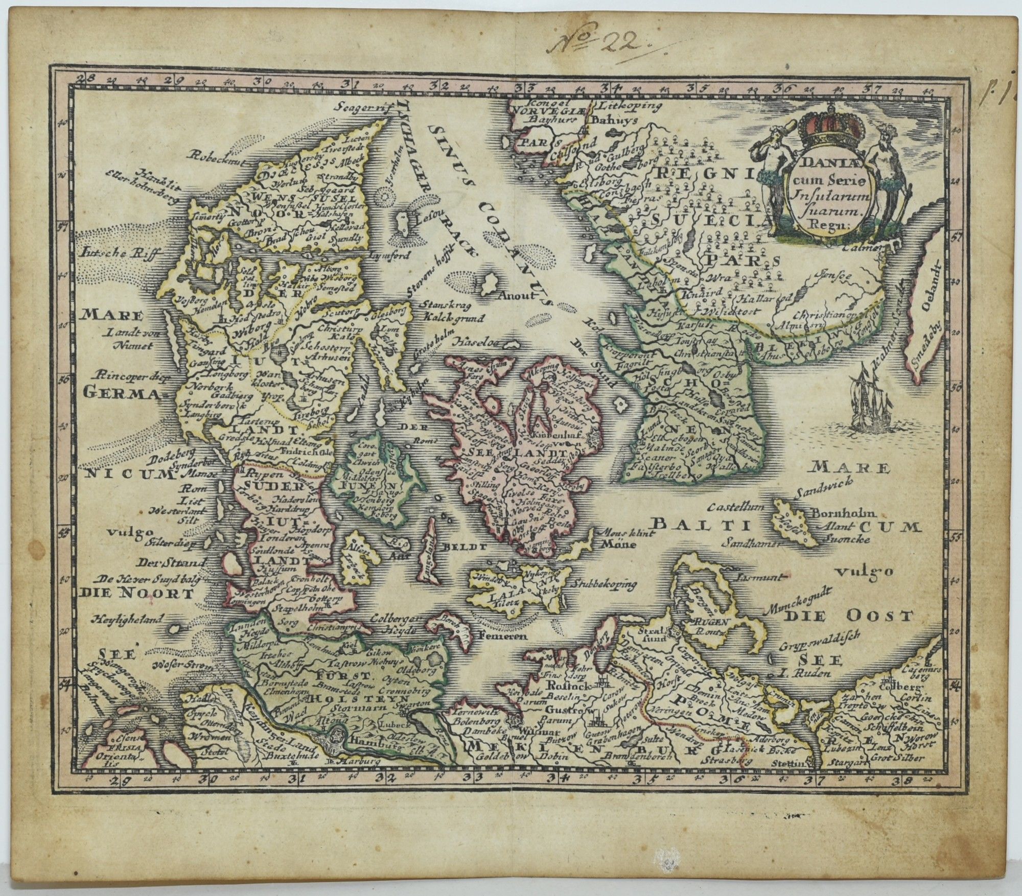 [Nürnberg], 1720. A hand colored plate of Denmark, from either the First or Second Edition of Johann Cristoph Weigel's Atlas Portalis. Beginning of separation along the crease. About 20 x 17 cm.