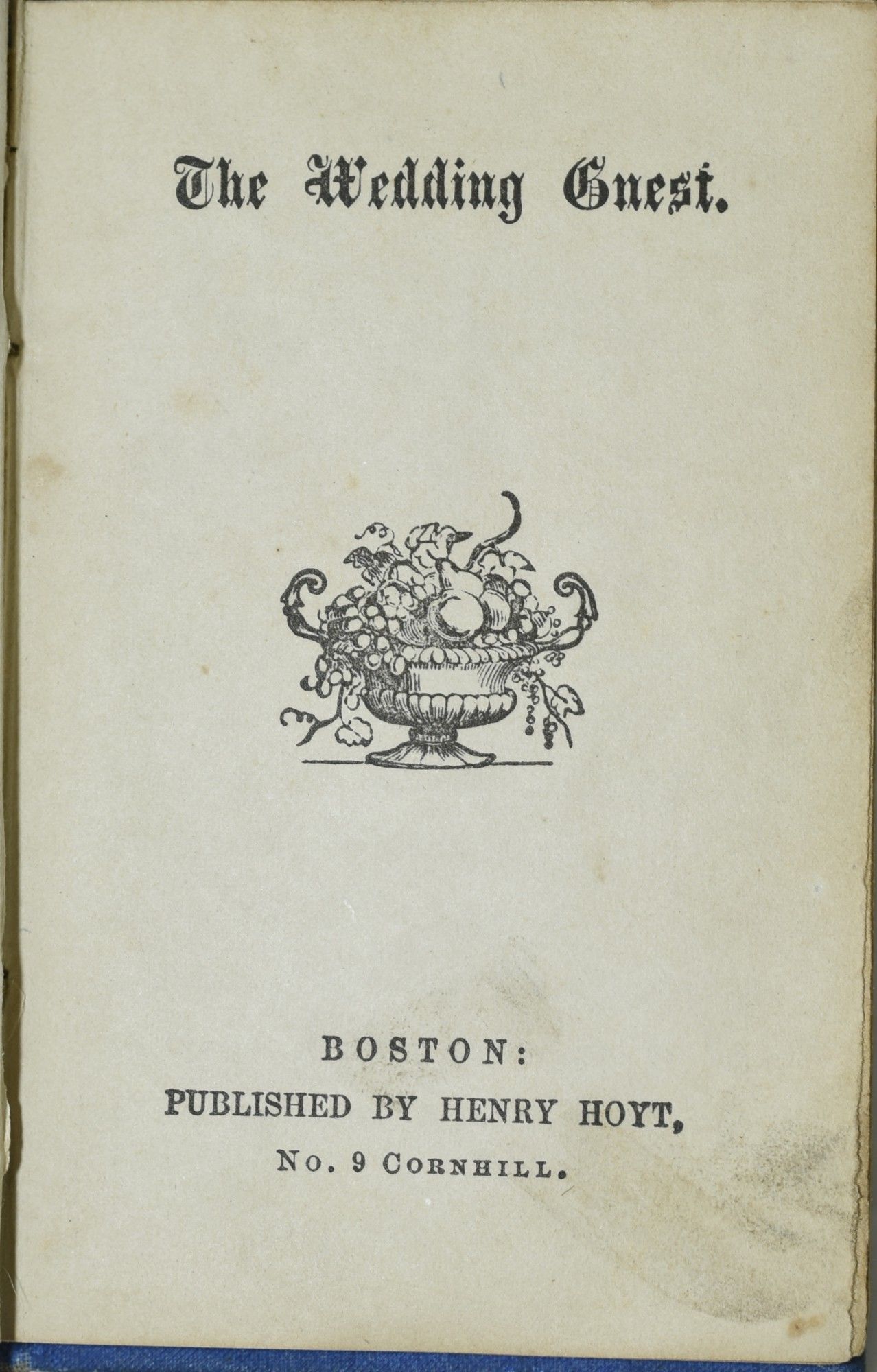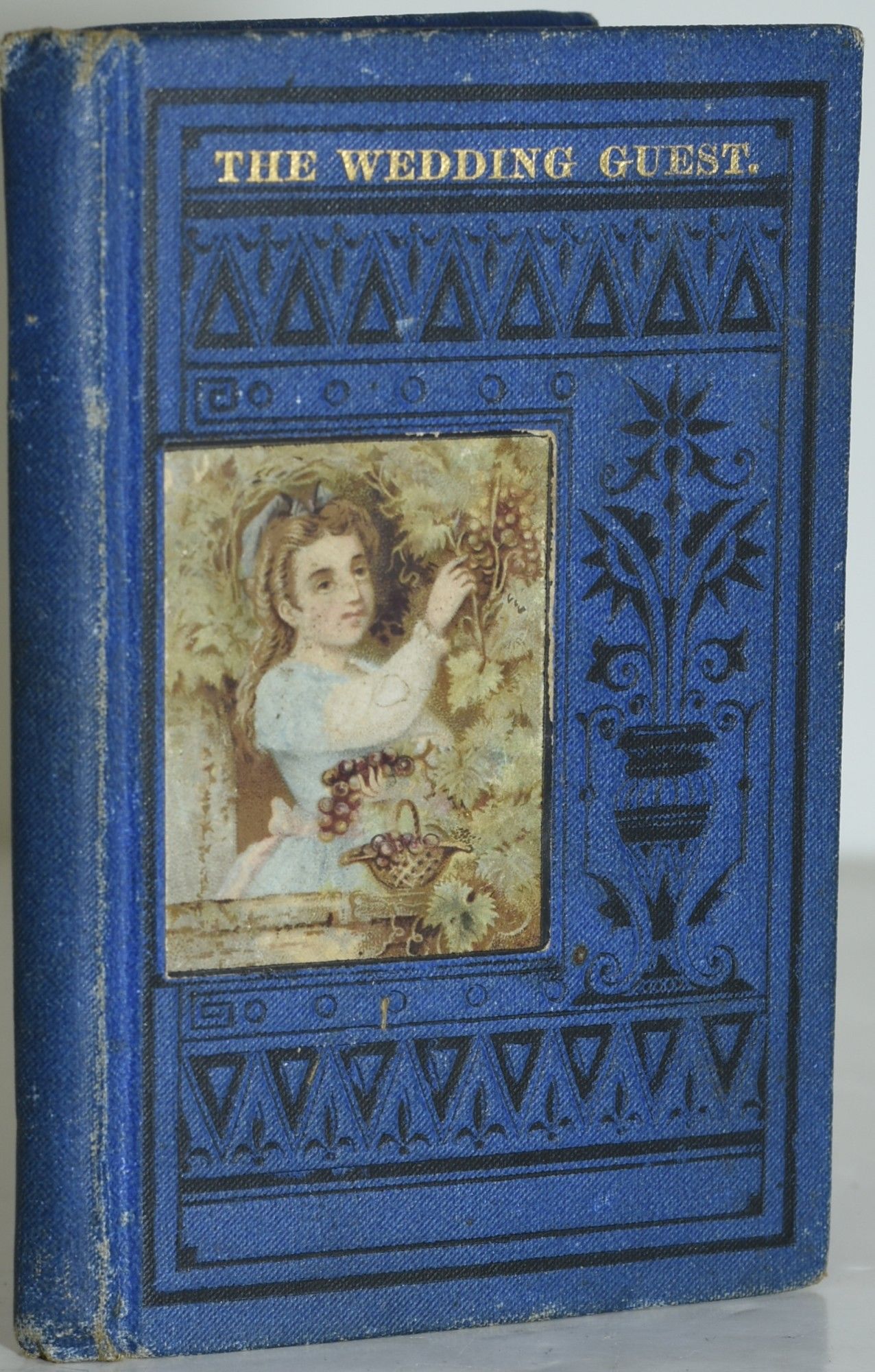 Boston: Henry Hoyt, n.d.. Hard Cover. Very Good binding. A copy of The Wedding Guest, an anonymous children's book, with illustrations throughout. Minor foxing; smudging to the bottom corner of the preliminaries, affecting the title page; previous owner's name in pencil and a blindstamp on the front endpaper and the front flyleaf; binding cocked, with shelfwear. Blue decorated cloth, with a chromolithographic illustration pasted on the front board, lettering in gilt, and decorations in black. 64 pp. 32mo. Uncommon, we find no copies of this edition on OCLC. Very Good binding.