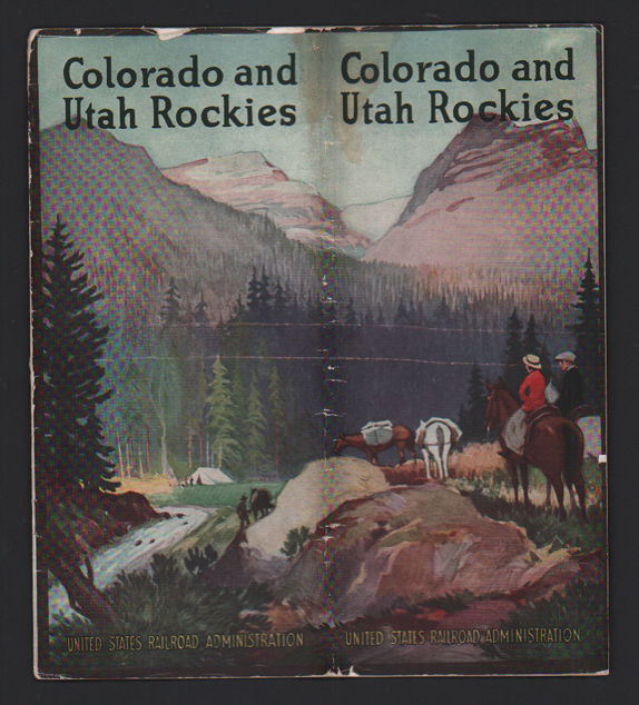 Chicago: United States Railroad Administration; Poole Bros, 1919. Very good. 62pp. Slim octavo [23 cm x 20 cm] with the covers and pages folded once vertically through the center. Saddle stitched pictorial wrappers. The edges of the front wrap are moderately rubbed and chipped, and there are single, light 2 x 1 1/2" stains in the top edges of the front wrap and preliminary pages. Else the pages are clean and free of markings. Contents include America's Playground for Americans: An Appreciation of Colorado and Utah by Edwin L. Sabin.