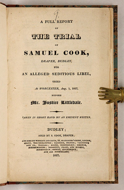 1827. Dudley, 1827. McCoy, Freedom of the Press. Dudley, 1827. McCoy, Freedom of the Press. A Draper is Charged with Seditious Libel for Displaying a Strike Notice in His Shop Window [Trial]. Cook, Samuel [1786-1861], Defendant. A Full Report of the Trial of Samuel Cook, Draper, Dudley, For an Alleged Seditious Libel, Tried at Worcester, Aug. 1, 1827, Before Mr. Justice Littledale. Taken in Short Hand by an Eminent Writer. Dudley [Worcestershire, Eng.]: Sold by S. Cook, Draper, 1827. [ii], 72 pp. Octavo (8-1/4" x 5-1/4"). Stab-stitched pamphlet bound into period-style quarter morocco over marbled boards by Philip Dusel, gilt titles and ornaments to spine, endpapers renewed. Light toning to text, somewhat heavier in places, "4" in early hand to head of title page. $850. * First edition, one of two from 1827. Cook, a linen draper and the "radical conscience of middle-class Dudley," frequently displayed posters promoting various political events and made his business "the focal point of radicalism in the Black Country" (ODNB). In 1826, he was charged with seditious libel for displaying a handbill promoting a nailers' strike that accused government ministers of contributing to the starvation of the people. He was found guilty but received a relatively light sentence of a ?100 fine and a ?200 bond. He published this pamphlet to raise money for his legal expenses. A note at the foot of p. 72 appeals for additional financial assistance: "S. Cook will be happy to receive any Subscriptions towards his late expenses, and towards such subsequent proceedings as may be deemed requisite." A second edition with an identical page count may have been published the same year. OCLC and Library Hub locate 4 copies of both editions, 2 in North America (Duke, Southern Illinois University). Oxford Dictionary of National Biography (accessed online). McCoy, Freedom of the Press (Supplement) IC318.