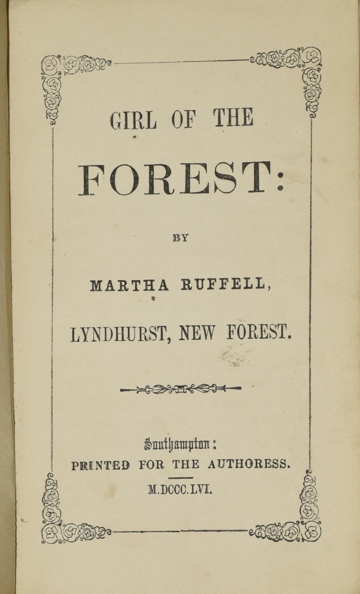 Southampton, 1856. First Edition. Hard Cover. Good binding. A collection of poetry, privately printed for the author, a Martha Ruffel of Lyndhurst, Hampshire. Martha appears to be an inconsequential English lady, who serves as a voice for the commons on their fears surrounding the Crimean War as well as reminiscences of everyday village life. 48 pp. Textblock has been reglued by a conservator; scattered staining to the text. Red silk moire covered flexible boards, with an illustration of a girl stamped in gilt on the front cover. Uncommon, we locate no copies on OCLC. Good binding.